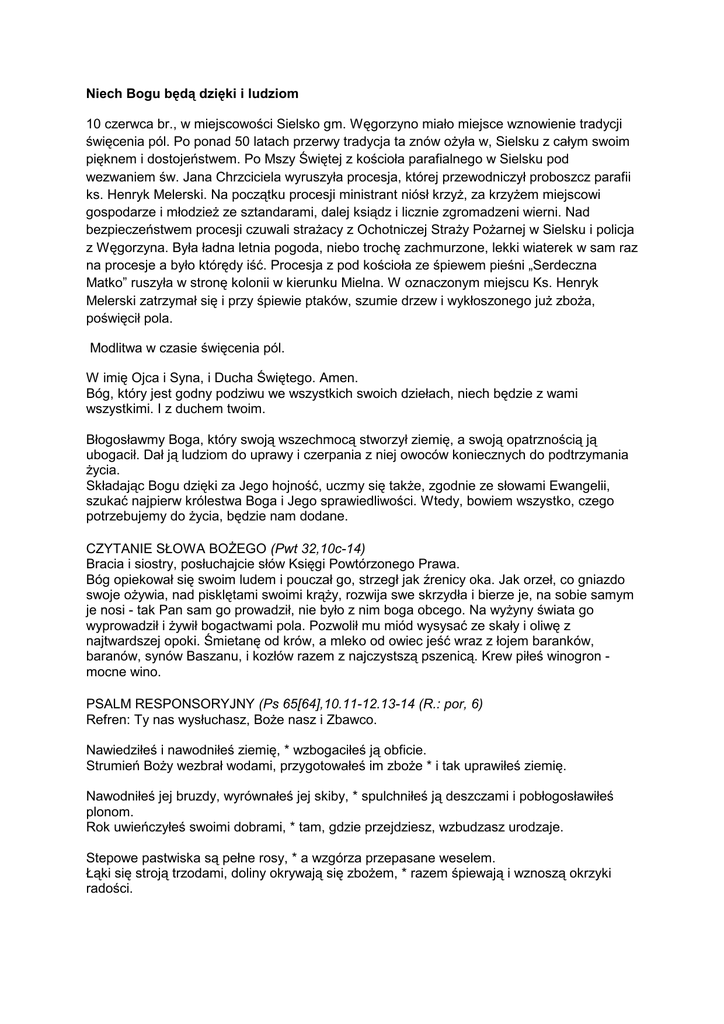 Niech Bogu będą dzięki i ludziom 10 czerwca br., w miejscowości Sielsko gm. Węgorzyno miało miejsce wznowienie tradycji święcenia pól. Po ponad 50 latach przerwy tradycja ta znów ożyła w, Sielsku z całym swoim pięknem i dostojeństwem. Po Mszy Świętej z kościoła parafialnego w Sielsku pod wezwaniem św. Jana Chrzciciela wyruszyła procesja, której przewodniczył proboszcz parafii ks. Henryk Melerski. Na początku procesji ministrant niósł krzyż, za krzyżem miejscowi gospodarze i młodzież ze sztandarami, dalej ksiądz i licznie zgromadzeni wierni. Nad bezpieczeństwem procesji czuwali strażacy z Ochotniczej Straży Pożarnej w Sielsku i policja z Węgorzyna. Była ładna letnia pogoda, niebo trochę zachmurzone, lekki wiaterek w sam raz na procesje a było którędy iść. Procesja z pod kościoła ze śpiewem pieśni „Serdeczna Matko” ruszyła w stronę kolonii w kierunku Mielna. W oznaczonym miejscu Ks. Henryk Melerski zatrzymał się i przy śpiewie ptaków, szumie drzew i wykłoszonego już zboża, poświęcił pola. Modlitwa w czasie święcenia pól. W imię Ojca i Syna, i Ducha Świętego. Amen. Bóg, który jest godny podziwu we wszystkich swoich dziełach, niech będzie z wami wszystkimi. I z duchem twoim. Błogosławmy Boga, który swoją wszechmocą stworzył ziemię, a swoją opatrznością ją ubogacił. Dał ją ludziom do uprawy i czerpania z niej owoców koniecznych do podtrzymania życia. Składając Bogu dzięki za Jego hojność, uczmy się także, zgodnie ze słowami Ewangelii, szukać najpierw królestwa Boga i Jego sprawiedliwości. Wtedy, bowiem wszystko, czego potrzebujemy do życia, będzie nam dodane. CZYTANIE SŁOWA BOŻEGO (Pwt 32,10c-14) Bracia i siostry, posłuchajcie słów Księgi Powtórzonego Prawa. Bóg opiekował się swoim ludem i pouczał go, strzegł jak źrenicy oka. Jak orzeł, co gniazdo swoje ożywia, nad pisklętami swoimi krąży, rozwija swe skrzydła i bierze je, na sobie samym je nosi - tak Pan sam go prowadził, nie było z nim boga obcego. Na wyżyny świata go wyprowadził i żywił bogactwami pola. Pozwolił mu miód wysysać ze skały i oliwę z najtwardszej opoki. Śmietanę od krów, a mleko od owiec jeść wraz z łojem baranków, baranów, synów Baszanu, i kozłów razem z najczystszą pszenicą. Krew piłeś winogron mocne wino. PSALM RESPONSORYJNY (Ps 65[64],10.11-12.13-14 (R.: por, 6) Refren: Ty nas wysłuchasz, Boże nasz i Zbawco. Nawiedziłeś i nawodniłeś ziemię, * wzbogaciłeś ją obficie. Strumień Boży wezbrał wodami, przygotowałeś im zboże * i tak uprawiłeś ziemię. Nawodniłeś jej bruzdy, wyrównałeś jej skiby, * spulchniłeś ją deszczami i pobłogosławiłeś plonom. Rok uwieńczyłeś swoimi dobrami, * tam, gdzie przejdziesz, wzbudzasz urodzaje. Stepowe pastwiska są pełne rosy, * a wzgórza przepasane weselem. Łąki się stroją trzodami, doliny okrywają się zbożem, * razem śpiewają i wznoszą okrzyki radości. EWANGELIA (Mt 6,25-34) Słowa Ewangelii według św. Mateusza. Jezus powiedział do swoich uczniów: Nie troszczcie się zbytnio o swoje życie, o to, co macie jeść i pić, ani o swoje ciało, czym się macie przyodziać. Czyż życie nie znaczy więcej niż pokarm, a ciało więcej niż odzienie? Przypatrzcie się ptakom w powietrzu: nie sieją ani żną i nie zbierają do spichrzów, a Ojciec wasz niebieski je żywi. Czyż wy nie jesteście ważniejsi niż one? Kto z was przy całej swej trosce może choćby jedną chwilę dołożyć do wieku swego życia? A o odzienie czemu się zbytnio troszczycie? Przypatrzcie się liliom na polu, jak rosną: nie pracują ani przędą. A powiadam wam: nawet Salomon w całym swoim przepychu nie był tak ubrany jak jedna z nich. Jeśli więc ziele na polu, które dziś jest, a jutro do pieca będzie wrzucone, Bóg tak przyodziewa, to czyż nie tym bardziej was, małej wiary? Nie troszczcie się więc zbytnio i nie mówcie:, co będziemy jeść? co będziemy pić? czym będziemy się przyodziewać? Bo o to wszystko poganie zabiegają. Przecież Ojciec wasz niebieski wie, że tego wszystkiego potrzebujecie. Starajcie się naprzód o królestwo Boga i o Jego sprawiedliwość, a to wszystko będzie wam dodane. Nie troszczcie się, więc zbytnio o jutro, bo jutrzejszy dzień sam o siebie troszczyć się będzie. Dosyć ma dzień swojej biedy. PROŚBY Bóg, troskliwy Ojciec, łaskawie spogląda na wszystkie swoje dzieci. Karmi je i otacza opieką, błogosławi ziemię, aby przynosiła owoce konieczne do podtrzymania ludzkiego życia. Z dziecięcą pokorą wołajmy do Niego: Wysłuchaj nas, Panie. Ty przez usta świętego Pawła Apostoła nazwałeś nas swoją uprawną rolą * spraw, abyśmy we wszystkich sprawach wypełniali Twoją wolę i zawsze byli z Tobą zjednoczeni. Ty nas pouczyłeś, że Chrystus jest winnym krzewem, a my Jego latoroślami * spraw, abyśmy trwając w Twoim Synu, przynosili owoc obfity. Ty błogosławisz ziemię i napełniasz ją obfitością plonów * swoim błogosławieństwem spraw, aby nasze pola wydały pożywienie, którego potrzebujemy. Ty rozmnażasz pszenicę i dajesz nam ją na chleb codzienny i jako dar do sprawowania Eucharystii * daj nam rosę z nieba i użyźniaj ziemię, aby wydała obfite plony. Ty żywisz ptaki powietrzne i odziewasz lilie polne * naucz nas nie troszczyć się zbytnio o pożywienie i ubranie, ale szukać najpierw Twojego królestwa i jego sprawiedliwości. MODLITWA BŁOGOSŁAWIEŃSTWA Boże, Ty na początku świata w swojej opatrzności nakazałeś, aby ziemia wydała rośliny zielone, rodzące wszelkie owoce. Ty dajesz nasienie siewcy i chleba dostarczasz na pożywienie. Spraw, prosimy, niech ta ziemia, wielorako ubogacona Twoją hojnością i uprawiana pracą rąk ludzkich; rodzi obfite owoce. Niech Twój lud obdarzony dobrami, które od Ciebie pochodzą, chwali Ciebie teraz i na wieki. Przez Chrystusa, Pana naszego. Amen. ZAKOŃCZENIE OBRZĘDU Bóg, który jest źr