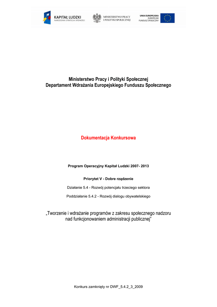 Ministerstwo Pracy i Polityki Społecznej Departament Wdrażania Europejskiego Funduszu Społecznego Dokumentacja Konkursowa Program Operacyjny Kapitał Ludzki 2007- 2013 Priorytet V - Dobre rządzenie Działanie 5.4 - Rozwój potencjału trzeciego sektora Poddziałanie 5.4.2 - Rozwój dialogu obywatelskiego „Tworzenie i wdrażanie programów z zakresu społecznego nadzoru nad funkcjonowaniem administracji publicznej” Konkurs zamknięty nr DWF_5.4.2_3_2009 1. Podstawy prawne Regulacje wspólnotowe: rozporządzenie Rady (WE) nr 1083/2006 z dnia 11 lipca 2006 r. ustanawiające przepisy ogólne dotyczące Europejskiego Funduszu Rozwoju Regionalnego, Europejskiego Funduszu Społecznego oraz Funduszu Spójności i uchylające rozporządzenie (WE) nr 1260/1999 (Dz. U. UE z dnia 31 lipca 2006 r., L 210/25); rozporządzenie Komisji (WE) nr 1828/2006 z dnia 8 grudnia 2006 r. ustanawiające zasady wdrażania rozporządzenia Rady (WE) nr 1083/2006 z dnia 11 lipca 2006 r. ustanawiającego przepisy ogólne dotyczące Europejskiego Funduszu Rozwoju Regionalnego, Europejskiego Funduszu Społecznego oraz Funduszu Spójności i uchylającego rozporządzenie (WE) nr 1260/1999 (Dz. U. UE z dnia 27 grudnia 2006 r., L 371/1); rozporządzenie Parlamentu Europejskiego i Rady (WE) nr 1081/2006 z dnia 5 lipca 2006 r. w sprawie Europejskiego Funduszu Społecznego i uchylające rozporządzenie (WE) nr 1784/1999 (Dz. U. UE z dnia 31 lipca 2006 r., L 210/12); Regulacje krajowe: ustawa z dnia 24 kwietnia 2003 r. o działalności pożytku publicznego i o wolontariacie (Dz.U. Nr 96, poz. 873 z późn. zm); ustawa z dnia 29 stycznia 2004 r. prawo zamówień publicznych (Dz.U.04 19.177 z późn. zm.); ustawa z dnia 6 grudnia 2006 r. o zasadach prowadzenia polityki rozwoju (Dz. U. Nr 227, poz. 1658 z późn. zm.); ustawa z dnia 7 listopada 2008 r. o zmianie niektórych ustaw w związku z wdrażaniem funduszy strukturalnych i Funduszu Spójności (Dz.U. Nr 216 poz. 1370); rozporządzenie Ministra Rozwoju Regionalnego z dnia 7 września 2007 r. w sprawie wydatków związanych z realizacją programów operacyjnych (Dz.U. Nr 175, poz. 1232 z późn. zm); rozporządzenie Ministra Rozwoju Regionalnego z dnia 21 maja 2007 r. w sprawie ekspertów powoływanych w celu rzetelnej i bezstronnej oceny projektów realizowanych w ramach programów operacyjnych (Dz. U. Nr 93, poz. 626 z 29.05.2007 r.) Program Operacyjny Kapitał Ludzki (PO KL), zaakceptowany przez Radę Ministrów w dniu 7 września 2007 r. i Komisję Europejską w dniu 28 września 2007 r.; Szczegółowy opis priorytetów Programu Operacyjnego Kapitał Ludzki wydany przez Ministra Rozwoju Regionalnego; System Realizacji Programu Operacyjnego Kapitał Ludzki 2007-2013; Wytyczne Ministra Rozwoju Regionalnego z dnia 19 września 2008 r. w zakresie kwalifikowania wydatków w ramach Programu Operacyjnego Kapitał Ludzki; Wytyczne Ministra Rozwoju Regionalnego z dnia 19 września 2008 r. w zakresie procedury odwoławczej dla wszystkich programów operacyjnych. Wersja 02-2009 1 2. Informacje ogólne 2.1 Kto organizuje konkurs Konkurs ogłasza Departament Wdrażania Europejskiego Funduszu Społecznego (DWF) w Ministerstwie Pracy i Polityki Społecznej, zwany dalej Instytucją Organizującą Konkurs (IOK), który pełni rolę Instytucji Wdrażającej (Instytucji Pośredniczącej II stopnia) dla Działania 5.4 „Rozwój potencjału trzeciego sektora” Programu Operacyjnego Kapitał Ludzki 2007 – 2013 (PO KL). DWF pełni rolę Instytucji Wdrażającej także dla Działania 5.5 „Rozwój dialogu społecznego” Priorytetu V PO KL. Jednocześnie, DWF jest Instytucją Pośredniczącą (IP) dla Priorytetu I „Zatrudnienie i integracja społeczna” i Priorytetu II „Rozwój zasobów ludzkich i potencjału adaptacyjnego przedsiębiorstw oraz poprawa stanu zdrowia osób pracujących” PO KL. 2.2 Numer konkursu Numer konkursu to: DWF_5.4.2_3_2009 Tytuł konkursu: „Tworzenie i wdrażanie programów z zakresu społecznego nadzoru nad funkcjonowaniem administracji publicznej”. Kwota środków przeznaczona na dofinansowanie projektów w ramach konkursu: ogółem: 15 000 000 PLN w tym środki pochodzące z EFS: 12 750 000 PLN w tym środki budżetu państwa: 2 250 000 PLN Powyższa alokacja finansowa obejmuje rezerwę finansową w wysokości 5% wartości konkursu z przeznaczeniem na ewentualne odwołania projektodawców oraz ewentualne zwiększenia wartości projektów w toku negocjacji. 2.3 Przedmiot konkursu Konkurs realizowany jest w ramach Działania 5.4 PO KL „Rozwój potencjału trzeciego sektora”, Poddziałanie 5.4.2 „Rozwój dialogu obywatelskiego”. Przedmiotem konkursu są projekty mające na celu tworzenie i wdrażanie programów z zakresu społecznego nadzoru nad funkcjonowaniem administracji publicznej. Konkurs ma charakter zamknięty. Minimalna wartość projektu to 50 000 PLN. Maksymalna wartość projektu to 1 000 000 PLN w przypadku projektów realizowanych powyżej 12 miesięcy lub 200 000 PLN w przypadku projektów realizowanych do 12 miesięcy. Nabór wniosków o dofinansowanie realizacji projektów będzie prowadzony przez IOK od 16 lutego 2009 r. do 31 marca 2009 r. Wnioski złożone po terminie zamknięcia konkursu nie będą rozpatrywane. Decyduje data wpływu wniosku do Instytucji Organizującej Konkurs. Wersja 02-2009 2 3. Zasady udzielania dofinansowania 3.1 Kto może ubiegać się o dofinansowanie Wnioskodawcami mogą być: a) podmioty wskazane w art. 3 ust. 2 ustawy z dnia 24 kwietnia 2003 r. o działalności pożytku publicznego i o wolontariacie (DZ. U. Nr 96, poz. 873 z późn. zm.) od co najmniej 24 miesięcy zarejestrowane oraz prowadzące działalność w sferze pożytku publicznego. b) osoby prawne, jednostki organizacyjne działające na podstawie przepisów o stosunku państwa do Kościoła Katolickiego w Rzeczypospolitej Polskiej, o stosunku państwa do innych kościołów i związków wyznaniowych oraz o gwarancjach wolności sumi