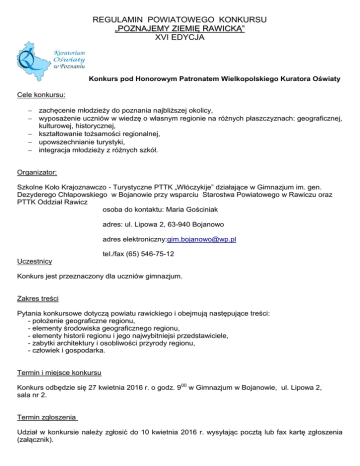 REGULAMIN POWIATOWEGO KONKURSU „POZNAJEMY ZIEMIĘ RAWICKĄ” XVI EDYCJA Konkurs pod Honorowym Patronatem Wielkopolskiego Kuratora Oświaty Cele konkursu: zachęcenie młodzieży do poznania najbliższej okolicy, wyposażenie uczniów w wiedzę o własnym regionie na różnych płaszczyznach: geograficznej, kulturowej, historycznej, kształtowanie tożsamości regionalnej, upowszechnianie turystyki, integracja młodzieży z różnych szkół. Organizator: Szkolne Koło Krajoznawczo - Turystyczne PTTK „Włóczykije” działające w Gimnazjum im. gen. Dezyderego Chłapowskiego w Bojanowie przy wsparciu Starostwa Powiatowego w Rawiczu oraz PTTK Oddział Rawicz osoba do kontaktu: Maria Gościniak adres: ul. Lipowa 2, 63-940 Bojanowo adres elektroniczny:[email protected] tel./fax (65) 546-75-12 Uczestnicy Konkurs jest przeznaczony dla uczniów gimnazjum. Zakres treści Pytania konkursowe dotyczą powiatu rawickiego i obejmują następujące treści: - położenie geograficzne regionu, - elementy środowiska geograficznego regionu, - elementy historii regionu i jego najwybitniejsi przedstawiciele, - zabytki architektury i osobliwości przyrody regionu, - człowiek i gospodarka. Termin i miejsce konkursu Konkurs odbędzie się 27 kwietnia 2016 r. o godz. 900 w Gimnazjum w Bojanowie, ul. Lipowa 2, sala nr 2. Termin zgłoszenia Udział w konkursie należy zgłosić do 10 kwietnia 2016 r. wysyłając pocztą lub fax kartę zgłoszenia (załącznik). Przebieg konkursu 1. Eliminacje szkolne przeprowadza każda szkoła w sposób przez siebie przyjęty. Szkołę reprezentują w konkursie maksymalnie dwie 2-osobowe drużyny. 2. Nauczyciel odpowiedzialny za przebieg konkursu na etapie szkolnym zgłasza organizatorowi w wyznaczonym terminie skład drużyn. Podczas finału konkursu drużyny udzielają odpowiedzi zespołowo. 4. Za wykonane zadania drużyny otrzymują punkty. Punkty przydziela komisja konkursowa. W skład komisji konkursowej wchodzą przedstawiciele Starostwa Powiatowego w Rawiczu, rawickiego oddziału PTTK oraz Miejskiej Biblioteki Publicznej w Bojanowie. 5. Wszelkie wątpliwości rozstrzyga komisja konkursowa w dniu konkursu, do momentu ogłoszenia wyników. 6. Drużyny za zajęcie pierwszego, drugiego i trzeciego miejsca otrzymują nagrody, natomiast wszyscy uczestnicy finału wyróżnienia w postaci dyplomów. 7. Uczestnicy konkursu i ich opiekunowie otrzymują pamiątkową plakietkę i poczęstunek. 8. W ramach konkursu odbywa się wycieczka po regionie. Opiekunowie uczniów są zobowiązani do posiadania pisemnych zgód rodziców na udział ich dzieci w tej wycieczce. 9. Udział w konkursie jest bezpłatny. Załącznik pieczątka szkoły KARTA ZGŁOSZENIA POWIATOWY KONKURS „POZNAJEMY ZIEMIĘ RAWICKĄ” XV edycja 29 kwietnia 2015 r. Nazwa i adres szkoły: ......................................................................................................................... ......................................................................................................................... ................................................................................................... Składy drużyn biorących udział w konkursie (imię i nazwisko): Drużyna: 1. ............................................................................................................... 2. ............................................................................................................... Drużyna: 1. .............................................................................................................................. 2. ............................................................................................................................. Imię i nazwisko nauczyciela: ................................................................................................................. .................................... PODPIS NAUCZYCIELA ...................................... PODPIS DYREKTORA GIMNAZJUM