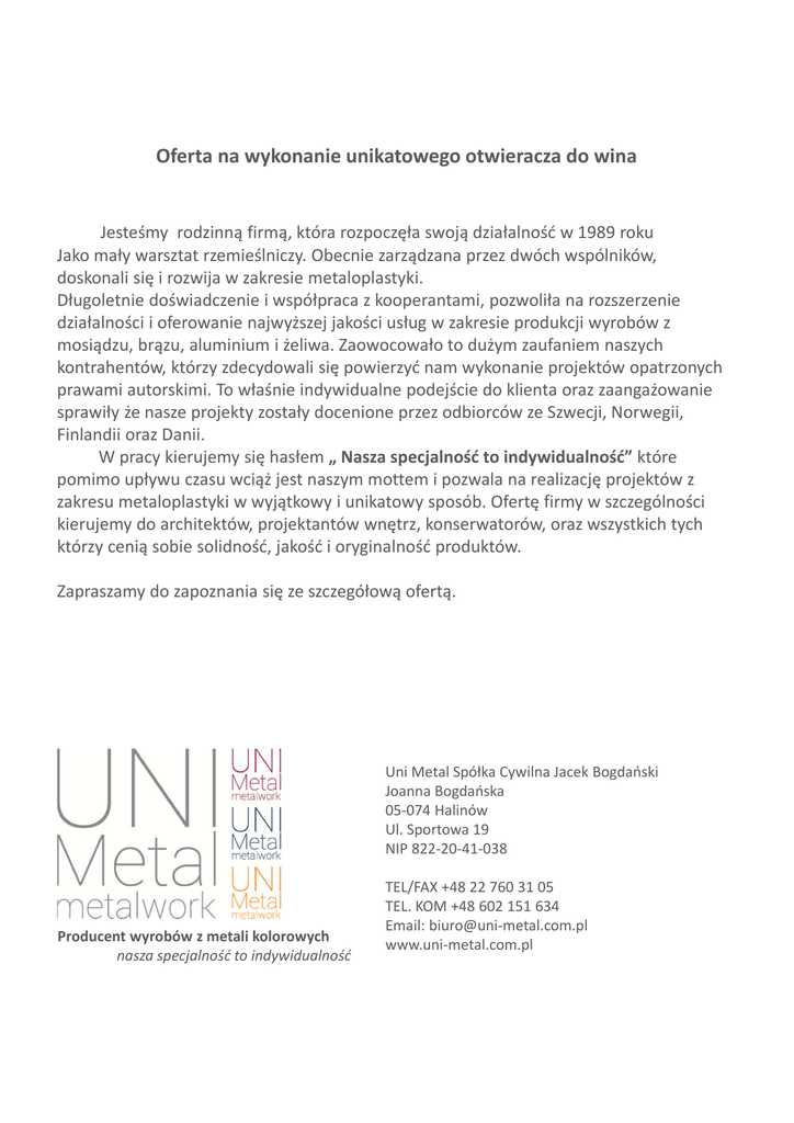 Oferta na wykonanie unikatowego otwieracza do wina Jesteśmy rodzinną firmą, która rozpoczęła swoją działalność w 1989 roku Jako mały warsztat rzemieślniczy. Obecnie zarządzana przez dwóch wspólników, doskonali się i rozwija w zakresie metaloplastyki. Długoletnie doświadczenie i współpraca z kooperantami, pozwoliła na rozszerzenie działalności i oferowanie najwyższej jakości usług w zakresie produkcji wyrobów z mosiądzu, brązu, aluminium i żeliwa. Zaowocowało to dużym zaufaniem naszych kontrahentów, którzy zdecydowali się powierzyć nam wykonanie projektów opatrzonych prawami autorskimi. To właśnie indywidualne podejście do klienta oraz zaangażowanie sprawiły że nasze projekty zostały docenione przez odbiorców ze Szwecji, Norwegii, Finlandii oraz Danii. W pracy kierujemy się hasłem „ Nasza specjalność to indywidualność” które pomimo upływu czasu wciąż jest naszym mottem i pozwala na realizację projektów z zakresu metaloplastyki w wyjątkowy i unikatowy sposób. Ofertę firmy w szczególności kierujemy do architektów, projektantów wnętrz, konserwatorów, oraz wszystkich tych którzy cenią sobie solidność, jakość i oryginalność produktów. Zapraszamy do zapoznania się ze szczegółową ofertą. Uni Metal Spółka Cywilna Jacek Bogdański Joanna Bogdańska 05‐074 Halinów Ul. Sportowa 19 NIP 822‐20‐41‐038 Producent wyrobów z metali kolorowych nasza specjalność to indywidualność TEL/FAX +48 22 760 31 05 TEL. KOM +48 602 151 634 Email: biuro@uni‐metal.com.pl www.uni‐metal.com.pl Informacje o produkcie‐ wiszący otwieracz do wina Wino to niezwykły trunek który zazwyczaj podawany jest w szczególnych okazjach w wyjątkowym towarzystwie. Hasło którym kierujemy się w pracy „nasza specjalność to indywidualność” pomaga nam tworzyć produkty które będą podkreślały charakter takich chwil i nadawały im niecodzienną oprawę. Dlatego w naszej ofercie znajduje się unikatowy otwieracz do wina. Wykonany jest z mosiądzu oraz bukowego drewna, występuje w kilku odmianach pokrycia metalu oraz kolorach drewna. To niezwykły produkt który doda wyrazu każdemu ze spotkań jak również dzięki swej wyjątkowej formie będzie eleganckim wykończeniem każdej kuchni czy winiarni. Zestaw: mosiądz patynowany, drewno bukowe w kolorze „palisander” Zestaw: nikiel szczotkowany, drewno bukowe w kolorze „szary”. Zestaw: nikiel, drewno bukowe w kolorze „tek”. Jak to robimy Otwieracz do wina składa się z 7 części które wykonywane są z odlewu mosiądzu. Każda z nich, poddawana jest kolejnym procesom obróbki, obcinananie kanałów odlewniczych, wstępne szlifowanie, gradowanie rotacyjne oraz polerowanie. Forma wykończenia zależy od zamawiającego, otwieracz możemy wykonać jako: ‐ ‐ ‐ Otwieracz do wina: pokrycie galwaniczne niklem Otwieracz do wina: mosiądz patynowany, nikiel szczotkowany ‐ Naturalny mosiądz polerowany Pokrycie galwaniczne niklem Mosiądz pokryty patyną, nadający charakter art. Deco Nikiel szczotkowany, nadający charakter stalowej powierzchni. Kolor to indywidualna sprawa Podstawą otwieracza która mocowana jest do ściany, stanowi frezowane bukowe drewno. Kolor to kwestia indywidualna, dlatego oferujemy szeroką paletę kolorów. Ważne jest aby dobrze dobrać rodzaj farby która pozwoli dodatkowo podkreślić słoje drewna, co wzmocni charakter całego zestawu. Drewno bukowe, kolory to kwestia gustu, zamów taki jak chcesz. Drewno wykonane z buku niemalowane, lakier matowy bezbarwny, szary, biały kremowy, tek, palisander Otwieracz do wina: nikiel, drewno bukowe niemalowane Dziękujemy za poświęcony czas i zapraszamy do współpracy Kontakt: Tel. Kom +48 602 ‐186‐ 762 Rafał Bogdański email: biuro@uni‐metal.com.pl Producent wyrobów z metali kolorowych nasza specjalność to indywidualność