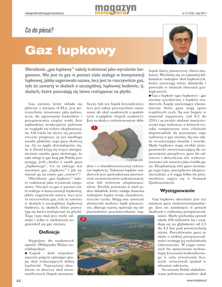 miesięcznik informacyjno-techniczny nr 5 (153), maj 2011 Co do pieca? Gaz łupkowy Określenie„gazłupkowy”należytraktowaćjakowyrażenieżargonowe.Niejesttogazwpostaciciałastałegowkonsystencji łupkowej,jakbysugerowałanazwa,leczjesttorzeczywiściegaz, tyleżezawartywskałachoszczególnej,łupkowejbudowie,tj. skałach,którepozwalająsięłatworozłupywaćnapłytki. Gaz ziemny, który składa się głównie z metanu (CH4), jest powszechnie stosowany jako paliwo, m.in. do ogrzewania budynków i przygotowania ciepłej wody. Jest najbardziej atrakcyjnym paliwem ze względu na walory eksploatacyjne. Od wielu lat słyszy się pesymistyczne prognozy, że już niedługo zasoby globalne tego gazu skończą się. Aż tu nagle dowiadujemy się, że w Ziemi kryją się wręcz nieograniczone zasoby gazu ziemnego, że taki ubogi w gaz kraj jak Polska jest potęgą, jeśli chodzi o zasób gazu „łupkowego”. Co to takiego ten nieznany gaz „łupkowy” i jak zamienić go na znany gaz „rurowy”? Określenie „gaz łupkowy” należy traktować jako wyrażenie żargonowe. Nie jest to gaz w postaci ciała stałego w konsystencji łupkowej, jakby sugerowała nazwa, lecz jest to rzeczywiście gaz, tyle że zawarty w skałach o szczególnej, łupkowej budowie, tj. skałach, które pozwalają się łatwo rozłupywać na płytki. Tego typu skał jest wiele od2 mian i tylko w niektórych zagnieździł się gaz ziemny. Definicje Sięgnijmy do naukowych opisów (Wikipedia Wolna encyklopedia): l Łu pek - dość nie jed no znaczne pojęcie opisujące grupę skał wykazujących dobrą łupliwość. Najczęściej określenie to dotyczy skał metamorficznych (łupek metamor- 44 ficzny lub też łupek krystaliczny), lecz jest także powszechnie stosowane do skał osadowych o podobnym wyglądzie (łupek osadowy). Jest to skała o zróżnicowanym skła1 dzie i o charakterystycznej teksturze łupkowej. Tekstura łupków osadowych jest spowodowana pierwotnym uwarstwieniem sedymentacyjnym lub wtórnym złupkowaceniem. Zwykle przeważa w nich jeden składnik, który nadaje danemu rodzajowi łupka swoje charakterystyczne cechy. Mogą one zawierać domieszki mułowe bądź piaszczyste, dlatego nazwę opatruje się odpowiednimi przymiotnikami (np. łupek ilasty, piaszczysty, ilasto-mulasty). Wyróżnia się co najmniej kilkanaście rodzajów skał łupkowych, które zawierają różne składniki i powstały w różnych okresach geologicznych. l Gaz z łupków (gaz łupkowy) - gaz ziemny uzyskiwany z łupków osadowych. Łupki zawierające ekonomiczne ilości gazu mają sporo wspólnych cech. Są one bogate w materiał organiczny (od 0,5 do 25%) i są zwykle skałami macierzystymi ropy naftowej, w których wysoka temperatura oraz ciśnienie doprowadziły do przemiany ropy naftowej w gaz ziemny. Są one także wystarczająco kruche i twarde. Skały łupkowe mają zwykle przepustowość niewystarczającą do zapewnienia przepływu gazu do odwiertu i dotychczas nie wykorzystywano ich masowo jako źródła gazu. Eksploatacją złóż gazu ziemnego tego typu, początkowo eksperymentalnie, a w ciągu kilku lat przemysłowo, zajęto się w Stanach Zjednoczonych. Występowanie Gaz łupkowy określany jest też mianem gazu niekonwencjonalnego. Jest on zamknięty w porach skalnych o znikomej przepuszczalności. Skały pochodzą sprzed około 450 milionów lat i znajdują się na głębokości od 2,5 do 4,5 km pod powierzchnią ziemi. Pozyskiwanie gazu ze skały o niskiej przepuszczalności wymaga jej rozluźnienia (skruszenia). W ciągu ostatnich lat opracowano technologię kruszenia hydraulicznego w celu utworzenia licznych, sztucznych spękań w obszarze odwiertu. Na terenie Polski zlokalizowano położenie zasobów skał www.instalator.pl