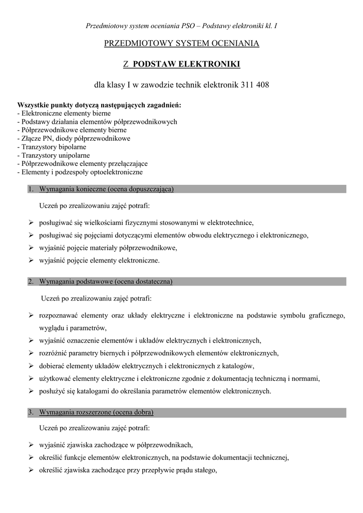 Przedmiotowy system oceniania PSO – Podstawy elektroniki kl. I PRZEDMIOTOWY SYSTEM OCENIANIA Z PODSTAW ELEKTRONIKI dla klasy I w zawodzie technik elektronik 311 408 Wszystkie punkty dotyczą następujących zagadnień: - Elektroniczne elementy bierne - Podstawy działania elementów półprzewodnikowych - Półprzewodnikowe elementy bierne - Złącze PN, diody półprzewodnikowe - Tranzystory bipolarne - Tranzystory unipolarne - Półprzewodnikowe elementy przełączające - Elementy i podzespoły optoelektroniczne 1. Wymagania konieczne (ocena dopuszczająca) Uczeń po zrealizowaniu zajęć potrafi:  posługiwać się wielkościami fizycznymi stosowanymi w elektrotechnice,  posługiwać się pojęciami dotyczącymi elementów obwodu elektrycznego i elektronicznego,  wyjaśnić pojęcie materiały półprzewodnikowe,  wyjaśnić pojęcie elementy elektroniczne. 2. Wymagania podstawowe (ocena dostateczna) Uczeń po zrealizowaniu zajęć potrafi:  rozpoznawać elementy oraz układy elektryczne i elektroniczne na podstawie symbolu graficznego, wyglądu i parametrów,  wyjaśnić oznaczenie elementów i układów elektrycznych i elektronicznych,  rozróżnić parametry biernych i półprzewodnikowych elementów elektronicznych,  dobierać elementy układów elektrycznych i elektronicznych z katalogów,  użytkować elementy elektryczne i elektroniczne zgodnie z dokumentacją techniczną i normami,  posłużyć się katalogami do określania parametrów elementów elektronicznych. 3. Wymagania rozszerzone (ocena dobra) Uczeń po zrealizowaniu zajęć potrafi:  wyjaśnić zjawiska zachodzące w półprzewodnikach,  określić funkcje elementów elektronicznych, na podstawie dokumentacji technicznej,  określić zjawiska zachodzące przy przepływie prądu stałego, Przedmiotowy system oceniania PSO – Podstawy elektroniki kl. I  określić zjawiska zachodzące przy przepływie prądu zmiennego,  dobrać elementy elektroniczne do określonych warunków obciążenia,  dobrać elementy elektroniczne do określonych warunków zewnętrznych. 4. Wymagania dopełniające (ocena bardzo dobra) Uczeń po zrealizowaniu zajęć potrafi:  obliczać i szacować wartości wielkości elektrycznych z wykorzystaniem prawa Ohma,  obliczać i szacować wartości wielkości elektrycznych z wykorzystaniem praw Kirchhoffa,  opisać zjawiska związane z przepływem prądu w półprzewodnikach,  opisać zjawiska związane z przepływem prądu w układach elektronicznych. 5. Wymagania wykraczające (ocena celująca) Uczeń: - spełnia wymogi uzyskania oceny bardzo dobrej, a ponadto wykracza posiadaną wiedzą poza program nauczania, - stworzy projekt wybranego przez nauczyciela układu elektronicznego i wykona jego praktyczną realizację.