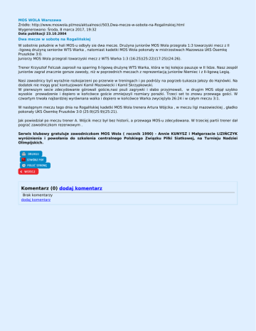 MOS WOLA Warszawa Źródło: http://www.moswola.pl/mos/aktualnosci/503,Dwa-mecze-w-sobote-na-Rogalinskiej.html Wygenerowano: Środa, 8 marca 2017, 19:32 Data publikacji 23.10.2004 Dwa mecze w sobotę na Rogalińskiej W sobotnie południe w hali MOS-u odbyły sie dwa mecze. Drużyna juniorów MOS Wola przegrała 1:3 towarzyski mecz z II -ligową drużyną seniorów WTS Warka , natomiast kadetki MOS Wola pokonały w mistrzostwach Mazowsza UKS Ósemkę Pruszków 3:0. Juniorzy MOS Wola przegrali towarzyski mecz z WTS Warka 1:3 (16:25)(25:22)(17:25)(24:26). Trener Krzysztof Felczak zaprosił na sparring II-ligową drużynę WTS Warka, która w tej kolejce pauzuje w II lidze. Nasz zespół juniorów zagrał znacznie gorsze zawody, niż w poprzednich meczach z reprezentacją juniorów Niemiec i z II-ligową Legią. Nasi zawodnicy byli wyraźnie rozkojarzeni po przerwie w treningach i po podróży na pogrzeb Łukasza Jałozy do Hajnówki. Na dodatek nie mogą grać kontuzjowani Kamil Mazowiecki i Kamil Skrzypkowski. W pierwszym secie zdecydowanie górowali goście,nasi psuli zagrywki i słabo przyjmowali, w drugim MOS objął szybko wysokie prowadzenie i dopiero w końcówce goście zmniejszyli rozmiary porażki. Trzeci set to znowu przewaga gości. W czwartym trwała najbardziej wyrównana walka i dopiero w końcówce Warka zwyciężyła 26:24 i w całym meczu 3:1. W następnym meczu tego dnia na Rogalńskiej kadetki MOS Wola trenera Artura Wójcika , w meczu ligi mazowieckiej , gładko pokonały UKS Ósemkę Pruszków 3:0 (25:9)(25:9)(25:21). Jak powiedział po meczu trener A. Wójcik mecz był bez historii, a przewaga MOS-u zdecydowana. W trzeciej partii trener dał pograć zawodniczkom rezerwowym . Serwis klubowy gratuluje zawodniczkom MOS Wola ( rocznik 1990) - Annie KUNYSZ i Małgorzacie LIZIŃCZYK wyróżnienia i powołania do szkolenia centralnego Polskiego Związku Piłki Siatkowej, na Turnieju Nadziei Olimpijskich. Komentarz (0) dodaj komentarz Brak komentarzy dodaj komentarz