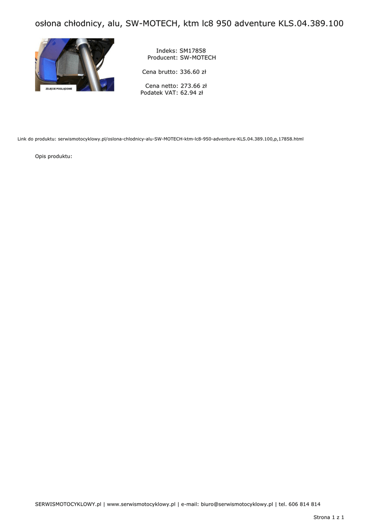 osłona chłodnicy, alu, SW-MOTECH, ktm lc8 950 adventure KLS.04.389.100 Indeks: SM17858 Producent: SW-MOTECH Cena brutto: 336.60 zł Cena netto: 273.66 zł Podatek VAT: 62.94 zł Link do produktu: serwismotocyklowy.pl/oslona-chlodnicy-alu-SW-MOTECH-ktm-lc8-950-adventure-KLS.04.389.100,p,17858.html Opis produktu: SERWISMOTOCYKLOWY.pl | www.serwismotocyklowy.pl | e-mail: [email protected] | tel. 606 814 814 Strona 1 z 1
