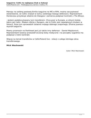 Izaguirre: Celtic to najlepszy klub w Szkocji CelticPoland.com - Polskojęzyczny serwis o Celticu FC Patrząc na solidną postawę Emilio Izaguirre na MŚ w RPA, można zaryzykować stwierdzenie, że Celtic znalazł w końcu solidnego lewego defensora. Reprezentant Hondurasu przylatuje właśnie do Glasgow i zamierza podpisać kontrakt z The Bhoys. - Jestem podekscytowany tym transferem. Chcę grać w Europie, w silnym klubie, takim jak Celtic. Miałem ofertę z Rangers, ale to Celtic jest największym klubem w Szkocji. Poza tym sprowadzili ostatnio mojego dobrego znajomego, Efraina Juareza wyznał Izaguirre. Pewny przenosin na Parkhead jest już także inny defensor - Daniel Majstorovic. Reprezentant Szwecji przeszedł wczoraj testy medyczne i na początku tygodnia ma podpisać 2-letni kontrakt. Więcej na temat transferów w CelticPoland live - relacji z całego letniego okna transferowego. Mick Wachowski Autor: Mick Wachowski 1/1 Powered by TCPDF (www.tcpdf.org)