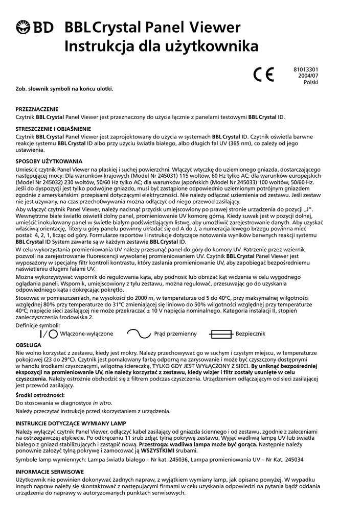 B BBLCrystal Panel Viewer Instrukcja dla u¿ytkownika Zob. s³ownik symboli na koñcu ulotki. U 81013301 2004/07 Polski PRZEZNACZENIE Czytnik BBL Crystal Panel Viewer jest przeznaczony do u¿ycia ³¹cznie z panelami testowymi BBL Crystal ID. STRESZCZENIE I OBJANIENIE Czytnik BBL Crystal Panel Viewer jest zaprojektowany do u¿ycia w systemach BBL Crystal ID. Czytnik owietla barwne reakcje systemu BBL Crystal ID albo przy u¿yciu wiat³a bia³ego, albo d³ugich fal UV (365 nm), co zale¿y od jego ustawienia. SPOSOBY U¯YTKOWANIA Umieciæ czytnik Panel Viewer na p³askiej i suchej powierzchni. W³¹czyæ wtyczkê do uziemionego gniazda, dostarczaj¹cego nastêpuj¹cej mocy: Dla warunków krajowych (Model Nr 245031) 115 woltów, 60 Hz tylko AC; dla warunków europejskich (Model Nr 245032) 230 woltów, 50/60 Hz tylko AC; dla warunków japoñskich (Model Nr 245033) 100 woltów, 50/60 Hz. Jeli do dyspozycji jest tylko podwójne gniazdo, musi byæ zast¹pione odpowiednio uziemionym potrójnym gniazdem zgodnie z amerykañskimi przepisami dotycz¹cymi elektrycznoci. Nie nale¿y od³¹czaæ uziemienia od zestawu. Jeli zestaw nie jest u¿ywany, na czas przecho0wywania mo¿na od³¹czyæ od niego przewód zasilaj¹cy. Aby w³¹czyæ czytnik Panel Viewer, nale¿y nacisn¹æ przycisk umiejscowiony po prawej stronie urz¹dzenia do pozycji I. Wewnêtrzne bia³e wiat³o owietli dolny panel, promieniowanie UV komorê górn¹. Kiedy suwak jest w pozycji dolnej, umieciæ inokulowany panel w wietle bia³ym podwietlaj¹cym listwê, aby umo¿liwiæ zarejestrowanie danych. Aby uzyskaæ w³aciw¹ orientacjê, litery u góry panelu powinny uk³adaæ siê od A do J, a numeracja lewego brzegu powinna mieæ postaæ 4, 2, 1, licz¹c od góry. Formularze raportów i instrukcje dotycz¹ce notowania wyników barwnych reakcji systemu BBL Crystal ID System zawarte s¹ w ka¿dym zestawie BBL Crystal ID. W celu wykorzystania promieniowania UV nale¿y przesun¹æ panel do góry do komory UV. Patrzenie przez wziernik pozwoli na zarejestrowanie fluorescencji wywo³anej promieniowaniem UV. Czytnik BBL Crystal Panel Viewer jest wyposa¿ony w specjalny filtr kontroli kontrastu, który zas³ania promieniowanie UV, aby zapobiegaæ bezporedniemu nawietleniu d³ugimi falami UV. Mo¿na wykorzystywaæ wspornik do regulowania k¹ta, aby podnosiæ lub obni¿aæ k¹t widzenia w celu wygodnego ogl¹dania paneli. Wspornik, umiejscowiony z ty³u zestawu, mo¿na regulowaæ, przesuwaj¹c go do uzyskania odpowiedniego k¹ta i dokrêcaj¹c pokrêt³o. Stosowaæ w pomieszczeniach, na wysokoci do 2000 m, w temperaturze od 5 do 40oC, przy maksymalnej wilgotnoci wzglêdnej 80% przy temperaturze do 31oC zmieniaj¹cej siê liniowo do 50% wilgotnoci wzglêdnej przy temperaturze 40oC; napiêcie sieci zasilaj¹cej nie mo¿e przekraczaæ ± 10 V napiêcia nominalnego. Kategoria instalacji II, stopieñ zanieczyszczenia rodowiska 2. Definicje symboli: W³¹czone-wy³¹czone Pr¹d przemienny Bezpiecznik OBS£UGA Nie wolno korzystaæ z zestawu, kiedy jest mokry. Nale¿y przechowywaæ go w suchym i czystym miejscu, w temperaturze pokojowej (23 do 29°C). Czytnik jest pomalowany farb¹ odporn¹ na zarysowanie i mo¿e byæ czyszczony dostêpnymi w handlu rodkami czyszcz¹cymi, wilgotn¹ ciereczk¹, TYLKO GDY JEST WY£¥CZONY Z SIECI. By unikn¹æ bezporedniej ekspozycji na promieniowanie UV, nie nale¿y korzystaæ z zestawu, kiedy wizjer i filtr zosta³y usuniête w celu czyszczenia. Nale¿y ostro¿nie obchodziæ siê z filtrem podczas czyszczenia. Urz¹dzeniem od³¹czaj¹cym od sieci zasilaj¹cej jest przewód zasilaj¹cy. rodki ostro¿noci: Do stosowania w diagnostyce in vitro. Nale¿y przeczytaæ instrukcjê przed skorzystaniem z urz¹dzenia. INSTRUKCJE DOTYCZ¥CE WYMIANY LAMP Nale¿y wy³¹czyæ czytnik Panel Viewer, od³¹czyæ kabel zasilaj¹cy od gniazda ciennego i od zestawu, zgodnie z zaleceniami na ostrzegawczej etykiecie. Po odkrêceniu 11 rub zdj¹æ tyln¹ pokrywê zestawu. Wyj¹æ wadliw¹ lampê UV lub wiat³a bia³ego z gniazd stabilizuj¹cych i zast¹piæ now¹. Przestroga: wadliwa lampa mo¿e byæ gor¹ca. Nastêpnie nale¿y ponownie za³o¿yæ tyln¹ pokrywê i zamocowaæ j¹ WSZYSTKIMI rubami. Symbole lamp wymiennych: Lampa wiat³a bia³ego Nr kat. 245036, Lampa promieniowania UV Nr Kat. 245034 INFORMACJE SERWISOWE U¿ytkownik nie powinien dokonywaæ ¿adnych napraw, z wyj¹tkiem wymiany lamp, jak opisano powy¿ej. W wypadku innych napraw nale¿y siê skontaktowaæ z nastêpuj¹cymi firmami w celu uzyskania odpowiedzi na pytania b¹d oddania urz¹dzenia do naprawy w autoryzowanych punktach serwisowych. UVP, Inc. 2066 W. 11th Street, Upland, CA 91786, U.S.A. Linia bezp³atna: (800) 452-6788 Poza USA: (909) 946-3197 Faks: (909) 946-3597 Ultra Violet Products Limited Uniti, Trinity Hall Estate, Nuffield Road Cambridge LB4 1TE U.K. Telefon: 1223 420022 Faks: 1223 420561 PARAMETRY TECHNICZNE: Dla modelu krajowego Nr 245031 (amerykañskiego) Napiêcie (V) Czêstotliwoæ Przewód Natê¿enie (A) Wymiary Masa Kolor Gwarancja 115 60 Hz 3-¿y³owy 0,32 12,5 x 10,5 x 9,5 cali 4,1 kg Czarna os³onka 1 rok uziemiony zewnêtrzna od daty Typ SV produkcji Model europejski Nr 245032 Napiêcie (V) Czêstotliwoæ Przewód Natê¿enie (A) Wymiary Masa Kolor Gwarancja 230 50/60 Hz 3-¿y³owy 0,32 31,75 x 26,67 x 24,13 cm 4,1 kg czarny 1 rok od daty uziemiony produkcji Typ SV 2 Manufacturer / Výrobce / Producent / Fabrikant / Tootja / Valmistaja / Fabricant / Hersteller / ÊáôáóêåõáóôÞò / Gyártó / Ditta produttrice / Gamintojas / Producent / Fabricante / Výrobca / Tillverkare Catalog number / Katalogové èíslo / Katalognummer / Catalogusnummer / Kataloogi number / Tuotenumero / Numéro catalogue / Bestellnummer / Áñéèìüò êáôáëüãïõ / Katalógusszám / Numero di catalogo / Katalogo numeris / Numer katalogowy / Número do catálogo / Katalógové èíslo / Número de catálogo Authorized Representative in the European Community / Au