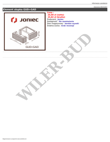 Informacje o produkcie Utworzono 08-03-2017 Element słupka GUD+GAD Cena : 20,99 zł (netto) 25,82 zł (brutto) W IL ER -B U D Producent : Joniec Dostępność : Na zamówienie Stan magazynowy : bardzo wysoki Średnia ocena : brak recenzji Wygenerowano w programie www.oscGold.com
