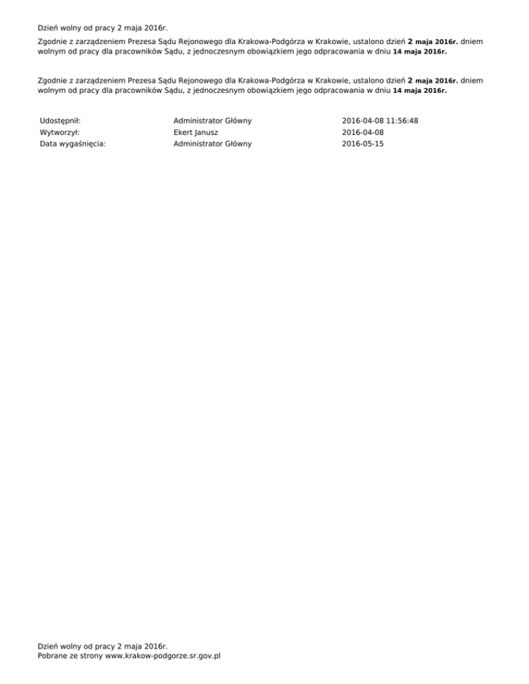 Dzień wolny od pracy 2 maja 2016r. Zgodnie z zarządzeniem Prezesa Sądu Rejonowego dla Krakowa-Podgórza w Krakowie, ustalono dzień 2 maja 2016r. dniem wolnym od pracy dla pracowników Sądu, z jednoczesnym obowiązkiem jego odpracowania w dniu 14 maja 2016r. Zgodnie z zarządzeniem Prezesa Sądu Rejonowego dla Krakowa-Podgórza w Krakowie, ustalono dzień 2 maja 2016r. dniem wolnym od pracy dla pracowników Sądu, z jednoczesnym obowiązkiem jego odpracowania w dniu 14 maja 2016r. Udostępnił: Administrator Główny 2016-04-08 11:56:48 Wytworzył: Ekert Janusz 2016-04-08 Data wygaśnięcia: Administrator Główny 2016-05-15 Dzień wolny od pracy 2 maja 2016r. Pobrane ze strony www.krakow-podgorze.sr.gov.pl