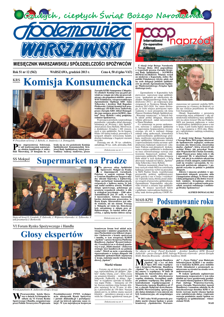 Czułych , ciepłych Świąt Bożego Narodzenia MIESIĘCZNIK WARSZAWSKIEJ SPÓŁDZIELCZOŚCI SPOŻYWCÓW Rok 51 nr 12 (562) WARSZAWA, grudzień 2013 r. Cena 4, 50 zł (plus VAT) Komisja Konsumencka KRS W Prezydium od lewej: J. Rybicki, A. Anulewicz i A. Domagalski. P rzy stuprocentowej frekwencji, w sali konferencyjnej najstarszego obiektu handlowego w stolicy, Hali Mirowskiej, 25 listopada br, ze- SS Mokpol brała się na swe posiedzenie Komisja Spółdzielczości Konsumenckiej Krajowej Rady Spółdzielczej, której przewodniczy Andrzej Anulewicz, prezes Zarządu KZRS Samopomoc Chłopska. 16 członków Komisji oraz jej gości powitali na wstępie nie tylko jej przewodniczący, ale gospodarze obiektu – prezes WSS Śródmieście, wiceprzewodnicząca Zgromadzenia Ogólnego KRS Anna Tylkowska i dyrektor Hali Bogusław Pieńkowski. Gośćmi Komisji byli przewodniczący ZO KRS Jerzy Jankowski, prezes Zarządu KRS Alfred Domagalski, jego zastępca, prezes KZRSS „Spolem” Jerzy Rybicki i niżej podpisany redaktor Społemowca. Po przyjęciu protokołu z poprzedniego posiedzenia i porządku obrad obecnego, informację pt.„Wczoraj i dziś Społem” złożył prezes Jerzy Rybicki. Mówił m.in. o działalności Związku i 260 zrzeszonych w nim spółdzielni. Na tle bogatej, blisko 145-letniej tradycji, prowadzą w 4 tysiącach sklepów nowoczesny handel, dzielnie konkurując z bogatymi sieciami na rynku. Zrzeszają one ok. 50 tys. członków, zatrudniają 30 tys. osób, prowadzą obok Dokończenie na str. 3 Supermarket na Pradze T o pierwszy sklep Spółdzielni Spożywców Mokpol na Pradze o imponujących warunkach. Położony w samym centrum Pragi, w Centrum Handlowym Targowa między ulicami Kijowską a Ząbkowską. Mimo perturbacji komunikacyjnych, związanych z budową metra, to jednak nadal ruchliwa arteria. Wielkość sklepu spożywczego, położonego po przejściu wygodnych schodów w dół, w rozległym przyziemiu - 1200 mkw. Zatrudnionych jest 35 osób, w tym 4 kierowników. Główny kierownik, bardzo doświadczona pracownica, to Beata Kupis. Kierownictwo jest młode wiekiem, ale nie stażem. Pracują w Mokpolu od wielu lat. Dotychczas były zatrudnione w sklepie przy ul. Dąbrowskiego. To bardzo dobra placówka, z opinią bardzo dobrze zarzą- Stoją od lewej:S. Cerański, P. Zalewski, J. Wójtowicz-Garwoła i A. Tylkowska. Z tyłu przemawia J. Borkowski. VI Forum Rynku Spożywczego i Handlu Głosy ekspertów W warszawskim hotelu Sheraton w dniach 5-6 listopada br. odbyło się VI Forum Rynku Spożywczego i Handlu, zorganizowane przez Polskie Towarzystwo Wspierania Przedsiębiorczości PTWP, wydające m.in. miesięcznik Rynek Spożywczy i portale dlahandlu.pl i portalspozyczy.pl /na których opieramy nasze relacje/. W tym największym krajowym Z okazji świąt Bożego Narodzenia i Nowego Roku 2014 poprosiliśmy o wypowiedź prezesa Zarządu Krajowej Rady Spółdzielczej – ALFREDA DOMAGALSKIEGO. Właśnie wrócił on niedawno z Kapsztadu, stolicy Republiki Południowej Afryki, gdzie stał na czele delegacji polskich spółdzielców na obrady Zgromadzenia Ogólnego Międzynarodowego Związku Spółdzielczego (red.). – Zgromadzenie w Kapsztadzie było pierwszym najwyższej rangi spółdzielczym spotkaniem po zakończeniu obchodów Międzynarodowego Roku Spółdzielczości 2012 i po rozpoczęciu prac związanych ze Światową Dekadą Spółdzielczą 2013-2020. Nic zatem dziwnego, że wiele miejsca poświęcono wprowadzeniu w życie przyjętemu rok temu Planowi Działania Dekady Spółdzielczej. „Warsztaty tematyczne”, w których brała udział polska delegacja, dotyczyły właśnie głównych zadań zarysowanych w Planie Działania. Co zainteresuje na pewno społemowców, mówiono o zadaniach spółdzielni w zapewnieniu bezpieczeństwa żywnościowego, ich roli w realizacji różnego rodzaju usług społecznych, komunikacji i upowszechnianiu spółdzielczego przekazu, możliwości pozyskiwania kapitału przez spółdzielnie. Debatowano również o upowszechnianiu wiedzy na temat spółdzielczości, badaniach naukowych i edukacji. Podczas sesji plenarnych dyskutowano o miejscu spółdzielni w działaniach na rzecz zrównoważonego rozwoju oraz tworzeniu finansowych podstaw funkcjonowania spółdzielni. Polska delegacja brała udział w tych dyskusjach, a dużą aktywność wykazali też liderzy „Społem” Anna Tylkowska i Jerzy Rybicki. Ważnym momentem obrad były wybory nowych władz MZS na czteroletnią kadencję i ponowny wybór na prezydenta MZS Pauline Green, wypróbowanej przyjaciółki polskiej spółdzielczości, która gościła u nas w kraju i wielokrotnie wspierała naszą obronę przed atakami wrogich sił przeciwko spółdzielniom. Zgromadzenie Kapsztadzkie zdecydowało również o zmianie logo spółdzielczego. W miejsce tęczowych łuków z gołębiami, wprowadzono bardziej czytelny znak słowno-graficzny COOP. Po- MAH-KPH stanowiono też zamienić siedzibę MZS, przenosząc ją z Genewy do Brukseli, co dla nas oznacza przybliżenie do władz Unii Europejskiej. Obrady Kapsztadzkie z pewnością wzmacniają naszą solidarność i siłę oddziaływania miliardowej masy spółdzielców na całym świecie! Dla nas Polaków, MZS jest mocnym zapleczem w walce o sprawiedliwe spółdzielcze prawo u nas w kraju. I jeśli trzeba będzie skorzystamy z tego poparcia w 2014 roku. Dlatego z optymizmem i nadzieją wchodzimy w Nowy Rok. Z okazji świąt Bożego Narodzenia i Nowego Roku 2014 pragnę skierować do Społemowców najlepsze, serdeczne życzenia aby historyczna, niezawodna marka „Społem”, którą stworzyli tak wybitni Polacy jak prezydent Stanisław Wojciechowski i Stefan Żeromski, dzięki Waszej pracy dalej rosła w siłę i znaczenie! By w placówkach „Społem”, tak jak ja to osobiście odczuwam podczas swoich zakupów, nadal klienci czuli się swojsko i przyjaźnie, by wykazywali patriotyzm zakupowy i popierali wszystko co polskie w polskich sklepach. 
