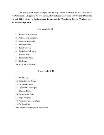 Lista kandydatów dopuszczonych do drugiego etapu konkursu na staż urzędniczy w Prokuraturze Okręgowej we Wrocławiu, który odbędzie się w dniu 12 września 2011 roku w sali 111, I piętro, w Prokuraturze Rejonowej dla Wrocławia Krzyki Wschód, przy ul. Piłsudskiego 38 b I tura godz. 8. 30 1. Adamczyk Katarzyna 2. Antoszewski Grzegorz 3. Anuszek Agnieszka 4. Anzorge Marta 5. Bakuń Urszula 6. Bijak- Jarska Izabela 7. Błachut Anna 8. Borkowska Anita 9. Ból Iwona 10. Brzęczek Aleksandra II tura godz. 9. 10 11. Bromke Iga 12. Chodakowska Iwona 13. Dąbrowska Anna 14. Dąbrowska Katarzyna 15. Długosz Błażej 16. Dziurzyńska Anna 17. Feiga Patrycja 18. Furmanowicz Magdalena 19. Gardyna Ewa 20. Griszke- Jaremkiewicz Aleksandra III tura godz. 9. 50 21. Gromala- Kołt Katarzyna 22. Hajdamowicz Anna 23. Horodyska Joanna 24. Jędrzejczyk Ewelina 25. Kinal Dorota 26. Kolmas Anna 27. Kołyga Krzysztof 28. Kominiarczyk Anna 29. Kot Michał 30. Kowalski Kamil IV tura godz. 10. 30 31. Kuc Urszula 32. Kwiatkowska Justyna 33. Łagódka Piotr 34. Machowska Joanna 35. Maj- Zuterek Iwona 36. Markowski Łukasz 37. Martynowicz Monika 38. Michalska Katarzyna 39. Mielach Magdalena 40. Mielcarek Anna V tura godz. 11. 10 41. Miller Katarzyna 42. Muszalik Sebastian 43. Ostapiuk Małgorzata 44. Pieczonka Michał 45. Pietrzak Małgorzata 46. Pośpiech Marta 47. Podziemek Bernadeta 48. Potoka Katarzyna 49. Przewdziękowska Anna 50. Rawska Ewa VI tura godz. 11. 50 51. Rogowicz Kinga 52. Rudnicka Sylwia 53. Rumian Aleksandra 54. Sadowska Kamila 55. Sałapa Katarzyna 56. Sądel Zbigniew 57. Sewera Marcin 58. Skrzyniarz Agnieszka 59. Strojna Agata 60. Szabatura Joanna VII tura godz. 12. 30 61. Szczerbińska Magdalena 62. Szczepara Ewa 63. Szul Grzegorz 64. Ślusarz Marta 65. Świło Agnieszka 66. Tatar Justyna 67. Tyczyńska Ewelina 68. Usowicz Anna 69. Walczak Krzysztof 70. Więckowska Kamila VIII tura godz. 13. 10 71. Wojciechowska Joanna 72. Wojciechowska Monika 73. Zając- Cajzer Katarzyna 74. Zielińska Magdalena 75. Zemła Łukasz