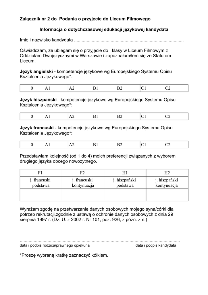 Załącznik nr 2 do Podania o przyjęcie do Liceum Filmowego Informacja o dotychczasowej edukacji językowej kandydata Imię i nazwisko kandydata ....................................................................................... Oświadczam, że ubiegam się o przyjęcie do I klasy w Liceum Filmowym z Oddziałam Dwujęzycznymi w Warszawie i zapoznałam/łem się ze Statutem Liceum. Język angielski - kompetencje językowe wg Europejskiego Systemu Opisu Kształcenia Językowego*: 0 A1 A2 B1 B2 C1 C2 Język hiszpański - kompetencje językowe wg Europejskiego Systemu Opisu Kształcenia Językowego*: 0 A1 A2 B1 B2 C1 C2 Język francuski - kompetencje językowe wg Europejskiego Systemu Opisu Kształcenia Językowego*: 0 A1 A2 B1 B2 C1 C2 Przedstawiam kolejność (od 1 do 4) moich preferencji związanych z wyborem drugiego języka obcego nowożytnego. F1 F2 H1 H2 j. francuski podstawa j. francuski kontynuacja j. hiszpański podstawa j. hiszpański kontynuacja Wyrażam zgodę na przetwarzanie danych osobowych mojego syna/córki dla potrzeb rekrutacji,zgodnie z ustawą o ochronie danych osobowych z dnia 29 sierpnia 1997 r. (Dz. U. z 2002 r. Nr 101, poz. 926, z późn. zm.) ............................................................................................................................... data i podpis rodzica/prawnego opiekuna *Proszę wybraną kratkę zaznaczyć kółkiem. data i podpis kandydata