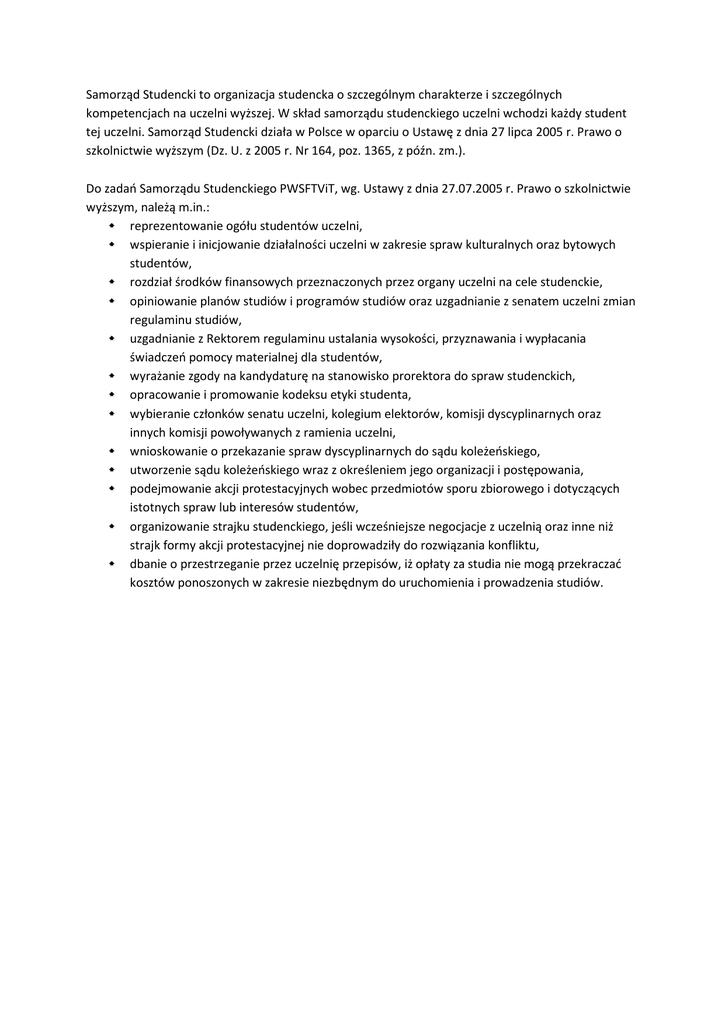 Samorząd Studencki to organizacja studencka o szczególnym charakterze i szczególnych kompetencjach na uczelni wyższej. W skład samorządu studenckiego uczelni wchodzi każdy student tej uczelni. Samorząd Studencki działa w Polsce w oparciu o Ustawę z dnia 27 lipca 2005 r. Prawo o szkolnictwie wyższym (Dz. U. z 2005 r. Nr 164, poz. 1365, z późn. zm.). Do zadań Samorządu Studenckiego PWSFTViT, wg. Ustawy z dnia 27.07.2005 r. Prawo o szkolnictwie wyższym, należą m.in.: reprezentowanie ogółu studentów uczelni, wspieranie i inicjowanie działalności uczelni w zakresie spraw kulturalnych oraz bytowych studentów, rozdział środków finansowych przeznaczonych przez organy uczelni na cele studenckie, opiniowanie planów studiów i programów studiów oraz uzgadnianie z senatem uczelni zmian regulaminu studiów, uzgadnianie z Rektorem regulaminu ustalania wysokości, przyznawania i wypłacania świadczeń pomocy materialnej dla studentów, wyrażanie zgody na kandydaturę na stanowisko prorektora do spraw studenckich, opracowanie i promowanie kodeksu etyki studenta, wybieranie członków senatu uczelni, kolegium elektorów, komisji dyscyplinarnych oraz innych komisji powoływanych z ramienia uczelni, wnioskowanie o przekazanie spraw dyscyplinarnych do sądu koleżeńskiego, utworzenie sądu koleżeńskiego wraz z określeniem jego organizacji i postępowania, podejmowanie akcji protestacyjnych wobec przedmiotów sporu zbiorowego i dotyczących istotnych spraw lub interesów studentów, organizowanie strajku studenckiego, jeśli wcześniejsze negocjacje z uczelnią oraz inne niż strajk formy akcji protestacyjnej nie doprowadziły do rozwiązania konfliktu, dbanie o przestrzeganie przez uczelnię przepisów, iż opłaty za studia nie mogą przekraczać kosztów ponoszonych w zakresie niezbędnym do uruchomienia i prowadzenia studiów.
