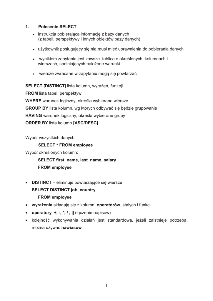 1 1. Polecenie SELECT • instrukcja pobierajca informacj z bazy
