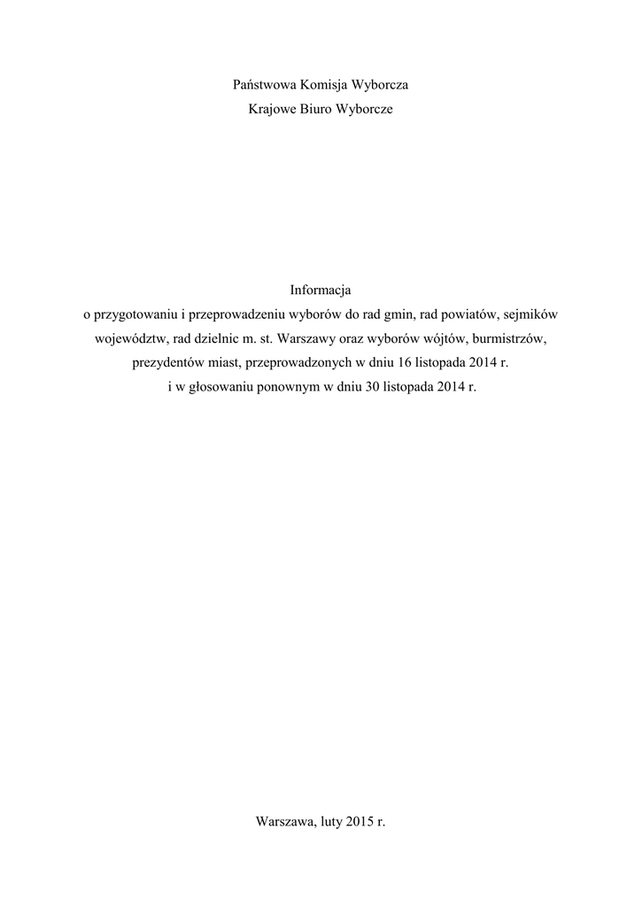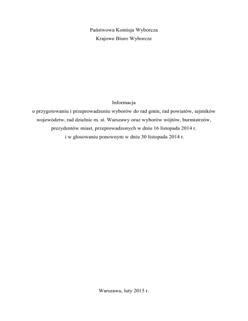 Państwowa Komisja Wyborcza Krajowe Biuro Wyborcze Informacja o przygotowaniu i przeprowadzeniu wyborów do rad gmin, rad powiatów, sejmików województw, rad dzielnic m. st. Warszawy oraz wyborów wójtów, burmistrzów, prezydentów miast, przeprowadzonych w dniu 16 listopada 2014 r. i w głosowaniu ponownym w dniu 30 listopada 2014 r. Warszawa, luty 2015 r. 2 Informację sporządzono na podstawie sprawozdań komisarzy wyborczych; wykorzystano także informacje, komunikaty i inne materiały zgromadzone w Państwowej Komisji Wyborczej oraz meldunki i dane przekazywane w dniach wyborów. I. Zarządzenie i przygotowanie wyborów 1. Wybory zarządził Prezes Rady Ministrów rozporządzeniem z dnia 20 sierpnia 2014 r., wyznaczył datę wyborów na dzień 16 listopada 2014 r. i określił terminy wykonania poszczególnych czynności wyborczych (kalendarz wyborczy). Rozporządzenie zostało ogłoszone w Dzienniku Ustaw z dnia 27 sierpnia 2014 r. poz. 1134. Państwowa Komisja Wyborcza wraz z ogłoszeniem zarządzenia wyborów podała treść rozporządzenia do publicznej wiadomości na stronie internetowej www.pkw.gov.pl przypominając równocześnie, że od dnia ogłoszenia mogą być wykonywane czynności związane z tworzeniem komitetów wyborczych w celu zgłoszenia kandydatów na radnych i kandydatów na wójtów, burmistrzów, prezydentów miast. 2. Państwowa Komisja Wyborcza podjęła działania w zakresie przygotowania wyborów jeszcze przed zarządzeniem wyborów. W szczególności zapewniła stały nadzór nad realizacją niezbędnej dla przeprowadzenia wyborów aktualizacji podziału gmin na okręgi wyborcze i obwody głosowania. Nadzór bieżący w tych sprawach sprawowali komisarze wyborczy. Zgodnie z Kodeksem wyborczym podziału i zmian w podziale na obwody głosowania dokonuje rada gminy, zaś podziału i zmian na okręgi wyborcze do rad gmin, do rad powiatów i do sejmików województw odpowiednio rada gminy, rada powiatu i sejmiku województwa – a na uchwały tych organów wyborcom w liczbie co najmniej 15 przysługuje skarga do komisarza wyborczego (art. 12 § 13, art. 419 i 420, art. 455 i 456, art. 463 Kodeksu wyborczego). Zadania w tej materii komisarze wyborczy wykonywali systematycznie, podejmowali ponadto działania w trybie art. 17 Kodeksu wyborczego, wzywając właściwe 3 organy do wykonania tych zadań w terminie i zgodnie z prawem, a w razie bezskuteczności wezwania wykonywali je z mocy ustawy. Na postanowienie komisarza wyborczego w sprawach podziału na okręgi wyborcze przysługuje odwołanie do Państwowej Komisji Wyborczej. W związku z wyborami samorządowymi w 2014 r. do PKW wpłynęło 66 odwołań, wniosków i zapytań. Komisja wszystkie zgłoszone sprawy rozpoznała i zajęła stanowisko. 27 spraw wniesionych w tym trybie spełniało przesłanki odwołania, z tego za niezasadne Komisja uznała 13 odwołań, 11 pozostawiła bez rozpoznania, ponieważ zostały wniesione po terminie bądź przez podmiot nieuprawniony, 3 odwołania uznała za zasadne, podjęte postanowienia komisarzy wyborczych uchyliła przekazując je do ponownego rozpoznania. W pozostałych sprawach udzielono nadawcom wyjaśnień i wskazań dotyczących stosowania obowiązujących w tej materii przepisów. Łącznie utworzonych zostało 39 631 okręgów wyborczych, w tym: 37 842 okręgi jednomandatowe do rad gmin, 297 okręgów do rad miast na prawach powiatu, 75 okręgów do rad dzielnic m.st. Warszawy, 1332 okręgi do rad powiatów, 85 okręgów do sejmików województw. 3. Przygotowaniu i organizacji wyborów samorządowych w 2014 r. poświęcona była narada służbowa Państwowej Komisji Wyborczej z komisarzami wyborczymi i aparatem kierowniczym Krajowego Biura Wyborczego, która odbyła się w dniach 9-10 czerwca 2014 r. w Augustowie, woj. podlaskie. Ustalono i omówiono zadania organów i służb wyborczych w przygotowaniu i przeprowadzeniu wyborów. 4. Po zarządzeniu wyborów Państwowa Komisja Wyborcza przystąpiła niezwłocznie do realizacji ustawowych zadań oraz zapewniła w różnych formach organom i służbom wyborczym, komitetom wyborczym i wyborcom pomoc prawną i organizacyjną w zakresie stosowania prawa wyborczego i wykonania czynności wyborczych. W całym okresie wyborczym dostępna była strona internetowa www.pkw.gov.pl, na której zamieszczano na bieżąco przepisy prawa wyborczego, rozporządzenia i uchwały PKW wydawane na 4 podstawie Kodeksu wyborczego; udostępniano informacje, wyjaśnienia i komunikaty w sprawach stosowania przepisów wyborczych; przypominano o terminach poszczególnych czynności wyborczych, prowadzono serwis informacyjny dotyczący udziału w głosowaniu. Przez kilka dni przed wyborami prezentowane były spoty informacyjne przypominające o terminie i sposobie głosowania. Na stronie internetowej Państwowej Komisji Wyborczej były dostępne szczegółowe informacje: o warunkach udziału w wyborach obywateli polskich oraz obywateli Unii Europejskiej niebędących obywatelami polskimi; o uprawnieniach wyborców niepełnosprawnych oraz o sposobie dopisywania się do spisu wyborców w wybranym obwodzie głosowania; informacja dotycząca głosowania korespondencyjnego; informacje o zasadach tworzenia komitetów wyborczych w celu zgłoszenia list kandydatów na radnych i kandydatów na wójtów, burmistrzów i prezydentów miast oraz o zasadach i sposobie zgłaszania list i kandydatów wraz z wzorami pomocniczymi dokumentów zgłoszeniowych. Wydano wyjaśnienia dotyczące składania oświadczeń lustracyjnych przez osoby kandydujące; wyjaśnienia szczegółowe dotyczące zasad finansowania kampanii wyborczej w wyborach samorządowych, wyliczone zostały limity wydatków na agitację wyborczą. Zgodnie z wymogami ustawowymi Państwowa Komisja Wyborcza uchwaliła regulaminy i wzory pieczęci terytorialnych i obwodowych komisji wyborczych powołanych do przeprowadzenia wyborów; wzór zaświadczenia dla męża zaufania wyznaczonego do obwodo