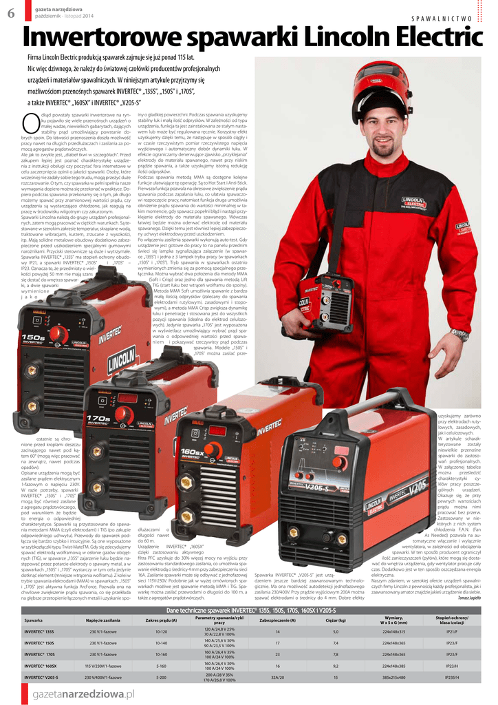 6 gazeta narzędziowa październik - listopad 2014 s p a w a lnictw o Inwertorowe spawarki Lincoln Electric Firma Lincoln Electric produkcją spawarek zajmuje się już ponad 115 lat. Nic więc dziwnego, że należy do światowej czołówki producentów profesjonalnych urządzeń i materiałów spawalniczych. W niniejszym artykule przyjrzymy się możliwościom przenośnych spawarek INVERTEC® „135S”, „150S” i „170S”, a także INVERTEC® „160SX” i INVERTEC® „V205-S” O dkąd powstały spawarki inwertorowe na rynku pojawiło się wiele przenośnych urządzeń o małej wadze, niewielkich gabarytach, dających stabilny prąd umożliwiający powstanie dobrych spoin. Do łatwości przenoszenia doszła możliwość pracy nawet na długich przedłużaczach i zasilania za pomocą agregatów prądotwórczych. Ale jak to zwykle jest, „diabeł tkwi w szczegółach”. Przed zakupem lepiej jest poznać charakterystykę urządzenia z instrukcji obsługi czy poczytać fora internetowe w celu zaczerpnięcia opinii o jakości spawarki. Osoby, które wcześniej nie zadały sobie tego trudu, mogą przeżyć duże rozczarowanie. O tym, czy spawarka w pełni spełnia nasze wymagania dopiero można się przekonać w praktyce. Dopiero podczas spawania przekonamy się o tym, jak długo możemy spawać przy znamionowej wartości prądu, czy urządzenia są wystarczająco chłodzone, jak reagują na pracę w środowisku wilgotnym czy zakurzonym. Spawarki Lincolna należą do grupy urządzeń profesjonalnych, zatem mogą pracować w ciężkich warunkach. Są testowane w szerokim zakresie temperatur, skrapiane wodą, traktowane wibracjami, kurzem, zrzucane z wysokości, itp. Mają solidne metalowe obudowy dodatkowo zabezpieczone przed uszkodzeniem specjalnymi gumowymi narożnikami. Przyciski sterownicze są duże i wytrzymałe. Spawarka INVERTEC® „135S” ma stopień ochrony obudowy IP21, a spawarki INVERTEC® „150S” i „170S” – IP23. Oznacza to, że przedmioty o wielkości powyżej 50 mm nie mają szans się dostać do wnętrza spawarki, a dwie spawarki w y mienione j a k o ostatnie są chronione przed kroplami deszczu zacinającego nawet pod kątem 60° (mogą więc pracować na zewnątrz, nawet podczas opadów). Opisane urządzenia mogą być zasilane prądem elektrycznym 1-fazowym o napięciu 230V. W razie potrzeby, spawarki INVERTEC® „150S” i „170S” mogą być również zasilane z agregatu prądotwórczego, pod warunkiem że będzie to energia o odpowiedniej charakterystyce. Spawarki są przystosowane do spawania metodami MMA (czyli elektrodami) i TIG (po zakupie odpowiedniego uchwytu). Przewody do spawarek podłącza się bardzo szybko i intuicyjnie. Są one wyposażone w szybkozłączki typu Twist-MateTM. Gdy się zdecydujemy spawać elektrodą wolframową w osłonie gazów obojętnych (TIG), w spawarce „135S” zajarzenie łuku będzie następować przez potarcie elektrody o spawany metal, a w spawarkach „150S” i „170S” wystarczy w tym celu jedynie dotknąć element (mniejsze wtrącenia wolframu). Z kolei w trybie spawania elektrodami (MMA) w spawarkach: „150S” i „170S” jest aktywna funkcja ArcForce. Pozwala ona na chwilowe zwiększenie prądu spawania, co się przekłada na głębsze przetopienie łączonych metali i uzyskanie spo- iny o gładkiej powierzchni. Podczas spawania uzyskujemy stabilny łuk i małą ilość odprysków. W zależności od typu urządzenia, funkcja ta jest zainstalowana ze stałym nastawem lub może być regulowana ręcznie. Korzystny efekt uzyskujemy dzięki temu, że następuje w sposób ciągły i w czasie rzeczywistym pomiar rzeczywistego napięcia wyjściowego i automatyczny dobór dynamiki łuku. W efekcie ograniczamy denerwujące zjawisko „przyklejania” elektrody do materiału spawanego, nawet przy niskim prądzie spawania, a także uzyskujemy istotną redukcję ilości odprysków. Podczas spawania metodą MMA są dostępne kolejne funkcje ułatwiające tę operację. Są to Hot Start i Anti-Stick. Pierwsza funkcja pozwala na okresowe zwiększenie prądu spawania podczas zapalania łuku, co ułatwia spawaczowi rozpoczęcie pracy, natomiast funkcja druga umożliwia obniżenie prądu spawania do wartości minimalnej w takim momencie, gdy spawacz popełni błąd i nastąpi przyklejenie elektrody do materiału spawanego. Wówczas łatwiej będzie można oderwać elektrodę od materiału spawanego. Dzięki temu jest również lepiej zabezpieczony uchwyt elektrodowy przed uszkodzeniem. Po włączeniu zasilenia spawarki wykonują auto-test. Gdy urządzenie jest gotowe do pracy to na panelu przednim świeci się lampka sygnalizująca załączenie (w spawarce „135S”) i jedna z 3 lampek trybu pracy (w spawarkach „150S” i „170S”). Tryb spawania w spawarkach ostatnio wymienionych zmienia się za pomocą specjalnego przełącznika. Można wybrać dwa położenia dla metody MMA (Soft i Crisp) oraz jedno dla spawania metodą Lift TIG (start łuku bez wtrąceń wolframu do spoiny). Metoda MMA Soft umożliwia spawanie z bardzo małą ilością odprysków (zalecany do spawania elektrodami rutylowymi, zasadowymi i stopowymi), a metoda MMA Crisp zwiększa dynamikę łuku i penetrację i stosowana jest do wszystkich pozycji spawania (idealna do elektrod celulozowych). Jedynie spawarka „170S” jest wyposażona w wyświetlacz umożliwiający wybrać prąd spawania o odpowiedniej wartości przed spawan i e m i pokazywać rzeczywisty prąd podczas spawania. Modele „150S” i „170S” można zasilać prze- dłużaczami o długości nawet do 60 m. Urządzenie INVERTEC® „160SX” dzięki zastosowaniu aktywnego filtra PFC uzyskuje do 30% więcej mocy na wyjściu przy zastosowaniu standardowego zasilania, co umożliwia spawanie elektrodą o średnicy 4 mm przy zabezpieczeniu sieci 16A. Zasilanie spawarki może się odbywać z jednofazowej sieci 115V-230V. Podobnie jak w wyżej omówionych spawarkach możliwe jest spaw