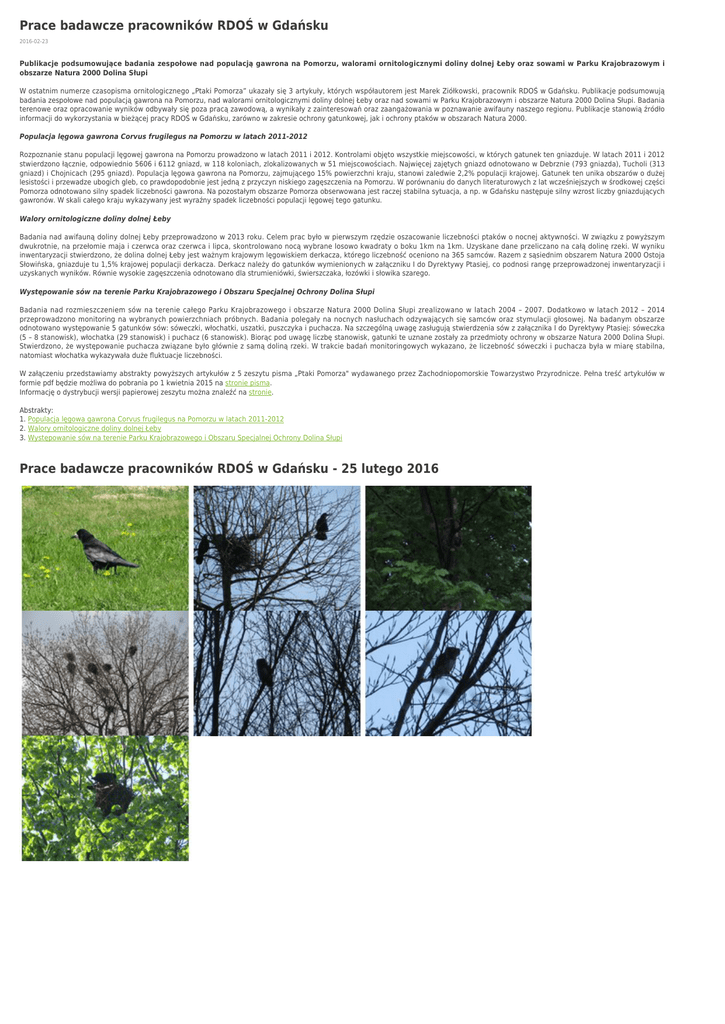 Prace badawcze pracowników RDOŚ w Gdańsku 2016-02-23 Publikacje podsumowujące badania zespołowe nad populacją gawrona na Pomorzu, walorami ornitologicznymi doliny dolnej Łeby oraz sowami w Parku Krajobrazowym i obszarze Natura 2000 Dolina Słupi W ostatnim numerze czasopisma ornitologicznego „Ptaki Pomorza” ukazały się 3 artykuły, których współautorem jest Marek Ziółkowski, pracownik RDOŚ w Gdańsku. Publikacje podsumowują badania zespołowe nad populacją gawrona na Pomorzu, nad walorami ornitologicznymi doliny dolnej Łeby oraz nad sowami w Parku Krajobrazowym i obszarze Natura 2000 Dolina Słupi. Badania terenowe oraz opracowanie wyników odbywały się poza pracą zawodową, a wynikały z zainteresowań oraz zaangażowania w poznawanie awifauny naszego regionu. Publikacje stanowią źródło informacji do wykorzystania w bieżącej pracy RDOŚ w Gdańsku, zarówno w zakresie ochrony gatunkowej, jak i ochrony ptaków w obszarach Natura 2000. Populacja lęgowa gawrona Corvus frugilegus na Pomorzu w latach 2011-2012 Rozpoznanie stanu populacji lęgowej gawrona na Pomorzu prowadzono w latach 2011 i 2012. Kontrolami objęto wszystkie miejscowości, w których gatunek ten gniazduje. W latach 2011 i 2012 stwierdzono łącznie, odpowiednio 5606 i 6112 gniazd, w 118 koloniach, zlokalizowanych w 51 miejscowościach. Najwięcej zajętych gniazd odnotowano w Debrznie (793 gniazda), Tucholi (313 gniazd) i Chojnicach (295 gniazd). Populacja lęgowa gawrona na Pomorzu, zajmującego 15% powierzchni kraju, stanowi zaledwie 2,2% populacji krajowej. Gatunek ten unika obszarów o dużej lesistości i przewadze ubogich gleb, co prawdopodobnie jest jedną z przyczyn niskiego zagęszczenia na Pomorzu. W porównaniu do danych literaturowych z lat wcześniejszych w środkowej części Pomorza odnotowano silny spadek liczebności gawrona. Na pozostałym obszarze Pomorza obserwowana jest raczej stabilna sytuacja, a np. w Gdańsku następuje silny wzrost liczby gniazdujących gawronów. W skali całego kraju wykazywany jest wyraźny spadek liczebności populacji lęgowej tego gatunku. Walory ornitologiczne doliny dolnej Łeby Badania nad awifauną doliny dolnej Łeby przeprowadzono w 2013 roku. Celem prac było w pierwszym rzędzie oszacowanie liczebności ptaków o nocnej aktywności. W związku z powyższym dwukrotnie, na przełomie maja i czerwca oraz czerwca i lipca, skontrolowano nocą wybrane losowo kwadraty o boku 1km na 1km. Uzyskane dane przeliczano na całą dolinę rzeki. W wyniku inwentaryzacji stwierdzono, że dolina dolnej Łeby jest ważnym krajowym lęgowiskiem derkacza, którego liczebność oceniono na 365 samców. Razem z sąsiednim obszarem Natura 2000 Ostoja Słowińska, gniazduje tu 1,5% krajowej populacji derkacza. Derkacz należy do gatunków wymienionych w załączniku I do Dyrektywy Ptasiej, co podnosi rangę przeprowadzonej inwentaryzacji i uzyskanych wyników. Równie wysokie zagęszczenia odnotowano dla strumieniówki, świerszczaka, łozówki i słowika szarego. Występowanie sów na terenie Parku Krajobrazowego i Obszaru Specjalnej Ochrony Dolina Słupi Badania nad rozmieszczeniem sów na terenie całego Parku Krajobrazowego i obszarze Natura 2000 Dolina Słupi zrealizowano w latach 2004 – 2007. Dodatkowo w latach 2012 – 2014 przeprowadzono monitoring na wybranych powierzchniach próbnych. Badania polegały na nocnych nasłuchach odzywających się samców oraz stymulacji głosowej. Na badanym obszarze odnotowano występowanie 5 gatunków sów: sóweczki, włochatki, uszatki, puszczyka i puchacza. Na szczególną uwagę zasługują stwierdzenia sów z załącznika I do Dyrektywy Ptasiej: sóweczka (5 – 8 stanowisk), włochatka (29 stanowisk) i puchacz (6 stanowisk). Biorąc pod uwagę liczbę stanowisk, gatunki te uznane zostały za przedmioty ochrony w obszarze Natura 2000 Dolina Słupi. Stwierdzono, że występowanie puchacza związane było głównie z samą doliną rzeki. W trakcie badań monitoringowych wykazano, że liczebność sóweczki i puchacza była w miarę stabilna, natomiast włochatka wykazywała duże fluktuacje liczebności. W załączeniu przedstawiamy abstrakty powyższych artykułów z 5 zeszytu pisma „Ptaki Pomorza" wydawanego przez Zachodniopomorskie Towarzystwo Przyrodnicze. Pełna treść artykułów w formie pdf będzie możliwa do pobrania po 1 kwietnia 2015 na stronie pisma. Informację o dystrybucji wersji papierowej zeszytu można znaleźć na stronie. Abstrakty: 1. Populacja lęgowa gawrona Corvus frugilegus na Pomorzu w latach 2011-2012 2. Walory ornitologiczne doliny dolnej Łeby 3. Występowanie sów na terenie Parku Krajobrazowego i Obszaru Specjalnej Ochrony Dolina Słupi Prace badawcze pracowników RDOŚ w Gdańsku - 25 lutego 2016