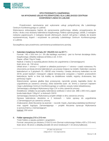 OPIS PRZEDMIOTU ZAMÓWIENIA NA WYKONANIE USŁUGI POLIGRAFICZNEJ DLA LUBELSKIEGO CENTRUM KONFERENCYJNEGO W LUBLINIE Przedmiotem zamówienia jest wykonanie usługi poligraficznej dla Lubelskiego Centrum Konferencyjnego w Lublinie. Wykonawca zobowiązany będzie do opracowania graficznego, składu, przygotowania do druku i druku oraz dostawy kalendarza książkowego, foldera operacyjnego, ulotek, 2 rodzajów notesów papierowych, 2 rodzajów teczek ofertowych, dwóch roll-up’ów i wkładu do ścianki wystawienniczej, kopert i wizytówek na potrzeby Lubelskiego Centrum Konferencyjnego w Lublinie. Szczegółowy opis przedmiotu zamówienia przedstawiono poniżej. I. Kalendarz książkowy formatu A5 145x205 mm na 2017 r. Format: 145 x 205 mm (+/- 5% dla każdego wymiaru) - jest to format dociętego bloku książkowego; okładka większa od bloku o ok. 3 mm Papier: offset 70g/m2 biały Nadruk: 2 kolory w wysokiej jakości (kolory do uzgodnienia z Zamawiającym) Ilość stron: ok. 150 stron Układ stron: 1 strona = 1 tydzień w układzie poziomym + 1 strona = część notesowa. Po otworzeniu po lewej stronie kalendarium, po prawej miejsce na notatki. Kalendarz zawiera kalendarium w 3 językach: PL–GB-DE oraz imieniny i święta, skrócony kalendarz na rok 2018, przed każdym miesiącem zdjęcie tematycznie związane z hasłem przewodnim kalendarza, kartki w linie lub kratkę na dodatkowe notatki, registry drukowane, bez perforacji rogów Wykończenie: oprawa gładka (bez przeszycia), narożniki proste, kapitałka (kolor do uzgodnienia po zawarciu umowy), złota tasiemka (szer. ok. 5mm) z czarnym napisem i logo Lubelskiego Centrum Konferencyjnego w Lublinie, wszyty notes teleadresowy. Zamawiający udostępni Wykonawcy logo LCK w dniu zawarcia umowy. Dodatkowo: wklejka na początku kalendarza wielkości 2 stron (ok. 288 x 205 mm), papier kreda biała błysk 130g/m2, w kolorach CMYK Zamawiający dostarczy Wykonawcy projekt wklejki w dniu zawarcia umowy. Oprawa kalendarza: ekoskóra w 2 kolorach – kolor oprawy do uzgodnienia z Zamawiającym po zawarciu umowy Znakowanie: złote tłoczenia na awersie – rocznik i hasło „Zasmakuj lubelskiej konferencji” oraz sygnet logotypu Zamawiającego – projekt tłoczenia opracuje Wykonawca w porozumieniu z Zamawiającym Nakład: 250 sztuk II. Folder operacyjny 210 x 210 mm Treść folderu w języku polskim i angielskim. Format: zeszytowy po złożeniu 210x210 mm (format rozłożonego folderu 420 x 210 mm) Ilość stron: 46 stron z okładką (środek 20 stron kredowych + 22 strony kalkowe). ZP.260.142.2016.KD Załącznik nr 1 do Zaproszenia Strona 1 z 5 Okładka: 4 strony Papier: kreda mat 250g/m2 lub 300g /m2 Kolor: 5/4 (CMYK + Pantone/CMYK) Uszlachetnienie: lakier UV punktowo na każdej stronie Środek: 20 stron kredowych + 22 strony kalkowe Papier: strony kredowe: kreda mat 190g/m2 lub 200g /m2 Kolor: CMYK 4+4 Uszlachetnienie: lakier wybiórczy UV strony kalkowe: papier ozdobny min.100g/m2 Kolor: CMYK 4+0 Dodatkowo: Folder klejony w grzbiet prosty o szerokości ok. 2,5 cm, w którym kartki kredowe są bigowane pojedynczo od strony grzbietu. Strony kalkowe/folia przeźroczysta są dodatkowo złączone z folderem śrubą introligatorską w lewym górnym rogu grzbietu (lub umocowane w inny sposób według propozycji Wykonawcy). Mocowanie musi być wykonane w sposób umożliwiający swobodne przesuwanie stron kalkowych. W związku z nietuzinkowym projektem Zamawiający wymaga, by przed wykonaniem folderów, Wykonawca wykonał prototyp folderu. Po uzyskaniu akceptacji Zamawiającego, Wykonawca będzie mógł wykonać wszystkie foldery, a w przypadku braku akceptacji Zamawiającego, Wykonawca zobowiązany będzie do zaproponowania innego wariantu mocowania stron kalkowych. Zamawiający dostarczy Wykonawcy projekt folderu w dniu zawarcia umowy. Przykładowa fotografia: Nakład: 3 000 sztuk Pakowanie: po 300szt w kartonowe pudełko III. Ulotka A4 składane do DL Format: A4 składane do DL Papier: kreda mat 190g/m2 ZP.260.142.2016.KD Załącznik nr 1 do Zaproszenia Strona 2 z 5 Kolor: offset CMYK 4+4 Uszlachetnienie: lakier UV punktowo na każdej stronie Dodatkowo: ulotka złożona z bigowaniem na 3 części w literę „C”, nadrukowana treść na ulotce dostosowana do złożonej ulotki. Zamawiający dostarczy Wykonawcy projekt ulotki w dniu zawarcia umowy. Nakład: 2 000 sztuk Pakowanie: po 300 sztuk w kartonowe pudełko IV. Notes- Blok papierowy A4 Format: A4 (210 x 297 mm) Papier: plecki - karton, kartki – kreda mat 100g/m2 Nadruk: offset 4+0 na każdej kartce Ilość kartek: 20 kartek + plecy wzmocnione kartonikiem Wykończenie: kartki w linię klejone u góry po krótszym boku, u góry każdej kartki logo LCK i napis „Zasmakuj lubelskiej konferencji” Zamawiający dostarczy Wykonawcy projekt notesu w dniu zawarcia umowy. Nakład: 1 000 sztuk Pakowanie: po 100 sztuk w kartonowe pudełko V. Notes- Blok papierowy A5 Format: A5 (148 x 210 mm) Papier: plecki - karton, kartki – kreda mat 100g/m2 Nadruk: offset 4+0 na każdej kartce Ilość kartek: 20 kartek + plecy wzmocnione kartonikiem Wykończenie: kartki w linię klejone u góry po krótszym boku, u góry każdej kartki logo LCK i napis „Zasmakuj lubelskiej konferencji” Zamawiający dostarczy Wykonawcy projekt notesu w dniu zawarcia umowy. Nakład: 500 sztuk Pakowanie: po 50 sztuk w kartonowe pudełko VI. Teczka ofertowa turkusowa Teczka w dwóch wersjach językowych PL/ENG Format: 220 x 307 mm (+/- 5% dla każdego wymiaru), tak aby można było swobodnie włożyć kartkę papieru formatu A4 Skrzydełka: 2, w tym jedno z wycięciem na wizytówkę, z możliwością regulowanej grubości o ok. 5 mm Grzbiet: ok. 5 mm; maksymalna grubość grzbietu pozwoli zmieścić przynajmniej 70 kartek Papier: karton 300g/m2 Nadruk: offset jednostronny w pełnym kolorze CMYK 4+0 (okładki przód i tył, środek biały). Kolory zgodnie z SIW LCK. Ilość stron: 4 Zamawiający dostarczy Wykonawcy projekt teczki