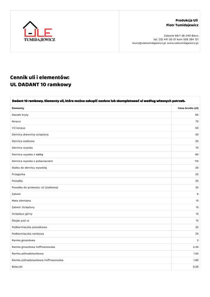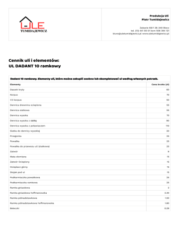 Cennik uli i elementów: UL DADANT 10 ramkowy