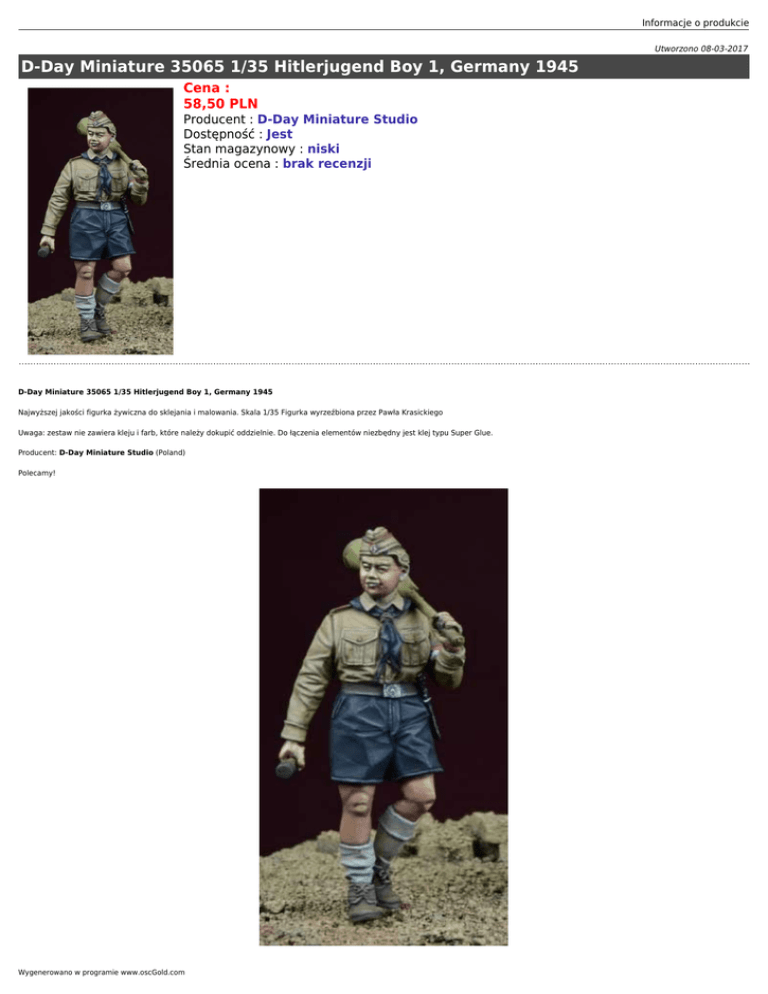 Informacje o produkcie Utworzono 08-03-2017 D-Day Miniature 35065 1/35 Hitlerjugend Boy 1, Germany 1945 Cena : 58,50 PLN Producent : D-Day Miniature Studio Dostępność : Jest Stan magazynowy : niski Średnia ocena : brak recenzji D-Day Miniature 35065 1/35 Hitlerjugend Boy 1, Germany 1945 Najwyższej jakości figurka żywiczna do sklejania i malowania. Skala 1/35 Figurka wyrzeźbiona przez Pawła Krasickiego Uwaga: zestaw nie zawiera kleju i farb, które należy dokupić oddzielnie. Do łączenia elementów niezbędny jest klej typu Super Glue. Producent: D-Day Miniature Studio (Poland) Polecamy! Wygenerowano w programie www.oscGold.com Ważne informacje: - Całkowita cena niniejszego przedmiotu wraz z kosztami przesyłki będzie widoczna po "wrzuceniu" go do koszyka. - Zamówione towary wysyłamy w ciągu 3 dni. Wyjątkiem są przedmioty, gdzie w oknie "Dostępność" jest podany termin oznaczający, że towar będzie sprowadzony na indywidualne zamówienie klienta. Jeśli zamówione zostaną przedmioty dostępne "od ręki" oraz te "na zamówienie" termin wysyłki ulegnie zmianie o czas potrzebny na sprowadzenie towaru. - Wszystkie dostępne w naszym sklepie formy płatności są widoczne w regulaminie sklepu oraz po przejściu do koszyka.