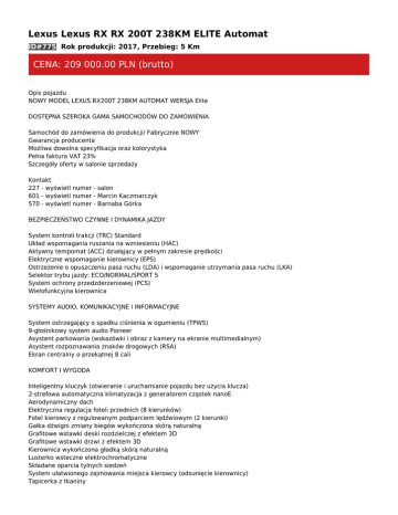 Lexus Lexus RX RX 200T 238KM ELITE Automat ID#775 Rok produkcji: 2017, Przebieg: 5 Km CENA: 209 000.00 PLN (brutto) Opis pojazdu NOWY MODEL LEXUS RX200T 238KM AUTOMAT WERSJA Elite DOSTĘPNA SZEROKA GAMA SAMOCHODÓW DO ZAMÓWIENIA Samochód do zamówienia do produkcji/ Fabrycznie NOWY Gwarancja producenta Możliwa dowolna specyfikacja oraz kolorystyka Pełna faktura VAT 23% Szczegóły oferty w salonie sprzedaży Kontakt 227 - wyświetl numer - salon 601 - wyświetl numer - Marcin Kaczmarczyk 570 - wyświetl numer - Barnaba Górka BEZPIECZEŃSTWO CZYNNE I DYNAMIKA JAZDY System kontroli trakcji (TRC) Standard Układ wspomagania ruszania na wzniesieniu (HAC) Aktywny tempomat (ACC) działąjący w pełnym zakresie prędkości Elektryczne wspomaganie kierownicy (EPS) Ostrzeżenie o opuszczeniu pasa ruchu (LDA) i wspomaganie utrzymania pasa ruchu (LKA) Selektor trybu jazdy: ECO/NORMAL/SPORT S System ochrony przedzderzeniowej (PCS) Wielofunkcyjna kierownica SYSTEMY AUDIO, KOMUNIKACYJNE I INFORMACYJNE System ostrzegający o spadku ciśnienia w ogumieniu (TPWS) 9-głośnikowy system audio Pioneer Asystent parkowania (wskazówki i obraz z kamery na ekranie multimedialnym) Asystent rozpoznawania znaków drogowych (RSA) Ekran centralny o przekątnej 8 cali KOMFORT I WYGODA Inteligentny kluczyk (otwieranie i uruchamianie pojazdu bez użycia klucza) 2-strefowa automatyczna klimatyzacja z generatorem cząstek nanoE Aerodynamiczny dach Elektryczna regulacja foteli przednich (8 kierunków) Fotel kierowcy z regulowanym podparciem lędźwiowym (2 kierunki) Gałka dźwigni zmiany biegów wykończona skórą naturalną Grafitowe wstawki deski rozdzielczej z efektem 3D Grafitowe wstawki drzwi z efektem 3D Kierownica wykończona gładką skórą naturalną Lusterko wsteczne elektrochromatyczne Składane oparcia tylnych siedzeń System ułatwionego zajmowania miejsca kierowcy (odsunięcie kierownicy) Tapicerka z tkaniny Zegarek analogowy (ustawiany manualnie) Zestaw naprawczy WYPOSAŻENIE ZEWNĘTRZNE Światła przeciwmgielne LED Dwie końcówki układu wydechowego Lusterka boczne elektrycznie składane, podgrzewane z funkcją zmiany pola widzenia podczas cofania Przedni grill z poziomymi poprzeczkami Przyciemniane szyby Przyciemniane szyby atermiczne z filtrem promieniowania ultrafioletowego (UV) Przyciemniane szyby: tylna oraz tylne boczne Reflektory przednie LED z trzema soczewkami w kształcie litery "L" z automatycznym wyłącznikiem świateł drogowych Relingi dachowe Sekwencyjne diodowe kierunkowskazy LED Światła do jazdy dziennej LED System antykradzieżowy z syreną, immobilizerem, czujnikiem przechyłu i czujnikiem ruchu wewnątrz pojazdu Tylne światła LED z sekwencyjnymi kierunkowskazami Wycieraczki szyby czołowej z czujnikiem deszczu KOŁA I OPONY 7-ramienne obręcze kół ze stopów lekkich (235/65 R18) Niniejsze ogłoszenie jest wyłącznie informacją handlową i nie stanowi oferty w myśl art. 66, § 1. Kodeksu Cywilnego.Sprzedający nie odpowiada za ewentualne błędy lub nieaktualność ogłoszenia. Informacje umieszczone w ogłoszeniu, służą jedynie celom informacyjnym. GRUPA PRO-CAR Sp. z o.o. Niezależny Dealer Audi i Volvo 03-128 Warszawa, ul. Świderska 109F lok. 7 NIP: 524-26-19-332, REGON: 1410664403, KRS: 0000286534 Sąd Rejonowy dla M. St. Warszawy w Warszawie, XIII Wydział Gospodarczy KRS Salon: 05-090 Warszawa - Janki, ul. Sezamkowa 2, tel. (22) 711 64 64