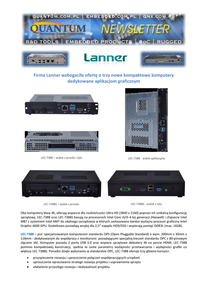 Firma Lanner wzbogaciła ofertę o trzy nowe kompaktowe komputery dedykowane aplikacjom graficznym LEC-7388 – widok z przodu i tyłu LEC-7388 - widok aplikacyjny LEC-7388S – widok z przodu LEC-7388S - widok z tyłu Oba komputery klasy 4k, oferują wsparcie dla rozdzielczości Ultra HD (3840 x 2160) poprzez ich unikalną konfigurację sprzętową. LEC-7388 oraz LEC-7388S bazują na procesorach Intel Core i3/i5 4-tej generacji (Haswell) i chipsecie Intel M87 z systemem Intel AMT do zdalnego zarządzania w których zastosowano bardzo wydajny procesor graficzny Intel Graphic 4600 GPU. Dodatkowo posiadają wnękę dla 2,5” napędu HDD/SSD i wspierają pamięć DDR3L (max. 16GB). LEC-7388 – jest specjalizowanym komputerem standardu OPS (Open Pluggable Standard) o wym. 200mm x 30mm x 118mm - dedykowanym do współpracy z monitorami posiadającymi specjalną kieszeń standardu OPC z 80-pinowym złączem JAE. Komputer posiada 2 porty USB 3.0 oraz wspiera sprzętowe dekodery 4k na porcie HDMI. LEC-7388 pomimo kompaktowej konstrukcji, spełnia te same parametry wydajności przetwarzania i wydajności grafiki co większy LEC-7388S. Ponadto dzięki wykonaniu w standardzie OPC, LEC-7388 oferuje trzy główne korzyści: przyspieszenie rozwoju i uproszczenie połączeń współpracujących urządzeń uproszczenie opracowania strategii rozwoju projektu i usprawnienia sprzętu ułatwienie przyszłego rozwoju i skalowalność projektu LEC-7388S – kompaktowy komputer przemysłowy przeznaczony do aplikacji graficznych, oferuje takie samo wsparcie na dwu portach HDMI oraz DisplayPort. Ponadto posiada 3 porty USB 3.0 , 2 porty USB 2.0 oraz gniazdo mini-PCIe dla kart SIM. Komputery skonstruowane są tak, by dostarczyć wystarczająco dużej wydajności i niezawodności pracy dla aplikacji Ultra HD, takich jak: prezentacja obrazów wysokiej rozdzielczości, aplikacje nadzoru video oraz tablice interaktywne standardu UHD. Komputer ze wsparciem grafiki 1080p HD - na procesorach Freescale™ serii i.MX 6 LEC-7001 jest pierwszym bez wentylatorowym kompaktowym komputerem firmy Lanner, bazujący na procesorze architektury RISC, dedykowanym dla aplikacji graficznych gdzie wymagana jest zarówno duża wydajność oraz niskie zużyciu energii. Aby osiągnąć taki kompromis - wybrano bardzo efektywne procesory firmy Freescale's serii i.MX 6, bazujące na rdzeniach ARM® Coretex™-A9. Procesory te występują w odmianach jedno/dwu/cztero rdzeniowych, co daje duże możliwości skalowania wydajności komputera w zależności od potrzeb poszczególnych aplikacji. Zastosowane procesory pozwoliły na wykonanie bardzo wszechstronnego komputera cechującego się bardzo małym zużyciem energii, wydajną grafiką z pełnym wsparciem grafiki standardu HD multi-stream z rozdzielczością 1080p przy 60 fps oraz wydajnym systemem dekodowania. LEC-7001 przystosowany jest do pracy w szerokim zakresie temperatur. Cechy te pozwalają na zastosowanie go w aplikacjach pracujących w trudnych warunkach eksploatacyjnych jakimi są np. cyfrowe video rejestratory. Wspierane S/O to Android 4.2, Ubuntu dystrybucji Freescale, podstawowy Linux dystrybucji Lanner/Freescale. Główne zalety komputera LEC-7001, to: kompaktowa konstrukcja o wym. 140mm x 110mm x 26mm i wadze 0.5Kg obudowa standard SGCC (blacha stalowa, galwanizowana cynkiem) łatwy dostęp do gniazda SD 4GB wbudowanej pamięci typu eMMC port HDMI x 1 port GbE x 1 porty USB 2.0 x 2 zasilanie kablem przykręcanym z blokadą wiele opcji mocowania, kombinacje procesorów jedno/dwu i czterordzeniowych W celu uzyskania szczegółowych informacji na temat powyższego producenta oraz naszej oferty, prosimy odwiedzić naszą stronę internetową: www.quantum.com.pl, bądź skontaktować się z naszymi specjalistami pod adresem poczty elektronicznej [email protected] lub telefonicznie dzwoniąc na nr tel.: (71) 362-63-56. Niniejsza korespondencja ma charakter informacyjny i w myśl ustawy z dn. 18 lipca 2002 r. o świadczeniu usług drogą elektroniczną (Dz. U. 2002 nr 144 poz. 1204) nie stanowi oferty handlowej, a jest jedynie zaproszeniem do rozmów w myśl art. 71 KC. Jeśli nie życzą sobie Państwo otrzymywać informacji tego typu od naszej firmy, prosimy o przesłanie odpowiedzi na ten list, ze słowem ‘NIE’ w temacie.