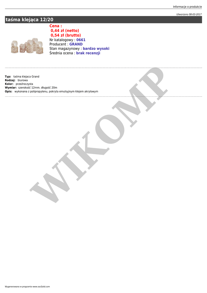 Informacje o produkcie Utworzono 08-03-2017 taśma klejąca 12/20 Cena : 0,44 zł (netto) 0,54 zł (brutto) W IK O M Typ: taśma klejaca Grand Rodzaj: biurowa Kolor: przeźroczysta Wymiar: szerokość 12mm. długość 20m Opis: wykonana z polipropylenu, pokryta emulsyjnym klejem akrylowym P Nr katalogowy : 0661 Producent : GRAND Stan magazynowy : bardzo wysoki Średnia ocena : brak recenzji Wygenerowano w programie www.oscGold.com