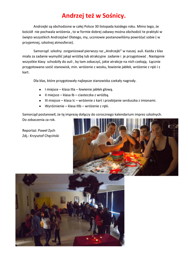 Andrzej też w Sośnicy. Andrzejki są obchodzone w całej Polsce 30 listopada każdego roku. Mimo tego, że kościół nie pochwala wróżenia , to w formie dobrej zabawy można obchodzid te praktyki w święto wszystkich Andrzejów! Dlatego, my, uczniowie postanowiliśmy powróżyd sobie ( w przyjemnej, szkolnej atmosferze). Samorząd szkolny zorganizował pierwszy raz „Andrzejki” w naszej auli. Każda z klas miała za zadanie wymyślid jakąś wróżbę lub atrakcyjne zadanie i je przygotowad . Następnie wszystkie klasy schodziły do auli , by tam zobaczyd, jakie atrakcje na nich czekają. Łącznie przygotowano sześd stanowisk, min. wróżenie z wosku, łowienie jabłek, wróżenie z ręki i z kart. Dla klas, które przygotowały najlepsze stanowiska czekały nagrody. I miejsce – klasa IIIa – łowienie jabłek głową. II miejsce – klasa Ib – ciasteczka z wróżbą. III miejsce – klasa Ic – wróżenie z kart i przebijanie serduszka z imionami. Wyróżnienie – klasa IIIb – wróżenie z ręki. Samorząd postanowił, że tę imprezę dołączy do corocznego kalendarium imprez szkolnych. Do zobaczenia za rok. Reportaż: Paweł Zych Zdj.: Krzysztof Chęcioski