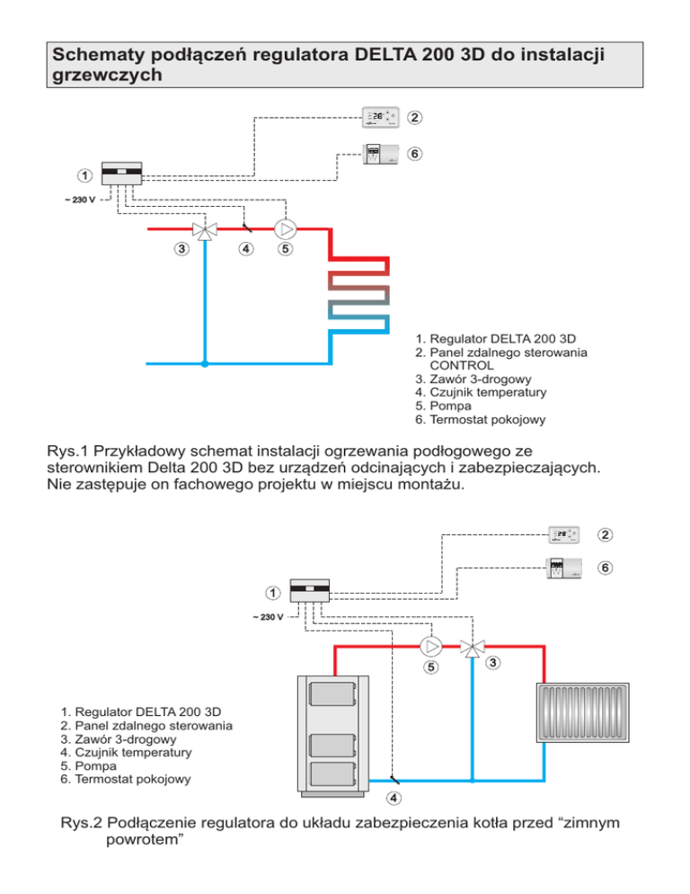 Schematy pod³¹czeñ regulatora DELTA 200 3D do instalacji grzewczych 2 1 12 24 AUTO MANU PROG - 6 P T + 1 ~ 230 V 3 4 5 1. Regulator DELTA 200 3D 2. Panel zdalnego sterowania CONTROL 3. Zawór 3-drogowy 4. Czujnik temperatury 5. Pompa 6. Termostat pokojowy Rys.1 Przyk³adowy schemat instalacji ogrzewania pod³ogowego ze sterownikiem Delta 200 3D bez urz¹dzeñ odcinaj¹cych i zabezpieczaj¹cych. Nie zastêpuje on fachowego projektu w miejscu monta¿u. 2 1 12 24 AUTO MANU PROG P T - + 6 1 ~ 230 V 5 3 1. Regulator DELTA 200 3D 2. Panel zdalnego sterowania 3. Zawór 3-drogowy 4. Czujnik temperatury 5. Pompa 6. Termostat pokojowy 4 Rys.2 Pod³¹czenie regulatora do uk³adu zabezpieczenia kot³a przed “zimnym powrotem” 1. Regulator DELTA 200 3D 2. Panel zdalnego sterowania 3. Zawór 3-drogowy 4. Czujnik temperatury 1 5. Pompa ~ 230 V 6. Termostat pokojowy 2 1 12 24 AUTO MANU PROG P T - 3 4 + 6 5 Rys.3 Pod³¹czenie regulatora do instalacji ogrzewania pod³ogowego z kot³em gazowym i sprzêg³em hydraulicznym