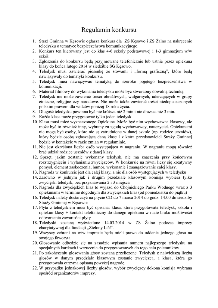 Regulamin konkursu 1. Straż Gminna w Kęsowie ogłasza konkurs dla ZS Kęsowo i ZS Żalno na nakręcenie teledysku o tematyce bezpieczeństwa komunikacyjnego. 2. Konkurs ten kierowany jest do klas 4-6 szkoły podstawowej i 1-3 gimnazjum w/w szkół. 3. Zgłoszenia do konkursu będą przyjmowane telefonicznie lub ustnie przez opiekuna klasy do końca lutego 2014 w siedzibie SG Kęsowo. 4. Teledysk musi zawierać piosenkę ze słowami i „formą graficzną”, które będą nawiązywały do tematyki konkursu. 5. Teledysk musi nawiązywać tematyką do szeroko pojętego bezpieczeństwa w komunikacji. 6. Materiał filmowy do wykonania teledysku może być stworzony dowolną techniką. 7. Teledysk nie może zawierać treści obraźliwych, wulgarnych, uderzających w grupy etniczne, religijne czy narodowe. Nie może także zawierać treści niedopuszczonych polskim prawem dla widzów poniżej 18 roku życia. 8. Długość teledysku powinna być nie krótsza niż 2 min i nie dłuższa niż 3 min. 9. Każda klasa może przygotować tylko jeden teledysk 10. Klasa musi mieć wyznaczonego Opiekuna. Może być nim wychowawca klasowy, ale może być to również inny, wybrany za zgodą wychowawcy, nauczyciel. Opiekunami nie mogą być osoby, które nie są zatrudnione w danej szkole (np. rodzice uczniów), który będzie osobą zgłaszającą daną klasę i z którą przedstawiciel Straży Gminnej będzie w kontakcie w razie zmian w regulaminie. 11. Nie jest określona liczba osób występująca w nagraniu. W nagraniu mogą również brać udział rodzice uczniów z danej klasy. 12. Sprzęt, jakim zostanie wykonany teledysk, nie ma znaczenia przy końcowym rozstrzygnięciu i wyłanianiu zwycięzców. W konkursie na równi liczy się kreatywny pomysł, element zaskoczenia, humor, wykonanie i zaangażowanie całej klasy. 13. Nagroda w konkursie jest dla całej klasy, a nie dla osób występujących w teledysku 14. Zarówno w jednym jak i drugim przedziale klasowym komisja wybiera tylko zwycięski teledysk, bez przyznawania 2 i 3 miejsca 15. Nagroda dla zwycięskich klas to wyjazd do Chojnickiego Parku Wodnego wraz z 3 opiekunami w terminie dogodnym dla zwycięskich klas (od poniedziałku do piątku) 16. Teledysk należy dostarczyć na płycie CD do 7 marca 2014 do godz. 14:00 do siedziby Straży Gminnej w Kęsowie 17. Płyta z teledyskiem musi być opisana: klasa, która przygotowała teledysk, szkoła i opiekun klasy + kontakt telefoniczny do danego opiekuna w razie braku możliwości odtworzenia zawartości płyty 18. Teledyski zostaną wyświetlone 14.03.2014 w ZS Żalno podczas imprezy charytatywnej dla fundacji „Zielony Liść”. 19. Wszyscy zebrani na w/w imprezie będą mieli prawo do oddania jednego głosu na swojego faworyta. 20. Głosowanie odbędzie się na zasadzie wpisania numeru najlepszego teledysku na specjalnych kartkach i wrzucenie do przygotowanych do tego celu pojemników. 21. Po zakończeniu głosowania głosy zostaną przeliczone. Teledysk z największą liczbą głosów w danym przedziale klasowym zostanie zwycięzcą, a klasa, która go przygotowała otrzyma opisaną powyżej nagrodę. 22. W przypadku jednakowej liczby głosów, wybór zwycięzcy dokona komisja wybrana spośród organizatorów imprezy. 23. Organizator z chwilą otrzymania formularza zgłoszeniowego od opiekuna grupy nabywa autorskie prawa majątkowe do nagrodzonych prac, w zakresie, w jakim mogą one stanowić przedmiot prawa autorskiego. 24. Wyniki konkursu zostaną ogłoszone 17.03.2014 na apelach szkolnych. 25. Przekazanie przez opiekuna zgłoszenia konkursowego jest jednoczesną akceptacją wszystkich postanowień niniejszego Regulaminu. 26. Organizator zastrzega sobie prawo do niedopuszczenia zgłoszonej pracy do konkursu w przypadku naruszenia któregokolwiek z punktów regulaminu. 27. Organizator zastrzega sobie zmian w w/w regulaminie. 28. We wszystkich kwestiach nieuregulowanych niniejszym Regulaminem decyzje podejmuje Organizator Konkursu.