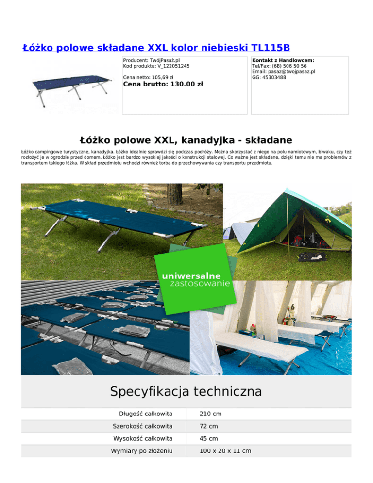Łóżko polowe składane XXL kolor niebieski TL115B Producent: TwójPasaż.pl Kod produktu: V_122051245 Kontakt z Handlowcem: Tel/Fax: (68) 506 50 56 Email: [email protected] GG: 45303488 Cena netto: 105,69 zł Cena brutto: 130.00 zł Łóżko polowe XXL, kanadyjka - składane Łóżko campingowe turystyczne, kanadyjka. Łóżko idealnie sprawdzi się podczas podróży. Można skorzystać z niego na polu namiotowym, biwaku, czy też rozłożyć je w ogrodzie przed domem. Łóżko jest bardzo wysokiej jakości o konstrukcji stalowej. Co ważne jest składane, dzięki temu nie ma problemów z transportem takiego łóżka. W skład przedmiotu wchodzi również torba do przechowywania czy transportu przedmiotu. Specyfikacja techniczna Długość całkowita 210 cm Szerokość całkowita 72 cm Wysokość całkowita 45 cm Wymiary po złożeniu 100 x 20 x 11 cm Powierzchnia spania Udźwig Wymiary elementów stelaża Kolor konstrukcji Kolor materiału W zestawie Gwarancja Waga łóżka 205 x 80,5cm 150kg 2,5 x 2,5 cm aluminiowy niebieski łóżko, torba do przechowywania / przenoszenia 24 miesiące 7,5 kg Galeria Kod produktu:V_122051245 ID produktu:148930 Granos Group sp. z o.o. ul. Sulechowska 4a budynek 45 65-001 Zielona Góra