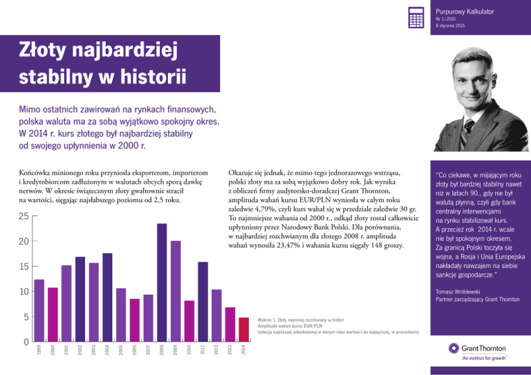 Purpurowy Kalkulator Nr 1/2015 8 stycznia 2015 Złoty najbardziej stabilny w historii Mimo ostatnich zawirowań na rynkach finansowych, polska waluta ma za sobą wyjątkowo spokojny okres. W 2014 r. kurs złotego był najbardziej stabilny od swojego upłynnienia w 2000 r. Końcówka minionego roku przyniosła eksporterom, importerom i kredytobiorcom zadłużonym w walutach obcych sporą dawkę nerwów. W okresie świątecznym złoty gwałtownie stracił na wartości, sięgając najsłabszego poziomu od 2,5 roku. Okazuje się jednak, że mimo tego jednorazowego wstrząsu, polski złoty ma za sobą wyjątkowo dobry rok. Jak wynika z obliczeń firmy audytorsko-doradczej Grant Thornton, amplituda wahań kursu EUR/PLN wyniosła w całym roku zaledwie 4,79%, czyli kurs wahał się w przedziale zaledwie 30 gr. To najmniejsze wahania od 2000 r., odkąd złoty został całkowicie upłynniony przez Narodowy Bank Polski. Dla1999 porównania, 12,34 10,76 w najbardziej rozchwianym dla złotego 2008 r.2000 amplituda 2001 wahań wynosiła 23,47% i wahania kursu sięgały 148 15,18 groszy. 2002 16,86 25 20 2003 15,68 2004 17,56 2005 10,60 2006 8,52 2007 9,36 2008 23,47 2009 20,06 2010 8,17 2011 15,86 2012 10,35 Wykres 1. Złoty najmniej rozchwiany w histori 2013 6,84 Amplituda wahań kursu EUR/PLN 4,79 (relacja najniższej odnotowanej w danym roku wartości 2014 do najwyższej, w procentach) 15 10 2014 2013 2012 2011 2010 2009 2008 2007 2006 2005 2004 2003 2002 2001 2000 0 1999 5 “Co ciekawe, w mijającym roku złoty był bardziej stabilny nawet niż w latach 90., gdy nie był walutą płynną, czyli gdy bank centralny interwencjami na rynku stabilizował kurs. A przecież rok 2014 r. wcale nie był spokojnym okresem. Za granicą Polski toczyła się wojna, a Rosja i Unia Europejska nakładały nawzajem na siebie sankcje gospodarcze.” Tomasz Wróblewski Partner zarządzający Grant Thornton Purpurowy Kalkulator Nr 1/2015 8 stycznia 2015 Złoty najbardziej stabilny w historii Przez wiele lat normą było, że polski złoty był jedną z najbardziej chwiejnych walut regionu, a często nawet świata. Wykres 2. Polska walutową oazą spokoju Amplituda wahań kursów poszczególnych walut w relacji do EUR w 2014 r. (w proc.) “Najbardziej rozchwianą walutą był w tym roku rosyjski rubel, który stracił w tym okresie około połowy swojej wartości” 60 50 Tomasz Wróblewski Partner zarządzający Grant Thornton 40 30 20 10 Rosja (RUB) Ukraina (UAH) Norwegia (NOK) Turcja (TRY Szewcja (SEK) WIelka Brytania (GBP) Węgry (HUF) Islandia (ISK) Polska (PLN) Rumunia (RON) 0 Czechy (CZK) Polska ma bowiem znacznie większy, a zatem i znacznie bardziej płynny rynek walutowy niż np. Czechy czy Węgry, dlatego złoty bardziej przyciągał zagranicznych, krótkoterminowych inwestorów. Kurs naszej waluty był przez to znacznie bardziej podatny na światowe zawirowania niż czeska korona czy węgierski forint. W ostatni roku to się jednak zmieniło – złoty był jedną z najbardziej stabilnych walut w Europie. Wyprzedził pod tym względem m.in. brytyjskiego funta, szwedzką i norweską koronę oraz turecką lirę. Mniejszą amplitudę wahań niż złoty miały w Europie tylko czeska korona i rumuński lej (nie licząc walut niepłynnych, czyli stabilizowanych przez bank centralny). Purpurowy Kalkulator Nr 1/2015 8 stycznia 2015 Złoty najbardziej stabilny w historii ? Skąd wzięła się ta wyjątkowa stabilność złotego w 2014 r.? Po pierwsze, ostatni rok – mimo poważnych wstrząsów w otoczeniu międzynarodowych – był udany dla polskiej gospodarki. Wzrost gospodarczy przyspieszył, a sytuacja na rynku pracy i w finansach publicznych się poprawiła. Te pozytywne tendencje wpłynęły na ustabilizowanie się kursu złotego – przekonuje Tomasz Wróblewski. Jego zdaniem, drugi powód jest jednak jeszcze ważniejszy. ? Czy ustabilizowanie się złotego będzie trwałe? Czy to tylko jednorazowa sytuacja? - To zależy przede wszystkim od tego, jak potoczy się sytuacja w polskiej gospodarce. Jeżeli nadal nasz PKB będzie rósł szybciej niż krajów Zachodnich, a polityka gospodarcza będzie prowadzona odpowiedzialnie i racjonalnie, to sądzę, że złoty będzie walutą stabilną, a inwestycje w polskie aktywa będą uznawane przez inwestorów za coraz bardziej bezpiecznie – mówi Tomasz Wróblewski. Tomasz Wróblewski Partner zarządzający Grant Thornton - Polska, dzięki swoim dobrym wynikom gospodarczym w ostatnich latach, wzmacnia swoją wiarygodność na międzynarodowych rynkach finansowych. Duża odporność naszej gospodarki na zewnętrzne zawirowania koniunktury sprawiła, że inwestorzy coraz bardziej postrzegają nasz kraj jako stabilny rynek rozwinięty, a coraz mniej traktują nas jako chwiejny, kapryśny rynek wschodzący. Dlatego w ostatnich latach przenoszą złotego do „wyższej ligi”, czyli do koszyka walut dojrzałych. Kontakt dla mediów: Jacek Kowalczyk T 22 205 48 41 M 505 024 168 E [email protected]