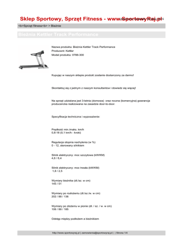 Utworzono: czwartek, 16 lipiec 2015 Sklep Sportowy, Sprzęt Fitness - www.SportowyRaj.pl <b>Sprzęt fitness<b> > Bieżnie Bieżnia Kettler Track Performance Nazwa produktu: Bieżnia Kettler Track Performance Producent: Kettler Model produktu: 0788-300 Kupując w naszym sklepie produkt zostanie dostarczony za darmo! Skontaktuj się z jednym z naszym konsultantow i dowiedz się więcej! Na sprzęt udzielana jest 3-letnia (domowa) oraz roczna (komercyjna) gwarancja producencka realizowana na zasadzie door-to-door. Specyfikacja techniczna i wyposażenie: Prędkość min./maks. km/h 0,8-18 (0,1 km/h - kroki) Regulacja stopnia nachylenia (w %) 0 - 12, sterowany silnikiem Silnik elektryczny: moc szczytowa (kW/KM) 4,6 / 6,4 Silnik elektryczny: moc trwała (kW/KM) 1,8 / 2,5 Wymiary bieżnika (dł./sz. w cm) 145 / 51 Wymiary po rozłożeniu (dł./sz./w. w cm) 202 / 88 / 136 Wymiary po złożeniu w pionie (dł. / sz. / w. w cm) 106 / 88 / 185 Odstęp między podłożem a bieżnikiem http://www.sportowyraj.pl | [email protected] | | Strona 1/4 Utworzono: czwartek, 16 lipiec 2015 Sklep Sportowy, Sprzęt Fitness - www.SportowyRaj.pl <b>Sprzęt fitness<b> > Bieżnie Bieżnia Kettler Track Performance 16,5 cm Maks. obciążenie wagowe 140 kg Klucz bezpieczeństwa Kołka transportowe System EASY ROLLER System amortyzacji SHOCK ABSORBER Układ sterowania silnika SRS (niezależna od wagi regulacja elektroniczna) Wyrownanie wysokości Zasilanie sieciowe 230 V / 50 Hz Klawiatura Komfortowe przyciski/folia odporna na pot Waga 130 kg Funkcje komputera: Całkowita liczba kilometrow Kompatybilny z systemem POLAR odbiornik tętna, 5kHz, zintegrowany (opcjonalnie pas telemetryczny) Pomiar czasu, dystansu http://www.sportowyraj.pl | [email protected] | | Strona 2/4 Utworzono: czwartek, 16 lipiec 2015 Sklep Sportowy, Sprzęt Fitness - www.SportowyRaj.pl <b>Sprzęt fitness<b> > Bieżnie Bieżnia Kettler Track Performance Pomiar prędkości, zużycia energii Pamięć osob 4 Funkcja schładzania / rozgrzewki Funkcja schładzania dla trybu wyścigowego Pomiar tętna W zestawie czujniki tętna w uchwytach, opcjonalnie pas na klatkę piersiową Pomiar tętna w fazie spoczynku z oceną sprawności Programy sterowane nachyleniem 6 Programy sterowane prędkością 6 Programy sterowane tętnem 4 Sterowanie parametrami Sterowanie ręczne (count-up / count-down) Stopień nachylenia Wybor kąta nachylenia 3-krotnie Direct Incline Wybor prędkości 3-krotnie Direct Speed Wyświetlacz 7 funkcji http://www.sportowyraj.pl | [email protected] | | Strona 3/4 Utworzono: czwartek, 16 lipiec 2015 Sklep Sportowy, Sprzęt Fitness - www.SportowyRaj.pl <b>Sprzęt fitness<b> > Bieżnie Bieżnia Kettler Track Performance Wyświetlacz / graficzna prezentacja obciążenia Matryca 3D-Black z zielonym podświetleniem Złącze PC USB Cena: 8299.00zł Dostępność: Ten produkt został dodany do sklepu w dniu środa, 13 październik 2010 http://www.sportowyraj.pl | [email protected] | | Strona 4/4