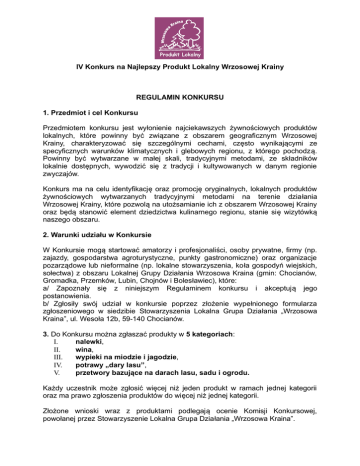 IV Konkurs na Najlepszy Produkt Lokalny Wrzosowej Krainy REGULAMIN KONKURSU 1. Przedmiot i cel Konkursu Przedmiotem konkursu jest wyłonienie najciekawszych żywnościowych produktów lokalnych, które powinny być związane z obszarem geograficznym Wrzosowej Krainy, charakteryzować się szczególnymi cechami, często wynikającymi ze specyficznych warunków klimatycznych i glebowych regionu, z którego pochodzą. Powinny być wytwarzane w małej skali, tradycyjnymi metodami, ze składników lokalnie dostępnych, wywodzić się z tradycji i kultywowanych w danym regionie zwyczajów. Konkurs ma na celu identyfikację oraz promocję oryginalnych, lokalnych produktów żywnościowych wytwarzanych tradycyjnymi metodami na terenie działania Wrzosowej Krainy, które pozwolą na utożsamianie ich z obszarem Wrzosowej Krainy oraz będą stanowić element dziedzictwa kulinarnego regionu, stanie się wizytówką naszego obszaru. 2. Warunki udziału w Konkursie W Konkursie mogą startować amatorzy i profesjonaliści, osoby prywatne, firmy (np. zajazdy, gospodarstwa agroturystyczne, punkty gastronomiczne) oraz organizacje pozarządowe lub nieformalne (np. lokalne stowarzyszenia, koła gospodyń wiejskich, sołectwa) z obszaru Lokalnej Grupy Działania Wrzosowa Kraina (gmin: Chocianów, Gromadka, Przemków, Lubin, Chojnów i Bolesławiec), które: a/ Zapoznały się z niniejszym Regulaminem konkursu i akceptują jego postanowienia. b/ Zgłosiły swój udział w konkursie poprzez złożenie wypełnionego formularza zgłoszeniowego w siedzibie Stowarzyszenia Lokalna Grupa Działania „Wrzosowa Kraina”, ul. Wesoła 12b, 59-140 Chocianów. 3. Do Konkursu można zgłaszać produkty w 5 kategoriach: I. nalewki, II. wina, III. wypieki na miodzie i jagodzie, IV. potrawy „dary lasu”, V. przetwory bazujące na darach lasu, sadu i ogrodu. Każdy uczestnik może zgłosić więcej niż jeden produkt w ramach jednej kategorii oraz ma prawo zgłoszenia produktów do więcej niż jednej kategorii. Złożone wnioski wraz z produktami podlegają ocenie Komisji Konkursowej, powołanej przez Stowarzyszenie Lokalna Grupa Działania „Wrzosowa Kraina”. 4. Miejsce i termin składania zgłoszeń konkursowych Produkty do Konkursu należy zgłosić do 04 września 2011 (niedziela) osobiście, e-mailem, faxem lub listownie na adres: Stowarzyszenie Lokalna Grupa Działania „Wrzosowa Kraina”, ul. Wesoła 12b, 59140 Chocianów, tel./fax 76/818 45 41, kom. 500 206 128, e-mail: [email protected], [email protected] W tym celu można skorzystać z gotowego formularza, który będzie dostępny w siedzibie LGD Wrzosowa Kraina (ul. Wesoła 12b, 59-140 Chocianów) oraz na stronie internetowej www.WrzosowaKraina.pl. W przypadku braku dostępu do gotowych formularzy prosimy o uwzględnienie w zgłoszeniu informacji nt nazwy produktu, kategorii w której produkt jest zgłaszany do Konkursu, opisu składników, metod produkcji i historii produktu oraz danych zgłaszającego (imię nazwisko, adres, gmina, telefon). Produkty, które nie zostaną zgłoszone w wymaganym terminie oraz bez opisów nie będą brane pod uwagę w Konkursie. Gotowe produkty do Konkursu należy przynieść w dniu 14 września 2011 (środa), w godz. 8.00 – 11.00 do biura Stowarzyszenia LGD Wrzosowa Kraina, ul. Wesoła 12 b, 59-140 Chocianów) a/ Produkty do dwóch pierwszych kategorii oraz piątej („nalewka”, „wino” oraz „przetwory”) należy dostarczyć w szczelnie zamkniętych butelkach oraz w butelce mniejszej, przeznaczonej do degustacji Komisji Konkursowej. b/ Produkty w kategorii „wypieki na miodzie i jagodzie” oraz potrawy „dary lasu” należy dostarczyć w całości, uwzględniając konieczność przygotowania małych porcji dla Komisji Konkursowej. W trakcie oceny zgłoszonych produktów będą wykonywane zdjęcia do ewentualnego wykorzystania do planowanych przez Stowarzyszenie Lokalna Grupa Działania „Wrzosowa Kraina” publikacji. 5. Kryteria oceniania i punktacja Komisja Konkursowa powołana przez Organizatora oceni zaprezentowane produkty w poszczególnych kategoriach według następujących kryteriów i punktacji: 1. smak i aromat: 0-5 punktów, 2. wygląd (w tym opakowanie, podanie i przystrojenie, wrażenia estetyczne): 0-3 punktów, 3. użycie lokalnych surowców i tradycyjność potrawy: 0-3 punktów. 6. Produkty, które zwyciężą w poszczególnych kategoriach, zostaną zgłoszone na Listę Produktów Tradycyjnych, prowadzoną przez Ministra Rolnictwa i Rozwoju Wsi. Warunkiem koniecznym do zgłoszenia produktu jest udokumentowanie co najmniej 25 lat wytwarzania. Jeśli produkty, które zajmą czołowe miejsce w Konkursie, ale nie będzie można wykazać wymaganych 25 lat ich wytwarzania, to wówczas zgłoszone zostaną kolejne produkty z konkursowej listy rankingowej. 7. Obrady Komisji Konkursowej odbędą się 14.09.2011w godz. 12:30 – 15:30 Werdykt Komisji Konkursowej jest niepodważalny i ostateczny. 8. Rozstrzygnięcie konkursu i ogłoszenie wyników odbędzie się podczas XII Dolnośląskiego Święta Miodu i Wina w Przemkowie, tj. w niedzielę 25 września 2011około godz. 12:00 na scenie głównej w Parku Miejskim w Przemkowie. 9. Wszelkich informacji dot. Konkursu udziela biuro Stowarzyszenia Lokalna Grupa Działania „Wrzosowa Kraina”: ul. Wesoła 12b, 59-140 Chocianów, tel./fax 76/818 45 41, kom. 500 206 128, e-mail: [email protected] 10. Organizatorami Konkursu są: Lokalna Grupa Działania „Wrzosowa Kraina”. 11. Postanowienia końcowe a/ Organizator Konkursu zastrzega sobie prawo do zmiany w zapisach niniejszego regulaminu oraz do wykorzystania danych osobowych osób biorących udział w Konkursie. b/ Ewentualne zmiany w niniejszym regulaminie zostaną wniesione aneksem. Wszystkie osoby i podmioty, które zgłoszą swój udział w konkursie zostaną powiadomione o dokonanych zmianach osobiście przez Organizatora. c/ Każdy uczestnik we własnym zakresie dostarcza zgłoszone na Konkurs pr