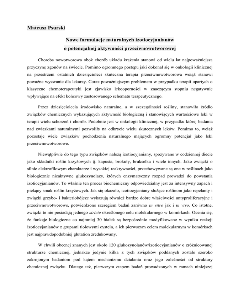 Mateusz Psurski Nowe formulacje naturalnych izotiocyjanianów o potencjalnej aktywności przeciwnowotworowej Choroba nowotworowa obok chorób układu krążenia stanowi od wielu lat najpoważniejszą przyczynę zgonów na świecie. Pomimo ogromnego postępu jaki dokonał się w onkologii klinicznej na przestrzeni ostatnich dziesięcioleci skuteczna terapia przeciwnowotworowa wciąż stanowi poważne wyzwanie dla lekarzy. Coraz poważniejszym problemem w przypadku terapii opartych o klasyczne chemoterapeutyki jest zjawisko lekooporności w znaczącym stopniu negatywnie wpływające na efekt końcowy zastosowanego schematu terapeutycznego. Przez dziesięciolecia środowisko naturalne, a w szczególności rośliny, stanowiło źródło związków chemicznych wykazujących aktywność biologiczną i stanowiących wartościowe leki w terapii wielu schorzeń i chorób. Podobnie jest w onkologii klinicznej, w przypadku której badania nad związkami naturalnymi pozwoliły na odkrycie wielu skutecznych leków. Pomimo to, wciąż pozostaje wiele związków pochodzenia naturalnego mających ogromny potencjał jako leki przeciwnowotworowe. Niewątpliwie do tego typu związków należą izotiocyjaniany, spożywane w codziennej diecie jako składniki roślin krzyżowych tj. kapusta, brokuły, brukselka i wiele innych. Jako związki o silnie elektrofilowym charakterze i wysokiej reaktywności, przechowywane są one w roślinach jako biologicznie nieaktywne glukozynolazy, których enzymatyczny rozpad prowadzi do powstania izotiocyjanianów. To właśnie ten proces biochemiczny odpowiedzialny jest za intensywny zapach i piekący smak roślin krzyżowych. Jak się okazało, izotiocyjaniany służące roślinom jako repelanty i związki grzybo- i bakteriobójcze wykazują również bardzo dobre właściwości antyproliferacyjne i przeciwnowotworowe, potwierdzone szeregiem badań zarówno in vitro jak i in vivo. Co istotne, związki te nie posiadają jednego stricte określonego celu molekularnego w komórkach. Ocenia się, że funkcje biologiczne co najmniej 30 białek są bezpośrednio modyfikowane w wyniku reakcji izotiocyjanianów z grupami tiolowymi cystein, a ich pierwszym celem molekularnym w komórkach jest najprawdopodobniej glutation zredukowany. W chwili obecnej znanych jest około 120 glukozynolanów/izotiocyjanianów o zróżnicowanej strukturze chemicznej, jednakże jedynie kilka z tych związków poddanych zostało szeroko zakrojonym badaniom pod kątem mechanizmu działania oraz jego zależności od struktury chemicznej związku. Dlatego też, pierwszym etapem badań prowadzonych w ramach niniejszej pracy była synteza dużego zestawu izotiocyjanianów i poddanie ich ocenie pod kątem aktywności antyproliferacyjnej in vitro celem określenia zależności pomiędzy aktywnością biologiczną i strukturą chemiczna związku. Dla reprezentatywnych związków wykonano dalsze badania pod kątem mechanizmów aktywności antyproliferacyjnej (m.in. analizowano proces akumulacji izotiocyjanianów w komórkach, poziom apoptozy, wpływ na cykl komórkowy i stres oksydacyjny, a także poziom glutationu zredukowanego) celem oceny, czy struktura chemiczna związku wpływa na jego mechanizm działania. Badania wykazały, że sama obecność grupy izotiocyjanianowej w cząsteczce, nie gwarantuje wysokiej aktywności biologicznej. Okazało się, że obecność dodatkowej grupy funkcyjnej ma kluczowe znaczenia dla aktywności związków. Co zaskakujące, rodzaj tejże grupy ma znaczenia drugorzędne w kontekście obserwowanej aktywności antyproliferacyjnej. Wykazano jednakże, że grupa ta w istotny sposób wpływa na obserwowany mechanizm działania związków. Wyniki sugerują więc, że w przypadku izotiocyjanianów możliwe jest modulowanie mechanizmu działania związku bez istotnego wpływu na poziom aktywności biologicznej. W komórkach izotiocyjaniany bardzo szybko reagują z obecnym w wysokich stężeniach glutationem, a następnie przekształcane są do tzw. kwasów merkapturowych (ditiokarbaminianów) w szlaku kwasów merkapturowych. Co interesujące, te pochodne izotiocyjanianów również wykazują, aktywność biologiczną (jak pokazały badania w przypadku większości z nich porównywalną do wyjściowych izotiocyjanianów) nie posiadając przy tym negatywnych cech izotiocyjanianów jak np. intensywny zapach i możliwość podrażniania błon śluzowych. Co więcej, wykazano, że pochodne te wykazują niemal identyczne właściwości przeciwnowotworowe w badaniach in vivo. Dodatkowo, przeprowadzone badania pod kątem stabilności kwasów merkapturowych w obecności stresu oksydacyjnego (zjawisko często spotykanego w obrębie guzów nowotworowych) wykazały, że związki te mogą potencjalnie stanowić formę prolekową dla izotiocyjanianów z wbudowanym prostym mechanizmem aktywacji w obrębie guza nowotworowego. W ramach prowadzonych badań podjęto również próbę opracowania schematu terapeutycznego wykorzystującego izotiocyjaniany jako czynnik uczulający komórki nowotworowe wykazujące oporność na antracykliny np. doksorubicynę. Badania in vitro, a także wstępne badania in vivo pokazały, że łączne zastosowanie izotiocyjanianów i doksorubicyny pozwala na znaczące obniżenie dawki cytostatyku przy zachowaniu efektu terapeutycznego. Mateusz Psurski Novel formulations of naturally occurring isothiocyanates with potential anticancer activity Cancer and cardiovascular diseases for many years are recognized as a major cause of deaths. Despite a tremendous progress in clinical oncology that took over last decades, effective anticancer therapy still remains elusive. In case of therapies based on classical chemotherapeutics phenomenon of multidrug-resistance arises as a major challenge decreasing efficiency of the applied therapy. For decades natural environment (especially plants) was recognized as a rich source of chemical compounds with potential biological activity used as u