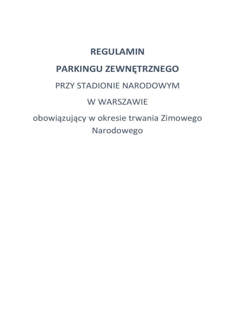REGULAMIN PARKINGU ZEWNĘTRZNEGO PRZY STADIONIE NARODOWYM W WARSZAWIE obowiązujący w okresie trwania Zimowego Narodowego I. ZASADY OGÓLNE Art. 1 Zarządcą Parkingu zewnętrznego przy Stadionie Narodowym w Warszawie (zwanego dalej „Parkingiem”) jest firma Testa Communications spółka z ograniczoną odpowiedzialnością z siedzibą w Warszawie, Al. Ks. J. Poniatowskiego 1, 03-901 Warszawa, REGON: 015882327, NIP: 5213315374, o kapitale zakładowym w wysokości 50.000, 00 zł, zarejestrowaną w Rejestrze Przedsiębiorców Krajowego Rejestru Sądowego prowadzonym przez Sąd Rejonowy dla m.st. Warszawy w Warszawie XII Wydział Gospodarczy KRS pod nr 0000223067, reprezentowana przez Zarząd, tj.: Katarzynę Ziemską – Prezesa Zarządu („Zarządca Parkingu”). Art. 2 1. Parking jest płatny, niestrzeżony. 2. Parking przeznaczony jest dla osób zamierzających skorzystać z atrakcji oferowanych w ramach projektu Zimowy Narodowy odbywającego się na Stadionie Narodowym („Zimowy Narodowy”). 3. Każdorazowo poprzez wjazd na teren Parkingu, właściciel lub użytkownik pojazdu wjeżdżającego na Parking („Użytkownik Parkingu”) zawiera z Zarządcą Parkingu umowę o odpłatne korzystanie z miejsca postojowego zlokalizowanego na Parkingu. Umowa, o której mowa w zdaniu poprzedzającym, zawierana jest na czas określony, do chwili uiszczenia opłaty parkingowej i wyjazdu z Parkingu, z zastrzeżeniem przypadków określonych w niniejszym regulaminie („Regulamin”). 4. Poprzez wjazd na teren Parkingu, Użytkownik Parkingu wyraża zgodę na brzmienie Regulaminu i zobowiązuje się do jego przestrzegania. 5. Regulamin i cennik udostępniane są na terenie Parkingu, jak również na stronie Internetowej www.bilety.zimowynarodowy.pl. Art. 3 Parking jest czynny w dniach od 8 listopada 2014 r do 1 marca 2015 r. tj. w okresie trwania projektu Zimowy Narodowy. Godziny funkcjonowania Parkingu są następujące: - Poniedziałek – czwartek – 14.00 – 21.15; - Piątek – 14.00 – 23.00; - Sobota i niedziela – 8.00 – 22.15. Art. 4 Wjazd na teren Parkingu możliwy jest od strony ul. Targowej, ul. Zamoyskiego oraz od ul. Sokolej. Art. 5 Parking przeznaczony jest dla motocykli, pojazdów osobowych, kempingowych, autobusów i autokarów. II. OPŁATY PARKINGOWE Art. 6 W ramach opłaty za Parking, Użytkownik Parkingu uprawniony jest do wjazdu na teren Parkingu oraz postoju (parkowania) pojazdu na terenie Parkingu przez czas od wjazdu na Parking do uiszczenia opłaty za Parking i wyjazdu z Parkingu. Art. 7 Opłata za Parking wynosi: 1) 10 zł, w odniesieniu do: a) motocyklu, b) samochodu osobowego przeznaczonego konstrukcyjnie do przewozu nie więcej, niż 7 osób wraz z kierowcą;, 2) 20 zł, w odniesieniu do: a) samochodu osobowego przeznaczonego konstrukcyjnie do przewozu więcej, niż 7 osób wraz z kierowcą, b) samochodu kempingowego, c) autobusu rozumianego, jako pojazd samochodowy przeznaczony konstrukcyjnie do przewozu nie więcej, niż 22 osób wraz z kierowcą; 3) 40 zł, w odniesieniu do autokaru rozumianego, jako autobus przeznaczony konstrukcyjnie do przewozu więcej niż 22 osób wraz z kierowcą. Art. 8 Osoby legitymujące się kartą parkingową dla osoby niepełnosprawnej zobowiązane są przy wjeździe pojazdu na Parking do umieszczenia jej w widocznym miejscu, za przednią szybą pojazdu, w sposób umożliwiający jej skontrolowanie i identyfikację posiadacza karty. Art. 9 Ustala się stawkę zerową opłat za parkowanie pojazdów samochodowych na Parkingu dla: 1) pojazdów służb ratowniczych; 2) funkcjonariuszy organu powołanego do ochrony bezpieczeństwa publicznego, wykonujących na terenie Stadionu Narodowego czynności służbowe inne, niż zabezpieczenie Imprezy; 3) osób, które uzyskają zgodę Zarządcy Parkingu. Art. 10 Czas wynikający z przebywania pojazdu na Parkingu z takich przyczyn jak awaria lub nieprawidłowe funkcjonowanie pojazdu, kontrola policyjna lub przeprowadzona przez inne uprawnione służby, nie jest podstawą do umniejszenia opłaty o ten czas lub naliczenia opłaty w mniejszej wysokości. III. ZASADY RUCHU I POSTOJU POJAZDÓW Art. 11 Do zasad ruchu pojazdów na terenie Parkingu stosuje się odpowiednio przepisy ustawy z dn. 20 czerwca 1997 r. prawo o ruchu drogowym (j.t. Dz. U. z 2012 r., poz. 1137 z późn. zm.) określające zasady ruchu pojazdów w strefie zamieszkania. Art. 12 Pojazdy wolno zatrzymywać i zostawiać tylko na wyznaczonym w tym celu terenie postojowym, z wyjątkiem miejsc zarezerwowanych. W przypadku niezastosowania się do powyższego przepisu, Zarządca Parkingu jest upoważniony do odholowania pojazdu lub przestawienia pojazdu, na koszt i ryzyko kierowcy. Art. 13 Pojazd pozostawiony na Parkingu powinien być należycie zabezpieczony przed samoczynnym (mechanicznym) przemieszczeniem, zapaleniem i uszkodzeniem. Zaparkowany samochód powinien mieć również szczelnie zamknięte okna, aby dostęp do wnętrza był niemożliwy. Ryzyko skutków niezabezpieczenia lub nienależytego zabezpieczenia pojazdu ponosi Użytkownik Parkingu. Art. 14 Użytkownicy Parkingu zobowiązani są do przestrzegania wszelkich poleceń obsługi (ochrony) Parkingu, jak również innych osób uprawnionych przez Zarządcę Parkingu do wydawania poleceń w zakresie organizacji ruchu na terenie Parkingu. Art. 15 Na terenie Parkingu zabronione jest: 1) naprawianie, mycie, odkurzanie pojazdów, wymiana płynów chłodzących, paliwa lub oleju oraz inne podobne czynności; 2) palenie i używanie otwartego ognia, magazynowanie paliw, substancji łatwopalnych i pustych pojemników po paliwie, tankowanie z włączonym silnikiem, parkowanie pojazdu z nieszczelnym wlewem paliwa; 3) zatrzymywanie lub postój (parkowanie) pojazdów na drogach dojazdowych lub ewakuacyjnych, lub jakichkolwiek innych miejscach niż miejsca do tego wyznaczone; 4) zanieczyszczanie Parkingu, w szczególności pozostawianie śmieci poza przeznaczonymi do tego koszami; 5) pozo