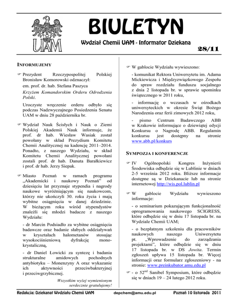 INFORMUJEMY W gablocie Wydziału wywieszono: Prezydent Rzeczypospolitej Polskiej Bronisław Komorowski odznaczył: em. prof. dr. hab. Stefana Paszyca Krzyżem Komandorskim Orderu Odrodzenia Polski. Uroczyste wręczenie orderu odbyło się podczas Nadzwyczajnego Posiedzenia Senatu UAM w dniu 28 października br. Wydział Nauk Ścisłych i Nauk o Ziemi Polskiej Akademii Nauk informuje, że prof. dr hab. Wiesław Wasiak został powołany w skład Prezydium Komitetu Chemii Analitycznej na kadencję 2011–2014. Ponadto, z naszego Wydziału, w skład Komitetu Chemii Analitycznej powołani zostali prof. dr hab. Danuta Barałkiewicz i prof. dr hab. Jerzy Siepak. Miasto Poznań w ramach programu „Akademicki i naukowy Poznań” od dziesięciu lat przyznaje stypendia i nagrody naukowe wyróżniającym się naukowcom, którzy nie ukończyli 30. roku życia i mają wybitne osiągnięcia w danej dziedzinie. W bieżącym roku wśród stypendystów znaleźli się młodzi badacze z naszego Wydziału: - dr Marcin Podsiadło za wybitne osiągnięcia badawcze oraz badanie słabych oddziaływań w kryształach halometanów stosując wysokociśnieniową dyfrakcję monokrystaliczną, - dr Daniel Łowicki za syntezę i badania strukturalne amidowych pochodnych antybiotyku – Monenzyny A oraz wykazanie ich aktywności przeciwbakteryjnej i przeciwgrzybicznej. Wszystkim wyżej wymienionym serdecznie gratulujemy! - komunikat Rektora Uniwersytetu im. Adama Mickiewicza i Międzyzwiązkowego Zespołu do spraw rozdziału funduszu socjalnego z dnia 2 listopada br. w sprawie upominku świątecznego w 2011 roku, - informację o wczasach w ośrodkach uniwersyteckich w okresie Świąt Bożego Narodzenia oraz ferii zimowych 2012 roku, - pismo Centrum Badawczego ABB w Krakowie informujące o dziewiątej edycji Konkursu o Nagrodę ABB. Regulamin konkursu jest dostępny na stronie www.abb.pl/konkurs SYMPOZJA I KONFERENCJE IV Ogólnopolski Kongres Inżynierii Środowiska odbędzie się w Lublinie w dniach 2-5 września 2012 roku. Bliższe informacje dostępne są w Dziekanacie lub na stronie internetowej http://wis.pol.lublin.pl W gablocie informacje: Wydziału wywieszono - o seminarium pokazującym funkcjonalność oprogramowania naukowego SCIGRESS, które odbędzie się w dniu 17 listopada br. na Wydziale Chemii UAM; - o bezpłatnym szkoleniu dla pracowników naukowych naszego Uniwersytetu pt. „Wprowadzenie do zarządzania projektami”, które odbędzie się w dniu 17 listopada br. w DS Jowita. Termin zgłoszeń upływa 15 listopada br. Więcej informacji oraz formularz zgłoszeniowy - na stronie: www.preinkubator.amu.edu.pl - o 52nd Sanibel Symposium, które odbędzie się w dniach 19 – 24 lutego 2012 roku. [email protected]