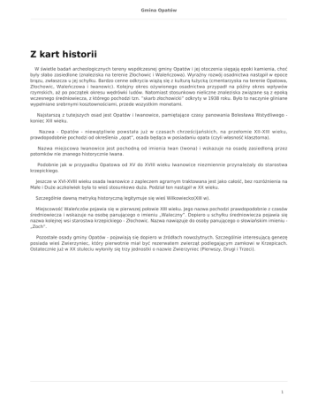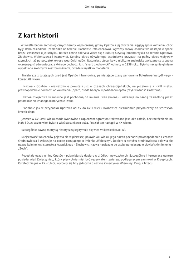 Gmina Opatów Z kart historii W świetle badań archeologicznych tereny współczesnej gminy Opatów i jej otoczenia sięgają epoki kamienia, choć były słabo zasiedlone (znaleziska na terenie Złochowic i Waleńczowa). Wyraźny rozwój osadnictwa nastąpił w epoce brązu, zwłaszcza u jej schyłku. Bardzo cenne odkrycia wiążą się z kulturą łużycką (cmentarzyska na terenie Opatowa, Złochowic, Waleńczowa i Iwanowic). Kolejny okres ożywionego osadnictwa przypadł na późny okres wpływów rzymskich, aż po początek okresu wędrówki ludów. Natomiast stosunkowo nieliczne znaleziska związane są z epoką wczesnego średniowiecza, z którego pochodzi tzn. ”skarb złochowicki” odkryty w 1938 roku. Było to naczynie gliniane wypełniane srebrnymi kosztownościami, przede wszystkim monetami. Najstarszą z tutejszych osad jest Opatów i Iwanowice, pamiętające czasy panowania Bolesława Wstydliwego koniec XIII wieku. Nazwa - Opatów - niewątpliwie powstała już w czasach chrześcijańskich, na przełomie XII-XIII wieku, prawdopodobnie pochodzi od określenia „opat”, osada będąca w posiadaniu opata (czyli własność klasztorna). Nazwa miejscowa Iwanowice jest pochodną od imienia Iwan (Iwona) i wskazuje na osadę zasiedloną przez potomków nie znanego historycznie Iwana. Podobnie jak w przypadku Opatowa od XV do XVIII wieku Iwanowice niezmiennie przynależały do starostwa krzepickiego. Jeszcze w XVI-XVIII wieku osada Iwanowice z zapleczem agrarnym traktowana jest jako całość, bez rozróżnienia na Małe i Duże aczkolwiek była to wieś stosunkowo duża. Podział ten nastąpił w XX wieku. Szczególnie dawną metryką historyczną legitymuje się wieś Wilkowiecko(XIII w). Miejscowość Waleńczów pojawia się w pierwszej połowie XIII wieku. Jego nazwa pochodzi prawdopodobnie z czasów średniowiecza i wskazuje na osobę panującego o imieniu „Waleczny”. Dopiero u schyłku średniowiecza pojawia się nazwa kolejnej wsi starostwa krzepickiego - Złochowic. Nazwa nawiązuje do osoby panującego o słowiańskim imieniu „Zoch”. Pozostałe osady gminy Opatów - pojawiają się dopiero w źródłach nowożytnych. Szczególnie interesującą genezę posiada wieś Zwierzyniec, który pierwotnie miał być rezerwatem zwierząt podlegającym zamkowi w Krzepicach. Ostatecznie już w XX stuleciu wyłoniły się trzy jednostki o nazwie Zwierzyniec (Pierwszy, Drugi i Trzeci). 1