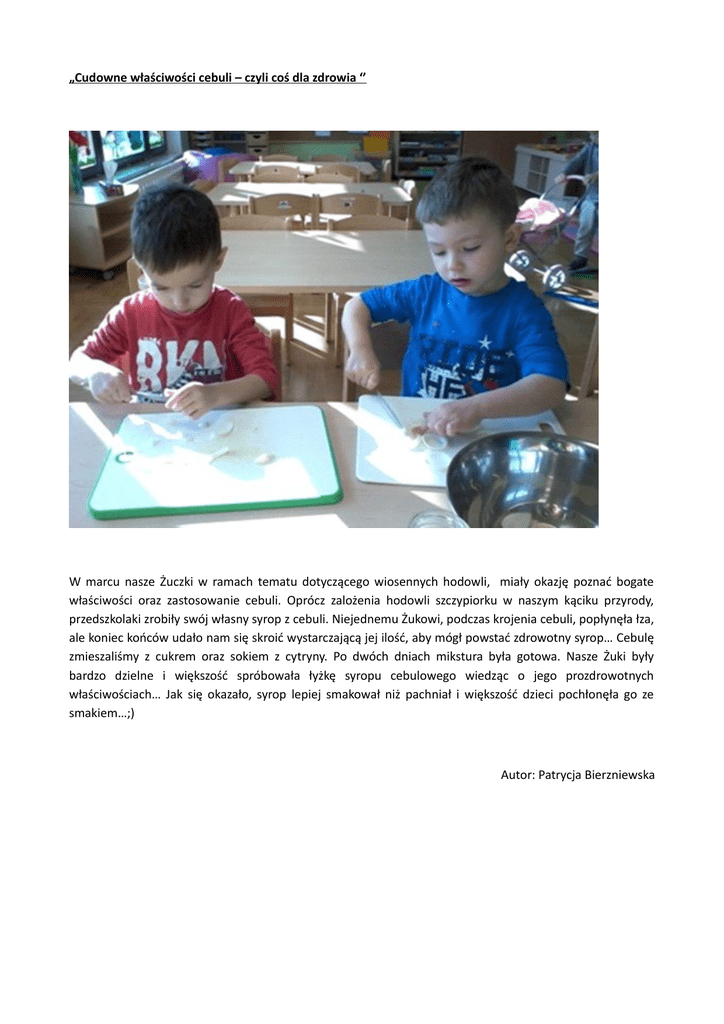„Cudowne właściwości cebuli – czyli coś dla zdrowia ‘’ W marcu nasze Żuczki w ramach tematu dotyczącego wiosennych hodowli, miały okazję poznać bogate właściwości oraz zastosowanie cebuli. Oprócz zalożenia hodowli szczypiorku w naszym kąciku przyrody, przedszkolaki zrobiły swój własny syrop z cebuli. Niejednemu Żukowi, podczas krojenia cebuli, popłynęła łza, ale koniec końców udało nam się skroić wystarczającą jej ilość, aby mógł powstać zdrowotny syrop… Cebulę zmieszaliśmy z cukrem oraz sokiem z cytryny. Po dwóch dniach mikstura była gotowa. Nasze Żuki były bardzo dzielne i większość spróbowała łyżkę syropu cebulowego wiedząc o jego prozdrowotnych właściwościach… Jak się okazało, syrop lepiej smakował niż pachniał i większość dzieci pochłonęła go ze smakiem…;) Autor: Patrycja Bierzniewska „Jak skrzaty i trolle szukały muzyki w lesie” Dnia 16 marca w naszym przedszkolu odbył się koncert. Tym razem w muzyczny i tajemniczy świat trollów i skrzatów wprowadził nas nowo poznany instrument- wiolonczela. Nasze przedszkolaki radośnie i czynnie uczestniczyły w tym koncercie. Podążając za muzyką, również ruchem, bacznie śledziły losy rzeczonych stworzeń leśnych. Zapoznały się ze również ze specyfiką niezwykłego instrumentu jakim jest wiolonczela. Koncert był dla nich radosnym i pouczającym wydarzeniem . Autor: Patrycja Bierzniewska „Żegnaj zimo, witaj wiosno!” 20 marca powitaliśmy w naszym przedszkolu Pierwszy Dzień Wiosny. Nasze Żuczki, wspaniale wystrojone w soczyste zielone kolory, ruszyły do parku wraz z innymi grupami, aby topiąc Marzannę, pożegnać zimę i powitać wiosnę. Więcej na ten temat można przeczytać na stronie gminy Brwinów (adres podany poniżej) http://www.brwinow.pl/index.php/kultura-i-oswiata/2611-wiosna-w-przedszkolu Miło było patrzeć na nasze wiosenne zielone Żuczki, którym po całym dniu niezwykłych wrażeń, nie schodził uśmiech z twarzy. Dodam tylko, iż pięknie komponowały się one z naszą zieloną salą… Autor: Patrycja Bierzniewska „Wielkanocne inspiracje” Wielkimi krokami zbliża się Wielkanoc… Nasze Żuczki zaczęły więc tworzyć piękne Świąteczne prace… Zrobiliśmy cudowne kartki wielkanocne, które przedszkolaki same wysłały na poczcie. Każdy zrobił też własną pisankę oraz palemkę, z którą uda się wraz z rodzicami do Kościoła w Niedzielę Palmową. Przed nami jeszcze jeden tydzień produkcji wspaniałych prac wielkanocnych. Część z nich zamierzamy przeznaczyć na kiermasz świąteczny… Nasze wielkanocne dzieła plastyczne dostarczają Żukom wiele radości oraz poczucia dumy i zadowolenia z własnoręcznie wykonanej pracy. Wesołych Świąt Wielkanocnych życzą przedszkolaki oraz Panie z grupy Żuczków!