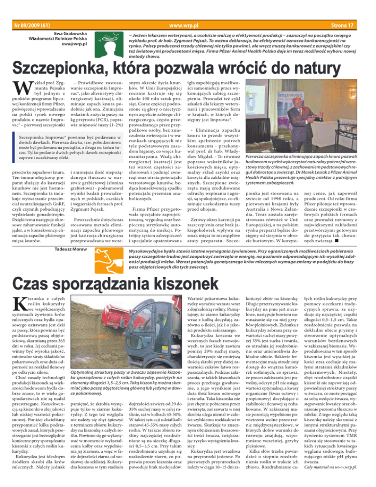 Nr 09/2009 (61) www.wrp.pl Ewa Grabowska Wiadomości Rolnicze Polska [email protected] Strona 17 − Jestem lekarzem weterynarii, a osobiście walczę o efektywność produkcji – zaznaczył na początku swojego wykładu prof. dr hab. Zygmunt Pejsak. To ważna deklaracja, bo efektywność oznacza konkurencyjność na rynku. Polscy producenci trzody chlewnej nie tylko powinni, ale wręcz muszą konkurować z europejskimi czy też światowymi producentami mięsa. Firma Pfizer Animal Health Polska daje im teraz możliwość wyboru nowej metody chowu. Szczepionka, która pozwala wrócić do natury W ykład prof. Zygmunta Pejsaka był jednym z punktów programu lipcowej konferencji firmy Pfizer, poświęconej wprowadzeniu na polski rynek nowego produktu o nazwie Improvac® – pierwszej szczepionki - Prawidłowe zastosowanie szczepionki Improvac®, jako alternatywy chirurgicznej kastracji, eliminuje zapach knura podobnie jak ona. Zmniejsza wskaźnik zużycia paszy na kg przyrostu (FCR), poprawia mięsność tuszy (1-2%) Szczepionka Improvac® powinna być podawana w dwóch dawkach. Pierwsza dawka, tzw. pobudzeniowa może być podawana na początku, a druga na końcu tuczu. Tylko podanie dwóch pełnych dawek szczepionki zapewni oczekiwany efekt. przeciwko zapachowi knura. Ten immunologiczny preparat służący do kastracji knurków nie jest hormonem. Szczepionka ta indukuje wytwarzanie przeciwciał neutralizujących GnRF, czyli czynnik pobudzający wydzielanie gonadotropin. Dzięki temu następuje okresowe zahamowanie funkcji jąder, a w konsekwencji eliminacja zapachu płciowego mięsa knurów. i zmniejsza ilość niepożądanego tłuszczu w warstwie grzbietowej (słonina grzbietowa) - podsumował wyniki badań prowadzonych w polskich, czeskich i węgierskich fermach prof. Zygmunt Pejsak. Powszechnie dotychczas stosowana metoda eliminacji zapachu płciowego jest kastracja chirurgiczna przeprowadzana we wcze- Tadeusz Moraw snym okresie życia knurków. W Unii Europejskiej rocznie kastruje się się około 100 mln sztuk prosiąt. Coraz częściej podnoszone są głosy o nieetycznym aspekcie zabiegu chirurgicznego, często przeprowadzanego przez przypadkowe osoby, bez znieczulenia zwierzęcia i w warunkach urągających nie tyle podstawowym zasadom higieny, co wręcz humanitaryzmu. Wadą chirurgicznej kastracji jest też wzrost częstości zachorowań i padnięć zwierząt oraz utrata potencjału wzrostowego knurów, będąca konsekwencją spadku potencjału przemian anabolicznych. Firma Pfizer przygotowała specjalnie zaprojektowaną, wygodną oraz bezpieczną strzykawkę automatyczną do iniekcji. Potrójny system zabezpieczeń i specjalnie opatentowana igła zapobiegają możliwości samoiniekcji przez wykonujących zabieg szczepienia. Prowadzi też cykl szkoleń dla lekarzy weterynarii i pracowników ferm w krajach, w których dostępny jest Improvac®. - Eliminacja zapachu knura to przede wszystkim spełnienie potrzeb konsumenta - przekonywał prof. dr hab. Władysław Migdał. - To również poprawa wskaźników jakościowych mięsa, optymalny skład szynki oraz korzyść dla zakładów mięsnych. Szczepione zwierzęta mają zredukowane odruchy wspinania i agresji, są spokojniejsze, co eliminuje uszkodzenia tuszy przed ubojem. Zerowy okres karencji po zaszczepieniu oraz brak jakiegokolwiek wpływu na smak mięsa to niewątpliwe atuty preparatu. Szcze- Pierwsza szczepionka eliminująca zapach knura pozwoli hodowcom w pełni wykorzystać naturalny potencjał wzrostowy trzody chlewnej, z zachowaniem podstawowych reguł dobrostanu zwierząt. Dr Marek Lesiak z Pfizer Animal Health Polska prezentuje specjalny iniektor z potrójnym systemem zabezpieczeń. pionka jest stosowana na świecie od 1998 roku, a pierwszymi krajami były Australia i Nowa Zelandia. Teraz została zarejestrowana również w Unii Europejskiej, a na polskim rynku preparat będzie dostępny od sierpnia w obrocie hurtowym. W korzyst- nej cenie, jak zapewnił producent. Od roku firma Pfizer pilotuje też wprowadzenie szczepionki w czołowych polskich fermach oraz prowadzi rozmowy z największymi zakładami przetwórczymi gotowymi do przyjęcia tak chowanych zwierząt. n Wysokowydajne bydło stawia istotne wymagania żywieniowe. Przy ograniczonych możliwościach pobierania paszy szczególnie trudno jest zaopatrzyć zwierzęta w energię, na poziomie odpowiadającym ich wysokiej zdolności produkcji mleka. Wzrost potencjału genetycznego krów mlecznych wymaga zmiany w podejściu do bazy pasz objętościowych dla tych zwierząt. Czas sporządzania kiszonek K iszonka z całych roślin kukurydzy we współczesnych systemach żywienia krów mlecznych oraz bydła opasowego uznawana jest dziś za paszę, która powinna być podstawową paszą objętościową, skarmianą przez 365 dni w roku. Jej cechami powinny być wysoka jakość, minimalne straty składników pokarmowych oraz duża odporność na rozkład tlenowy po odkryciu silosu. Choć zasady technologii produkcji kiszonek są większości hodowcom bydła dobrze znane, to w wielu gospodarstwach nie są nadal przestrzegane. Konsekwencją są kiszonki o złej jakości lub niskiej wartości pokarmowej. Poniżej chcieliśmy przypomnieć kilka podstawowych zasad, których przestrzeganie jest bezwzględnie konieczne przy sporządzaniu kiszonki z całych roślin kukurydzy. Kukurydza jest idealnym źródłem skrobi dla krów mlecznych. Należy jednak Optymalną strukturę paszy w żwaczu zapewnia kiszonka sporządzona z całych roślin kukurydzy, pociętych na elementy długości 1,5–2,5 cm. Taką kiszonkę można skarmiać jako paszę objętościową główną lub jedyną w dawce pokarmowej. pamiętać, że skrobia występuje tylko w ziarnie kukurydzy. Z tego też względu nie należy się zbyt śpieszyć z terminem zbioru kukurydzy na kiszonkę z całych roślin. Powinno się go wykonywać w momencie wykształcenia kolby oraz wypełnienia jej ziarnem, a więc w fazie dojrzałośc