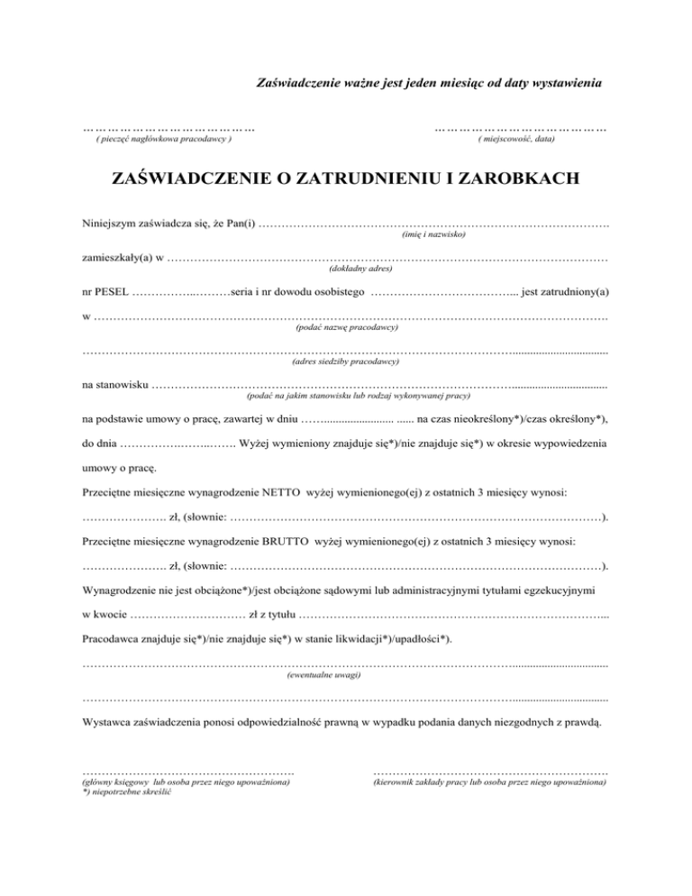 Zaświadczenie waŜne jest jeden miesiąc od daty wystawienia …………………………………… …………………………………… ( pieczęć nagłówkowa pracodawcy ) ( miejscowość, data) ZAŚWIADCZENIE O ZATRUDNIENIU I ZAROBKACH Niniejszym zaświadcza się, Ŝe Pan(i) ………………………………………………………………………………. (imię i nazwisko) zamieszkały(a) w …………………………………………………………………………………………………… (dokładny adres) nr PESEL ……………..………seria i nr dowodu osobistego ………………………………... jest zatrudniony(a) w ……………………………………………………………………………………………………………………. (podać nazwę pracodawcy) …………………………………………………………………………………………………................................. (adres siedziby pracodawcy) na stanowisku …………………………………………………………………………………................................. (podać na jakim stanowisku lub rodzaj wykonywanej pracy) na podstawie umowy o pracę, zawartej w dniu ……........................ ...... na czas nieokreślony*)/czas określony*), do dnia …………….……..……. WyŜej wymieniony znajduje się*)/nie znajduje się*) w okresie wypowiedzenia umowy o pracę. Przeciętne miesięczne wynagrodzenie NETTO wyŜej wymienionego(ej) z ostatnich 3 miesięcy wynosi: …………………. zł, (słownie: ……………………………………………………………………………………). Przeciętne miesięczne wynagrodzenie BRUTTO wyŜej wymienionego(ej) z ostatnich 3 miesięcy wynosi: …………………. zł, (słownie: ……………………………………………………………………………………). Wynagrodzenie nie jest obciąŜone*)/jest obciąŜone sądowymi lub administracyjnymi tytułami egzekucyjnymi w kwocie ………………………… zł z tytułu ……………………………………………………………………... Pracodawca znajduje się*)/nie znajduje się*) w stanie likwidacji*)/upadłości*). …………………………………………………………………………………………………................................. (ewentualne uwagi) …………………………………………………………………………………………………................................. Wystawca zaświadczenia ponosi odpowiedzialność prawną w wypadku podania danych niezgodnych z prawdą. ………………………………………………. ……………………………………………………. (główny księgowy lub osoba przez niego upowaŜniona) *) niepotrzebne skreślić (kierownik zakłady pracy lub osoba przez niego upowaŜniona)
