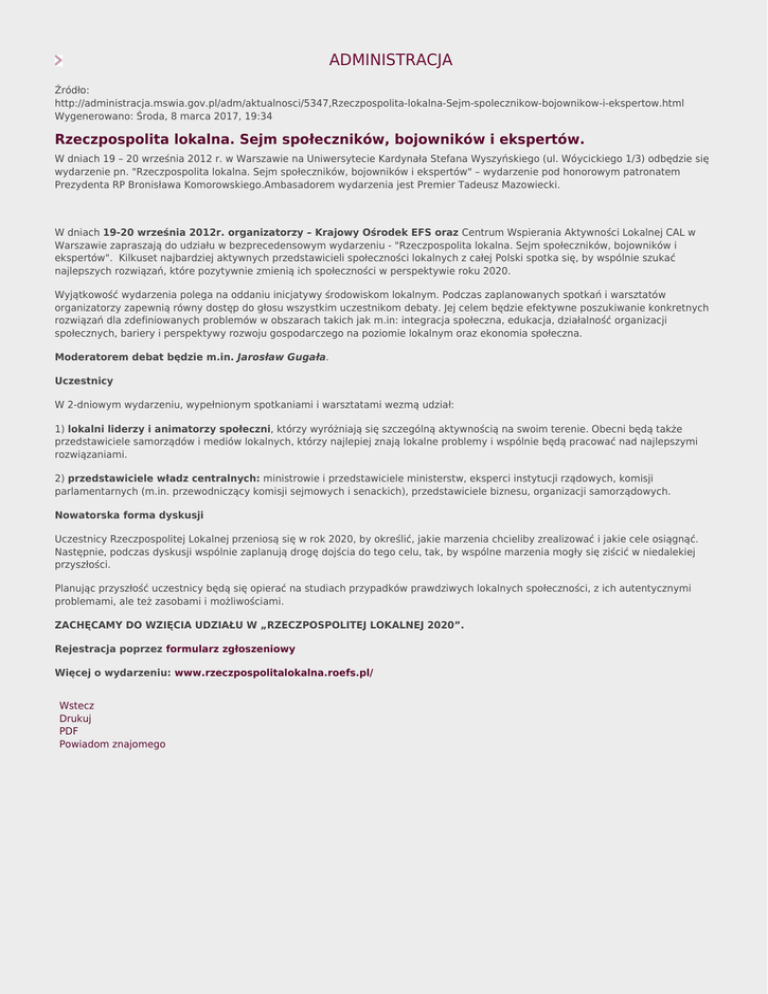 ADMINISTRACJA Źródło: http://administracja.mswia.gov.pl/adm/aktualnosci/5347,Rzeczpospolita-lokalna-Sejm-spolecznikow-bojownikow-i-ekspertow.html Wygenerowano: Środa, 8 marca 2017, 19:34 Rzeczpospolita lokalna. Sejm społeczników, bojowników i ekspertów. W dniach 19 – 20 września 2012 r. w Warszawie na Uniwersytecie Kardynała Stefana Wyszyńskiego (ul. Wóycickiego 1/3) odbędzie się wydarzenie pn. "Rzeczpospolita lokalna. Sejm społeczników, bojowników i ekspertów" – wydarzenie pod honorowym patronatem Prezydenta RP Bronisława Komorowskiego.Ambasadorem wydarzenia jest Premier Tadeusz Mazowiecki. W dniach 19-20 września 2012r. organizatorzy – Krajowy Ośrodek EFS oraz Centrum Wspierania Aktywności Lokalnej CAL w Warszawie zapraszają do udziału w bezprecedensowym wydarzeniu - "Rzeczpospolita lokalna. Sejm społeczników, bojowników i ekspertów". Kilkuset najbardziej aktywnych przedstawicieli społeczności lokalnych z całej Polski spotka się, by wspólnie szukać najlepszych rozwiązań, które pozytywnie zmienią ich społeczności w perspektywie roku 2020. Wyjątkowość wydarzenia polega na oddaniu inicjatywy środowiskom lokalnym. Podczas zaplanowanych spotkań i warsztatów organizatorzy zapewnią równy dostęp do głosu wszystkim uczestnikom debaty. Jej celem będzie efektywne poszukiwanie konkretnych rozwiązań dla zdefiniowanych problemów w obszarach takich jak m.in: integracja społeczna, edukacja, działalność organizacji społecznych, bariery i perspektywy rozwoju gospodarczego na poziomie lokalnym oraz ekonomia społeczna. Moderatorem debat będzie m.in. Jarosław Gugała. Uczestnicy W 2-dniowym wydarzeniu, wypełnionym spotkaniami i warsztatami wezmą udział: 1) lokalni liderzy i animatorzy społeczni, którzy wyróżniają się szczególną aktywnością na swoim terenie. Obecni będą także przedstawiciele samorządów i mediów lokalnych, którzy najlepiej znają lokalne problemy i wspólnie będą pracować nad najlepszymi rozwiązaniami. 2) przedstawiciele władz centralnych: ministrowie i przedstawiciele ministerstw, eksperci instytucji rządowych, komisji parlamentarnych (m.in. przewodniczący komisji sejmowych i senackich), przedstawiciele biznesu, organizacji samorządowych. Nowatorska forma dyskusji Uczestnicy Rzeczpospolitej Lokalnej przeniosą się w rok 2020, by określić, jakie marzenia chcieliby zrealizować i jakie cele osiągnąć. Następnie, podczas dyskusji wspólnie zaplanują drogę dojścia do tego celu, tak, by wspólne marzenia mogły się ziścić w niedalekiej przyszłości. Planując przyszłość uczestnicy będą się opierać na studiach przypadków prawdziwych lokalnych społeczności, z ich autentycznymi problemami, ale też zasobami i możliwościami. ZACHĘCAMY DO WZIĘCIA UDZIAŁU W „RZECZPOSPOLITEJ LOKALNEJ 2020”. Rejestracja poprzez formularz zgłoszeniowy Więcej o wydarzeniu: www.rzeczpospolitalokalna.roefs.pl/ Wstecz Drukuj PDF Powiadom znajomego