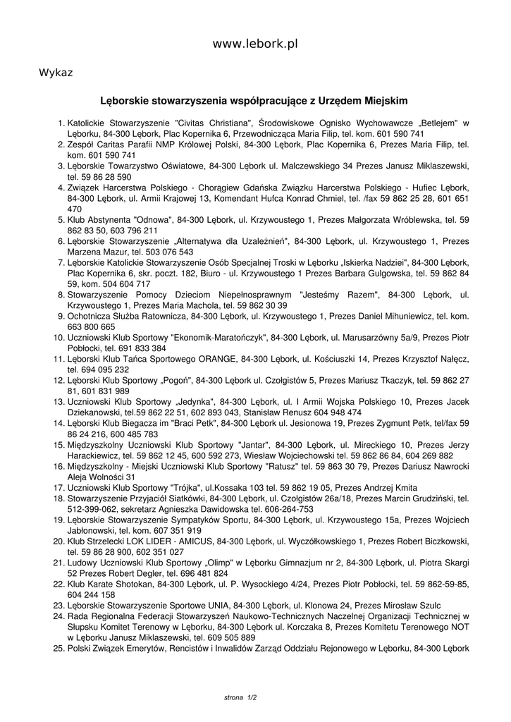www.lebork.pl Wykaz Lęborskie stowarzyszenia współpracujące z Urzędem Miejskim 1. Katolickie Stowarzyszenie "Civitas Christiana", Środowiskowe Ognisko Wychowawcze „Betlejem" w Lęborku, 84-300 Lębork, Plac Kopernika 6, Przewodnicząca Maria Filip, tel. kom. 601 590 741 2. Zespół Caritas Parafii NMP Królowej Polski, 84-300 Lębork, Plac Kopernika 6, Prezes Maria Filip, tel. kom. 601 590 741 3. Lęborskie Towarzystwo Oświatowe, 84-300 Lębork ul. Malczewskiego 34 Prezes Janusz Miklaszewski, tel. 59 86 28 590 4. Związek Harcerstwa Polskiego - Chorągiew Gdańska Związku Harcerstwa Polskiego - Hufiec Lębork, 84-300 Lębork, ul. Armii Krajowej 13, Komendant Hufca Konrad Chmiel, tel. /fax 59 862 25 28, 601 651 470 5. Klub Abstynenta "Odnowa", 84-300 Lębork, ul. Krzywoustego 1, Prezes Małgorzata Wróblewska, tel. 59 862 83 50, 603 796 211 6. Lęborskie Stowarzyszenie „Alternatywa dla Uzależnień", 84-300 Lębork, ul. Krzywoustego 1, Prezes Marzena Mazur, tel. 503 076 543 7. Lęborskie Katolickie Stowarzyszenie Osób Specjalnej Troski w Lęborku „Iskierka Nadziei", 84-300 Lębork, Plac Kopernika 6, skr. poczt. 182, Biuro - ul. Krzywoustego 1 Prezes Barbara Gulgowska, tel. 59 862 84 59, kom. 504 604 717 8. Stowarzyszenie Pomocy Dzieciom Niepełnosprawnym "Jesteśmy Razem", 84-300 Lębork, ul. Krzywoustego 1, Prezes Maria Machola, tel. 59 862 30 39 9. Ochotnicza Służba Ratownicza, 84-300 Lębork, ul. Krzywoustego 1, Prezes Daniel Mihuniewicz, tel. kom. 663 800 665 10. Uczniowski Klub Sportowy "Ekonomik-Maratończyk", 84-300 Lębork, ul. Marusarzówny 5a/9, Prezes Piotr Pobłocki, tel. 691 833 384 11. Lęborski Klub Tańca Sportowego ORANGE, 84-300 Lębork, ul. Kościuszki 14, Prezes Krzysztof Nałęcz, tel. 694 095 232 12. Lęborski Klub Sportowy „Pogoń", 84-300 Lębork ul. Czołgistów 5, Prezes Mariusz Tkaczyk, tel. 59 862 27 81, 601 831 989 13. Uczniowski Klub Sportowy „Jedynka", 84-300 Lębork, ul. I Armii Wojska Polskiego 10, Prezes Jacek Dziekanowski, tel.59 862 22 51, 602 893 043, Stanisław Renusz 604 948 474 14. Lęborski Klub Biegacza im "Braci Petk", 84-300 Lębork ul. Jesionowa 19, Prezes Zygmunt Petk, tel/fax 59 86 24 216, 600 485 783 15. Międzyszkolny Uczniowski Klub Sportowy "Jantar", 84-300 Lębork, ul. Mireckiego 10, Prezes Jerzy Harackiewicz, tel. 59 862 12 45, 600 592 273, Wiesław Wojciechowski tel. 59 862 86 84, 604 269 882 16. Międzyszkolny - Miejski Uczniowski Klub Sportowy "Ratusz" tel. 59 863 30 79, Prezes Dariusz Nawrocki Aleja Wolności 31 17. Uczniowski Klub Sportowy "Trójka", ul.Kossaka 103 tel. 59 862 19 05, Prezes Andrzej Kmita 18. Stowarzyszenie Przyjaciół Siatkówki, 84-300 Lębork, ul. Czołgistów 26a/18, Prezes Marcin Grudziński, tel. 512-399-062, sekretarz Agnieszka Dawidowska tel. 606-264-753 19. Lęborskie Stowarzyszenie Sympatyków Sportu, 84-300 Lębork, ul. Krzywoustego 15a, Prezes Wojciech Jabłonowski, tel. kom. 607 351 919 20. Klub Strzelecki LOK LIDER - AMICUS, 84-300 Lębork, ul. Wyczółkowskiego 1, Prezes Robert Biczkowski, tel. 59 86 28 900, 602 351 027 21. Ludowy Uczniowski Klub Sportowy „Olimp" w Lęborku Gimnazjum nr 2, 84-300 Lębork, ul. Piotra Skargi 52 Prezes Robert Degler, tel. 696 481 824 22. Klub Karate Shotokan, 84-300 Lębork, ul. P. Wysockiego 4/24, Prezes Piotr Pobłocki, tel. 59 862-59-85, 604 244 158 23. Lęborskie Stowarzyszenie Sportowe UNIA, 84-300 Lębork, ul. Klonowa 24, Prezes Mirosław Szulc 24. Rada Regionalna Federacji Stowarzyszeń Naukowo-Technicznych Naczelnej Organizacji Technicznej w Słupsku Komitet Terenowy w Lęborku, 84-300 Lębork ul. Korczaka 8, Prezes Komitetu Terenowego NOT w Lęborku Janusz Miklaszewski, tel. 609 505 889 25. Polski Związek Emerytów, Rencistów i Inwalidów Zarząd Oddziału Rejonowego w Lęborku, 84-300 Lębork strona 1/2 ul. Korczaka 6, Przewodniczący Zarządu Andrzej Kaczorowski, tel. 59 862 14 04 26. Związek Kombatantów RP i BWP, 84-300 Lębork, ul. Czołgistów 5, Przewodniczący Czesław Połoński, tel. 59 862 29 26 27. Związek Sybiraków Oddział Słupsk Zarząd Koła Lębork, 84-300 Lębork, ul. Krzywoustego 1, Prezes Witold Bań, tel. 692 013 888 28. Związek Ukraińców Miejskie Koło w Lęborku, 84-300 Lębork, ul. Hibnera 4, Przewodniczący Koła Aleksander Romanko, tel. 59 863 11 58 29. Lęborskie Stowarzyszenie św. Jakuba Apostoła, 84-300 Lębork, ul. Basztowa 8, Prezes Regina Szczupaczyńska, tel. 503 065 017 30. Zrzeszenie Kaszubsko-Pomorskie, Prezes Ryszard Wenta, tel. 606 505 562, ul.Krzywoustego 1 - pok.125 31. Lęborskie Bractwo Historyczne, 84-300 Lębork, ul. Młynarska 14-15, Senior Kapituły Marcin Ramczyk, tel. 59 862 24 14, 501 625 232 (część historyczna) 32. Lęborskie Bractwo Historyczne Bractwo Rycerskie - Hufiec Przedni Wójtostwa Lębork, 84-300 Lębork, ul. Młynarska 14-15, Marcin Ramczyk, tel. 501 389 579 33. Stowarzyszenie Twórców i Animatorów Kultury „Tak", 84-300 Lębork, ul. Różyckiego 2, Prezes Alina Walkusz, tel. 59 862 16 45 34. Klub Demokratycznej Unii Kobiet, 84-300 Lębork, Aleja Wolności 14d/39, Przewodnicząca Anna Sobolewska, tel. 59 862 25 35 35. Polski Związek Wędkarski Koło przy Komendzie powiatowej Policji w Lęborku, ul. Emilii Plater - Węzeł Cieplny W-10, tel.507 019 466, Prezes Zarządu Mieczysław Szmidtka 36. Lokalna Organizacja Turystyczna „Ziemia Lęborska", 84-300 Lębork, Al. Niepodległości 6, Prezes Werner Koschalka, tel. 59 842 01 34 37. Stowarzyszenie Rodzin Wielodzietnych Oddział Lębork, 84-300 Lębork, ul. Kartuska 2, Prezes Krystyna Konkol, tel. 59 863 21 23, 59 863 14 41 38. Polskie Stowarzyszenie Diabetyków, Oddział w Lęborku, 84-300 Lębork, ul. Krzywoustego 1, Prezes Danuta Janowska, tel. 608 101 428 39. Polski Związek Niewidomych Okręg Pomorski Koło Powiatowe w Lęborku, 84-300 Lębork, ul. Krzywoustego 1 Prezes Joanna Korcz, tel. 59 862 85 38 40. Stowarzyszenie „Amazonka" w Lęborku, 84-300 Lębork, ul. Węgrzynowicza 13, Prezes Bogumiła Zielińsk