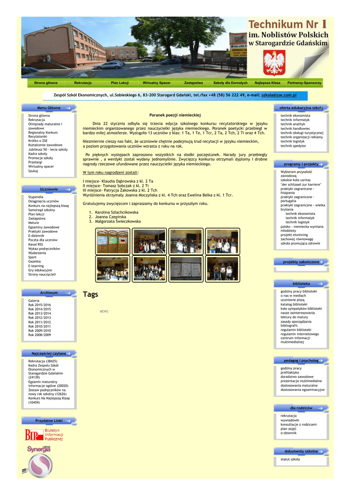 Strona główna Rekrutacja Plan Lekcji Wirtualny Spacer Zastępstwa Szkoły dla Dorosłych Najlepsza Klasa Partnerzy-Sponsorzy Zespół Szkół Ekonomicznych, ul.Sobieskiego 6, 83-200 Starogard Gdański, tel./fax +48 (58) 56 222 49, e-mail: [email protected] Menu Główne Strona główna Rekrutacja Olimpiady maturalne i zawodowe Regionalny Konkurs Recytatorski Krótko o ZSE Kształcenie zawodowe Jubileusz 50 - lecia szkoły Kadra szkoły Promocja szkoły Przetargi Wirtualny spacer Szukaj Uczniowie Stypendia Osiągnięcia uczniów Konkurs na najlepszą klasę Samorząd szkolny Plan lekcji Zastępstwa Matura Egzaminy zawodowe Praktyki zawodowe E-dziennik Poczta dla uczniów Kanał RSS Wykaz podręczników Wydarzenia Sport Gazetka E-learning Gry edukacyjne Strony nauczycieli oferta edukacyjna szkoły Poranek poezji niemieckiej Dnia 22 stycznia odbyła się trzecia edycja szkolnego konkursu recytatorskiego w języku niemieckim organizowanego przez nauczycielki języka niemieckiego. Poranek poetycki przebiegł w bardzo miłej atmosferze. Wystąpiło 13 uczniów z klas: 1 Ta, 1 Te, 1 Tcr, 2 Ta, 2 Tch, 2 Ti oraz 4 Tch. Niezmiernie cieszy nas fakt, że uczniowie chętnie podejmują trud recytacji w języku niemieckim, a poziom przygotowania uczniów wzrasta z roku na rok. Po pięknych występach zaproszono wszystkich na słodki poczęstunek. Narady jury przebiegły sprawnie , a werdykt został wydany jednomyślnie. Zwycięzcy konkursu otrzymali dyplomy i drobne nagrody rzeczowe ufundowane przez nauczycielki języka niemieckiego. W tym roku nagrodzeni zostali: I miejsce- Klaudia Dąbrowska z kl. 2 Ta II miejsce- Tomasz Sobczak z kl. 2 Ti III miejsce- Patrycja Żakowska z kl. 2 Tch Wyróżnienia otrzymały Joanna Moczyńska z kl. 4 Tch oraz Ewelina Belka z kl. 1 Tcr. Gratulujemy zwycięzcom i zapraszamy do konkursu w przyszłym roku. 1. Karolina Szlachcikowska 2. Joanna Czepirska 3. Małgorzata Świeczkowska technik technik technik technik technik technik technik technik ekonomista informatyk analityk handlowiec obsługi turystycznej organizacji reklamy logistyk spedytor programy i projekty Wybieram przyszłość zawodową szkolne koło caritas "der schlüssel zur karriere" praktyki zagraniczne hiszpania praktyki zagraniczne portugalia praktyki zagraniczne - wielka brytania technik ekonomista technik informatyk technik logistyk polsko - niemiecka wymiana młodzieży projekt etwinning zachowaj równowagę szkoła promująca zdrowie projekty zakończone biblioteka Archiwum Galeria Rok 2015/2016 Rok 2014/2015 Rok 2013/2014 Rok 2012/2013 Rok 2011/2012 Rok 2010/2011 Rok 2009/2010 Rok 2008/2009 Tags NEWS godziny pracy biblioteki o nas w mediach uczniowie piszą katalog biblioteki koło sympatyków biblioteki nasze zainteresowania lektury do matury zasady sporządzania bibliografii. regulamin biblioteki regulamin internetowego centrum informacji multimedialnej Najczęściej czytane Rekrutacja (38425) Kadra Zespołu Szkół Ekonomicznych w Starogardzie Gdańskim (24139) Egzamin maturalny informacje ogólne (20020) Zestaw podręczników na nowy rok szkolny (12626) Konkurs Na Najlepszą Klasę (10459) pedagog i psycholog godziny pracy profilaktyka doradztwo zawodowe prezentacje multimedialne dostosowania maturalne dostosowania egzaminacyjne dla rodziców Przydatne Linki rekrutacja wywiadówki konsultacje z rodzicami plan zajęć e-dziennik dokumenty szkolne statut szkoły liczba odwiedzin odwiedziło nas: 2678584 imieniny Beaty, Juliana, Wincentego Do końca roku szkolnego pozostało 106 dni. przydatne linki europejski fundusz społeczny Zespół Szkół Ekonomicznych ul.Sobieskiego 6 83-200 Starogard Gdański tel./fax +48 (58) 56 222 49 e-mail: [email protected] Czas generowania strony: -0.444s.