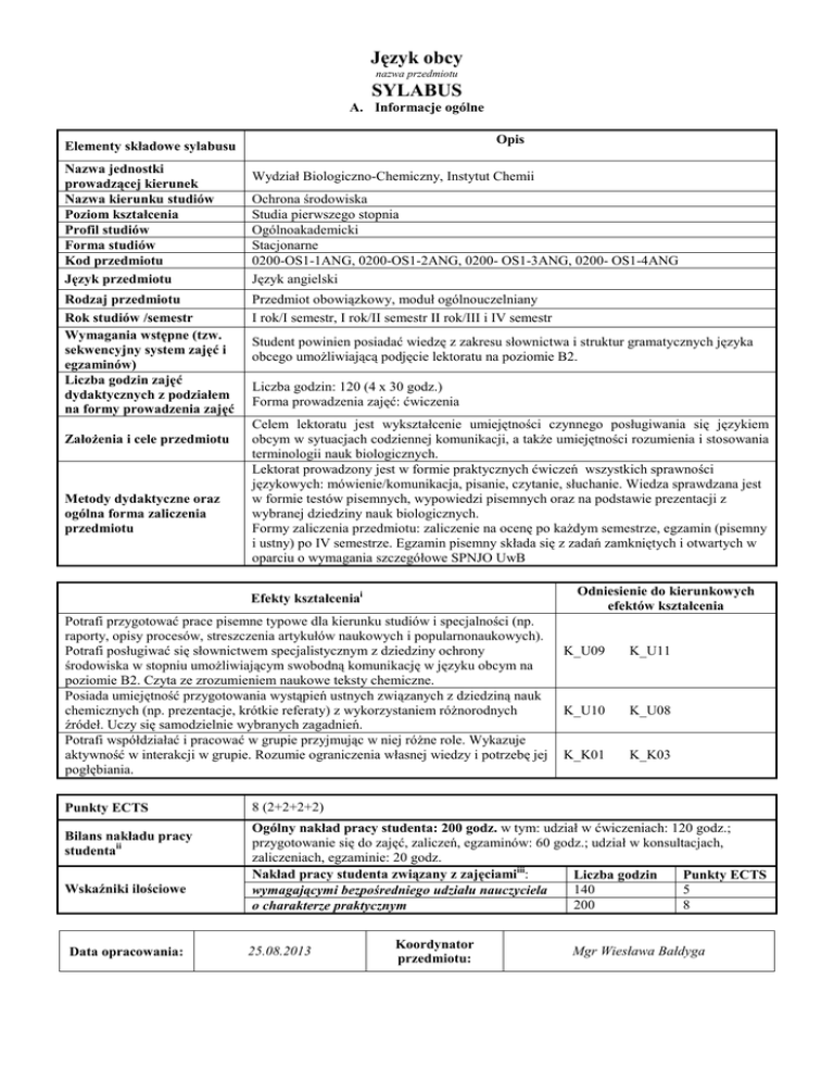 Język obcy nazwa przedmiotu SYLABUS A. Informacje ogólne Opis Elementy składowe sylabusu Nazwa jednostki prowadzącej kierunek Nazwa kierunku studiów Poziom kształcenia Profil studiów Forma studiów Kod przedmiotu Język przedmiotu Rodzaj przedmiotu Rok studiów /semestr Wymagania wstępne (tzw. sekwencyjny system zajęć i egzaminów) Liczba godzin zajęć dydaktycznych z podziałem na formy prowadzenia zajęć Założenia i cele przedmiotu Metody dydaktyczne oraz ogólna forma zaliczenia przedmiotu Wydział Biologiczno-Chemiczny, Instytut Chemii Ochrona środowiska Studia pierwszego stopnia Ogólnoakademicki Stacjonarne 0200-OS1-1ANG, 0200-OS1-2ANG, 0200- OS1-3ANG, 0200- OS1-4ANG Język angielski Przedmiot obowiązkowy, moduł ogólnouczelniany I rok/I semestr, I rok/II semestr II rok/III i IV semestr Student powinien posiadać wiedzę z zakresu słownictwa i struktur gramatycznych języka obcego umożliwiającą podjęcie lektoratu na poziomie B2. Liczba godzin: 120 (4 x 30 godz.) Forma prowadzenia zajęć: ćwiczenia Celem lektoratu jest wykształcenie umiejętności czynnego posługiwania się językiem obcym w sytuacjach codziennej komunikacji, a także umiejętności rozumienia i stosowania terminologii nauk biologicznych. Lektorat prowadzony jest w formie praktycznych ćwiczeń wszystkich sprawności językowych: mówienie/komunikacja, pisanie, czytanie, słuchanie. Wiedza sprawdzana jest w formie testów pisemnych, wypowiedzi pisemnych oraz na podstawie prezentacji z wybranej dziedziny nauk biologicznych. Formy zaliczenia przedmiotu: zaliczenie na ocenę po każdym semestrze, egzamin (pisemny i ustny) po IV semestrze. Egzamin pisemny składa się z zadań zamkniętych i otwartych w oparciu o wymagania szczegółowe SPNJO UwB Odniesienie do kierunkowych efektów kształcenia Efekty kształceniai Potrafi przygotować prace pisemne typowe dla kierunku studiów i specjalności (np. raporty, opisy procesów, streszczenia artykułów naukowych i popularnonaukowych). Potrafi posługiwać się słownictwem specjalistycznym z dziedziny ochrony środowiska w stopniu umożliwiającym swobodną komunikację w języku obcym na poziomie B2. Czyta ze zrozumieniem naukowe teksty chemiczne. Posiada umiejętność przygotowania wystąpień ustnych związanych z dziedziną nauk chemicznych (np. prezentacje, krótkie referaty) z wykorzystaniem różnorodnych źródeł. Uczy się samodzielnie wybranych zagadnień. Potrafi współdziałać i pracować w grupie przyjmując w niej różne role. Wykazuje aktywność w interakcji w grupie. Rozumie ograniczenia własnej wiedzy i potrzebę jej pogłębiania. Punkty ECTS Bilans nakładu pracy studentaii Wskaźniki ilościowe Data opracowania: K_U09 K_U11 K_U10 K_U08 K_K01 K_K03 8 (2+2+2+2) Ogólny nakład pracy studenta: 200 godz. w tym: udział w ćwiczeniach: 120 godz.; przygotowanie się do zajęć, zaliczeń, egzaminów: 60 godz.; udział w konsultacjach, zaliczeniach, egzaminie: 20 godz. Nakład pracy studenta związany z zajęciamiiii: Liczba godzin Punkty ECTS 140 5 wymagającymi bezpośredniego udziału nauczyciela 200 8 o charakterze praktycznym 25.08.2013 Koordynator przedmiotu: Mgr Wiesława Bałdyga SYLABUS B. Informacje szczegółowe Elementy składowe sylabusu Nazwa przedmiotu Kod przedmiotu Nazwa kierunku Nazwa jednostki prowadzącej kierunek Język przedmiotu Rok studiów/ semestr Liczba godzin zajęć dydaktycznych oraz forma prowadzenia zajęć Prowadzący Treści merytoryczne przedmiotu Efekty kształcenia wraz ze sposobem ich weryfikacji Opis Język obcy 0200-OS1-1ANG, 0200-OS1-2ANG, 0200-OS1-3ANG, 0200-OS1-4ANG Ochrona Środowiska Wydział Biologiczno-Chemiczny, Instytut Chemii Język angielski I rok/I semestr, I rok/II semestr II rok/III i IV semestr Liczba godzin: 120 (4 x 30 godz.) Forma prowadzenia zajęć: ćwiczenia Mgr Wiesława Bałdyga, Mgr Anna Kuzia Tematyka ogólna: 1. Przedstawianie się: rodzina, ukończona szkoła, zainteresowania; powody i oczekiwania dotyczące nauki języka obcego. 2. Studia: moja uczelnia, nazwy wydziałów i kierunków, stopnie naukowe; organizacja roku akademickiego, system rekrutacji na studia; wynajmowanie mieszkania. 3. Rodzina i przyjaciele: relacje w rodzinie i różne modele rodziny; nawiązywanie relacji – etapy; cechy przyjaciela, współlokatora. 4. Praca: stanowiska pracy, formy zatrudnienia, staranie się o pracę; rozmowa kwalifikacyjna; przebieg kariery. 5. Czas wolny: restauracja, kino, muzyka, sport; zakupy. 6. Podróże: różne środki transportu, podróż samolotem – odprawa celna i paszportowa; podróże wakacyjne i podróż służbowa (rezerwacja hotelu, meldowanie się). 7. Media i środki komunikacji: prasa, radio, telewizja, internet, bieżące wydarzenia w kraju i na świecie; telefonowanie. 8. Problemy współczesnego świata (problemy społeczne, katastrofy naturalne), sposoby ich rozwiązywania, przeciwdziałanie. 9. Edukacja: system szkolnictwa w Polsce i Wielkiej Brytanii oraz USA; różne typy szkół i nazwy przedmiotów. 10. Pisanie: CV, list motywacyjny, e-mail do przyjaciela, list nieformalny (np. zaproszenie, odpowiedź na zaproszenie), list formalny (np. list reklamacyjny). Zagadnienia specjalistyczne: 1.Podstawowe słownictwo związane z chemią, procesami chemicznymi, 2. Laboratorium – podstawowy sprzęt i metody pracy laboratoryjnej. 3.Nazwy pierwiastków, związków chemicznych 4..Podstawowe słownictwo związane z ochroną przyrody. 5. Graficzne środki przekazu informacji naukowej (tabele, wykresy, symbole, pierwiastki, związki). 6.Referat, wykład, dyskusja, prezentacja – umiejętność ustnego przekazania wiedzy specjalistycznej. 7.Wybrane zagadnienia z dziedziny ochrony przyrody: Lokalne i globalne zmiany w środowisku : zanieczyszczenie wody, powietrza, gleby; efekt cieplarniany, dziura ozonowa; zanieczyszczenia w środowisku i ich wpływ na zdrowie człowieka; klasyfikacja, rozprzestrzenianie, wpływ na środowisko i organizmy żywe, utyl