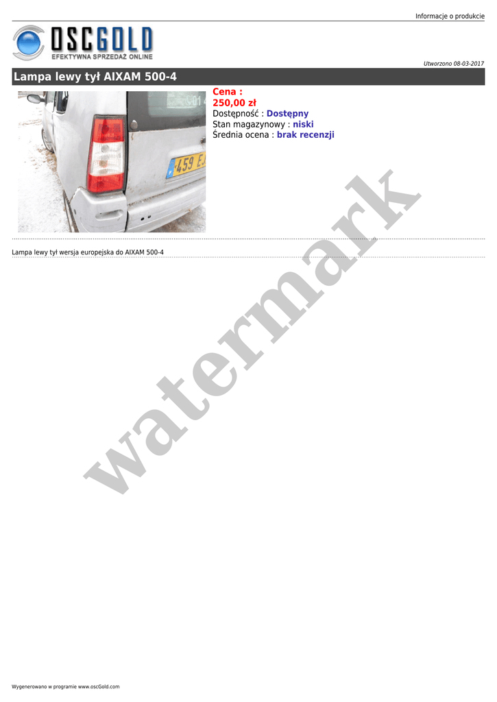 Informacje o produkcie Utworzono 08-03-2017 Lampa lewy tył AIXAM 500-4 Cena : 250,00 zł er m ar k Dostępność : Dostępny Stan magazynowy : niski Średnia ocena : brak recenzji w at Lampa lewy tył wersja europejska do AIXAM 500-4 Wygenerowano w programie www.oscGold.com