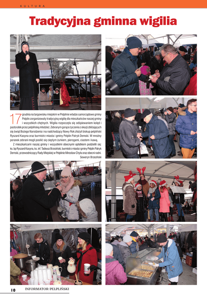 K U L T U R A Tradycyjna gminna wigilia 17 grudnia na targowisku miejskim w Pelplinie władze samorządowe gminy Pelplin zorganizowały tradycyjną wigilię dla mieszkańców naszej gminy i wszystkich chętnych. Wigilia rozpoczęła się odśpiewaniem kolęd i pastorałek przez pelplińską młodzież. Zebranym gorące życzenia z okazji zbliżających się świąt Bożego Narodzenia i na nadchodzący Nowy Rok złożyli biskup pelpliński Ryszard Kasyna oraz burmistrz miasta i gminy Pelplin Patryk Demski. W mroźny poranek zebrani mogli posilić się ciepłym żurkiem, pierogami, ciastem i kawą. Z mieszkańcami naszej gminy i wszystkimi obecnymi opłatkiem podzielili się: ks. bp Ryszard Kasyna, ks. inf. Tadeusz Brzeziński, burmistrz miasta i gminy Pelplin Patryk Demski, przewodniczący Rady Miejskiej w Pelplinie Mirosław Chyła oraz obecni radni. Seweryn Brzeziński 10 INFORMATOR PELPLIŃSKI