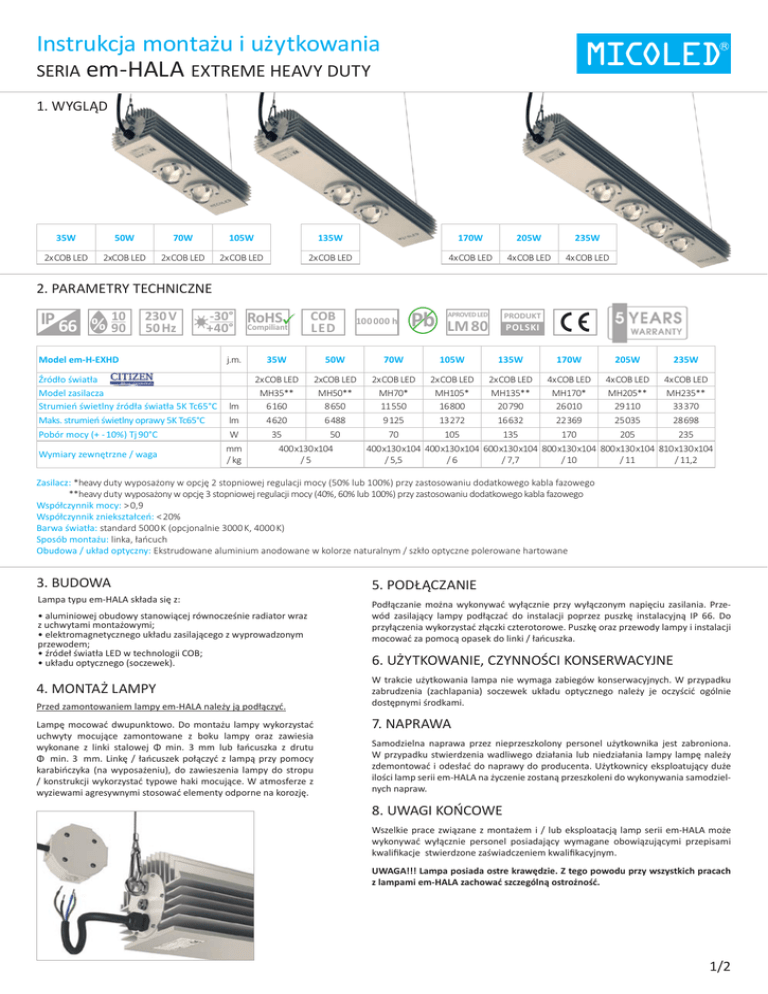 Instrukcja montażu i użytkowania SERIA em-HALA EXTREME HEAVY DUTY 1. WYGLĄD 35W 50W 70W 105W 135W 170W 205W 235W 2x COB LED 2xCOB LED 2x COB LED 2x COB LED 2x COB LED 4x COB LED 4x COB LED 4x COB LED 2. PARAMETRY TECHNICZNE 10 IP 66 % 90 230 V 50 Hz -30° RoHS +40° Compiliant Model em-H-EXHD Źródło światła Model zasilacza Strumień świetlny źródła światła 5K Tc65°C Maks. strumień świetlny oprawy 5K Tc65°C Pobór mocy (+ - 10%) Tj 90°C Wymiary zewnętrzne / waga COB LED 100 000 h Pb APROVED LED PRODUKT LM 80 POLSKI j.m. 35W 50W 70W 105W 135W 170W 205W 235W lm lm W 2x COB LED MH35** 6 160 4 620 35 2xCOB LED MH50** 8 650 6 488 50 2x COB LED MH70* 11 550 9 125 70 2x COB LED MH105* 16 800 13 272 105 2x COB LED MH135** 20 790 16 632 135 4x COB LED MH170* 26 010 22 369 170 4x COB LED MH205** 29 110 25 035 205 4x COB LED MH235** 33 370 28 698 235 mm / kg 400 x130 x104 / 5 400 x130 x104 400 x130 x104 600 x130 x104 800 x130 x104 800 x130 x104 810 x130 x104 / 5,5 / 6 / 7,7 / 10 / 11 / 11,2 Zasilacz: *heavy duty wyposażony w opcję 2 stopniowej regulacji mocy (50% lub 100%) przy zastosowaniu dodatkowego kabla fazowego **heavy duty wyposażony w opcję 3 stopniowej regulacji mocy (40%, 60% lub 100%) przy zastosowaniu dodatkowego kabla fazowego Współczynnik mocy: > 0,9 Współczynnik zniekształceń: < 20% Barwa światła: standard 5000 K (opcjonalnie 3000 K, 4000 K) Sposób montażu: linka, łańcuch Obudowa / układ optyczny: Ekstrudowane aluminium anodowane w kolorze naturalnym / szkło optyczne polerowane hartowane 3. BUDOWA Lampa typu em-HALA składa się z: • aluminiowej obudowy stanowiącej równocześnie radiator wraz z uchwytami montażowymi; • elektromagnetycznego układu zasilającego z wyprowadzonym przewodem; • źródeł światła LED w technologii COB; • układu optycznego (soczewek). 4. MONTAŻ LAMPY Przed zamontowaniem lampy em-HALA należy ją podłączyć. Lampę mocować dwupunktowo. Do montażu lampy wykorzystać uchwyty mocujące zamontowane z boku lampy oraz zawiesia wykonane z linki stalowej Φ min. 3 mm lub łańcuszka z drutu Φ min. 3 mm. Linkę / łańcuszek połączyć z lampą przy pomocy karabińczyka (na wyposażeniu), do zawieszenia lampy do stropu / konstrukcji wykorzystać typowe haki mocujące. W atmosferze z wyziewami agresywnymi stosować elementy odporne na korozję. 5. PODŁĄCZANIE Podłączanie można wykonywać wyłącznie przy wyłączonym napięciu zasilania. Przewód zasilający lampy podłączać do instalacji poprzez puszkę instalacyjną IP 66. Do przyłączenia wykorzystać złączki czterotorowe. Puszkę oraz przewody lampy i instalacji mocować za pomocą opasek do linki / łańcuszka. 6. UŻYTKOWANIE, CZYNNOŚCI KONSERWACYJNE W trakcie użytkowania lampa nie wymaga zabiegów konserwacyjnych. W przypadku zabrudzenia (zachlapania) soczewek układu optycznego należy je oczyścić ogólnie dostępnymi środkami. 7. NAPRAWA Samodzielna naprawa przez nieprzeszkolony personel użytkownika jest zabroniona. W przypadku stwierdzenia wadliwego działania lub niedziałania lampy lampę należy zdemontować i odesłać do naprawy do producenta. Użytkownicy eksploatujący duże ilości lamp serii em-HALA na życzenie zostaną przeszkoleni do wykonywania samodzielnych napraw. 8. UWAGI KOŃCOWE Wszelkie prace związane z montażem i / lub eksploatacją lamp serii em-HALA może wykonywać wyłącznie personel posiadający wymagane obowiązującymi przepisami kwalifikacje stwierdzone zaświadczeniem kwalifikacyjnym. UWAGA!!! Lampa posiada ostre krawędzie. Z tego powodu przy wszystkich pracach z lampami em-HALA zachować szczególną ostrożność. 1/2 9. STEROWANIE Lampy MICOLED posiadają zintegrowany układ zasilający, składający się z dwóch równolegle działających układów elektromagnetycznych. W modelach 35W, 50W, 135W, 205W i 235W jeden zasilacz dostarcza 40% mocy (brązowy przewód zasilający), a drugi 60% mocy (czarny przewód zasilający). Poprzez podłączenie napięcia prądu zmiennego o wartości 230 V do jednego z dwóch przewodów zasilających uzyskujemy efekt w postaci zmiany strumienia świetlnego i w konsekwencji zmiany natężenia oświetlenia w stopniach 0%-40%-60%. Podłączenie dwóch przewodów jedocześnie powoduje działanie lampy na 100% mocy. W pozostałych modelach 70W, 105W i 170W jeden i drugi zasilacz dostarcza po 50% mocy. Poprzez podłączenie napięcia prądu zmiennego o wartości 230 V do jednego z dwóch przewodów zasilających oznaczonych kolorem brązowym lub czarnym uzyskujemy efekt w postaci zmiany strumienia świetlnego i w konsekwencji zmiany natężenia oświetlenia w stopniach 0%-50%. Podłączenie dwóch przewodów jedocześnie powoduje działanie lampy na 100% mocy. Należy pamiętać, że układy te zasilane są z jednej fazy! Poprawność podłączenia do zasilania wymaga dołączenia przewodu o potencjale neutralnym do żyły oznaczonej kolorem niebieskim a także dla zachowania ochrony przeciwporażeniowej należy podłączyć przewód uziemiający PE do przewodu ochronnego PE w oprawie, oznaczonego kolorem żółtozielonym. Schemat sterowania za pomocą zegara astronomicznego 10. CHARAKTERYSTYKA LAMP MICOLED Wrocławska firma MICOLED produkuje energooszczędne, przyjazne środowisku lampy LED przystosowane do montażu na zewnątrz jak i wewnątrz obiektów. Są to lampy o mocach od 35W do 235W przeznaczone zarówno dla odbiorcy instytucjonalnego, posiadającego niezbędne służby eksploatacyjne, jak i dla odbiorcy niezajmującego się profesjonalną eksploatacją oświetlenia. Lampy powstały dzięki wieloletnim doświadczeniom w projektowaniu różnych systemów automatyki i energoelektroniki, w tym zaawansowanych systemów świetlnych wykorzystujących transmisję danych po sieci energetycznej w celu kontroli pracy wysokoprężnych źródeł sodowych i metahalogenowych. Przy projektowaniu lamp LED postawiliśmy na prostotę, funkcjonalność i oszczędność. W podstawowe