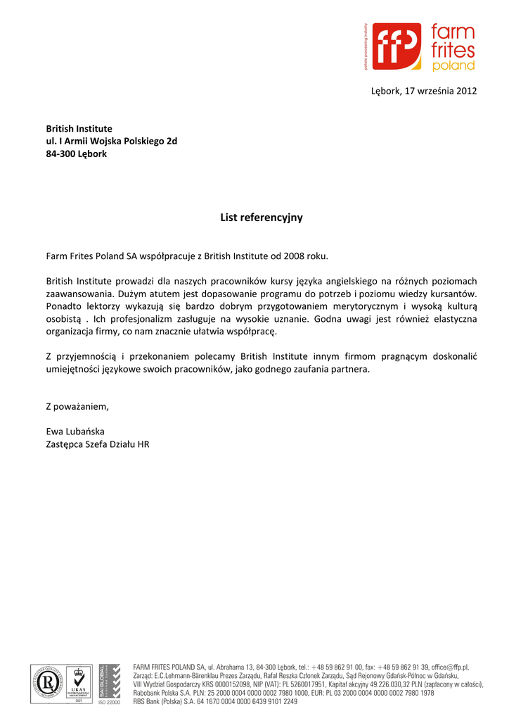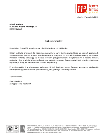 Lębork, 17 września 2012 British Institute ul. I Armii Wojska Polskiego 2d 84-300 Lębork List referencyjny Farm Frites Poland SA współpracuje z British Institute od 2008 roku. British Institute prowadzi dla naszych pracowników kursy języka angielskiego na różnych poziomach zaawansowania. Dużym atutem jest dopasowanie programu do potrzeb i poziomu wiedzy kursantów. Ponadto lektorzy wykazują się bardzo dobrym przygotowaniem merytorycznym i wysoką kulturą osobistą . Ich profesjonalizm zasługuje na wysokie uznanie. Godna uwagi jest również elastyczna organizacja firmy, co nam znacznie ułatwia współpracę. Z przyjemnością i przekonaniem polecamy British Institute innym firmom pragnącym doskonalić umiejętności językowe swoich pracowników, jako godnego zaufania partnera. Z poważaniem, Ewa Lubańska Zastępca Szefa Działu HR
