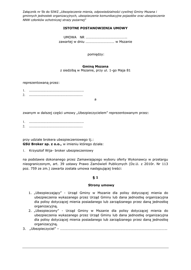 Załącznik nr 5b do SIWZ „Ubezpieczenie mienia, odpowiedzialności cywilnej Gminy Mszana i gminnych jednostek organizacyjnych, ubezpieczenie komunikacyjne pojazdów oraz ubezpieczenie NNW członków ochotniczej straży pożarnej” ISTOTNE POSTANOWIENIA UMOWY UMOWA NR ……………………………………….. zawartej w dniu …………………………… w Mszanie pomiędzy: Gminą Mszana z siedzibą w Mszanie, przy ul. 1-go Maja 81 reprezentowaną przez: ............................................... .............................................. a zwanym w dalszej części umowy „Ubezpieczycielem” reprezentowanym przez: ............................................... .............................................. przy udziale brokera ubezpieczeniowego tj.: GSU Broker sp. z o.o., w imieniu którego działa: Krzysztof Wija- broker ubezpieczeniowy na podstawie dokonanego przez Zamawiającego wyboru oferty Wykonawcy w przetargu nieograniczonym, art. 39 ustawy Prawo Zamówień Publicznych (Dz.U. z 2010r. Nr 113 poz. 759 ze zm.) zawarta została umowa następującej treści: §1 Strony umowy 1. „Ubezpieczający” - Urząd Gminy w Mszanie dla polisy dotyczącej mienia do ubezpieczenia wykazanego przez Urząd Gminy lub dana jednostkę organizacyjna dla polisy dotyczącej mienia posiadanego lub zarządzanego przez daną jednostkę organizacyjną. 2. „Ubezpieczony” - Urząd Gminy w Mszanie dla polisy dotyczącej mienia do ubezpieczenia wykazanego przez Urząd Gminy lub dana jednostkę organizacyjna dla polisy dotyczącej mienia posiadanego lub zarządzanego przez daną jednostkę organizacyjną. 3. „Ubezpieczyciel” – ………………………………………………………………………………………………………….. Załącznik nr 5b do SIWZ „Ubezpieczenie mienia, odpowiedzialności cywilnej Gminy Mszana i gminnych jednostek organizacyjnych, ubezpieczenie komunikacyjne pojazdów oraz ubezpieczenie NNW członków ochotniczej straży pożarnej” §2 Przedmiot umowy 1. Przedmiotem zamówienia jest: Ubezpieczenie komunikacyjne OC, AC, ASS i NNW dla pojazdów stanowiących własność lub użytkowanych przez Urząd Gminy w Mszanie i gminne jednostki organizacyjne okres na okres 01.01.2014r. – 31.12.2014r. Przedmiotem umowy są ubezpieczenia komunikacyjne: obowiązkowego ubezpieczenia odpowiedzialności cywilnej posiadaczy pojazdów mechanicznych za szkody powstałe w związku z ruchem tych pojazdów (OC i „Zielona Karta”), ubezpieczenia pojazdów autocasco (AC+KR) , ubezpieczenia komunikacyjnego Assistance, ubezpieczenie następstw nieszczęśliwych wypadków kierowców i pasażerów (NNW). dotyczących pojazdów podlegających rejestracji w Rzeczypospolitej Polskiej - stanowiące własność Ubezpieczającego lub użytkowanych przez Ubezpieczającego oraz jednostki organizacyjne Ubezpieczającego. 3. Wszelkie postanowienia niniejszej Umowy mają pierwszeństwo przed postanowieniami Ogólnych i Szczegółowych Warunków Ubezpieczenia. 4. Wykaz pojazdów przyjętych do ubezpieczenia stanowi Załącznik nr 4b do SIWZ. §3 Cena i warunki płatności 1. 2. 3. 4. 5. 6. 7. Wartość umowy wynosi: ………………………………………………………………………………………… (słownie 00/100). Wartość umowy do końca jej trwania nie podlega indeksacji. Poszczególne polisy wraz z potwierdzeniem zawarcia umowy ubezpieczenia zostaną zawarte na dany pojazd z okresem ubezpieczenia na 12 miesięcy, zgodnie z terminem ubezpieczenia dla każdego pojazdu wynikającym z Załącznika nr 4b do SIWZ. Ubezpieczyciel powiadomi w terminie nie później niż na 7 dni przed rozpoczęciem ochrony ubezpieczeniowej GSU Broker Sp. z o.o. o możliwości odbioru wszystkich polis na dany miesiąc wraz z potwierdzeniami zawarcia ubezpieczenia, które GSU Sp. z o.o. dostarczy Ubezpieczającemu do jego siedziby w Mszanie, ul. 1 Maja 81, w terminie nie później niż na 6 dni przed rozpoczęciem ochrony ubezpieczeniowej. Podstawą do zapłaty przez Ubezpieczonego będzie podpisana przez Ubezpieczającego polisa ubezpieczeniowa wystawiona na Urząd Gminy w Mszanie dla polisy dotyczącej mienia do ubezpieczenia wykazanego przez Urząd Gminy lub na daną jednostkę organizacyjną dla polisy dotyczącej mienia posiadanego lub zarządzanego przez daną jednostkę organizacyjną. Polisa wystawiona musi zawierać nr rachunku bankowego na który winna zostać przekazana składka ubezpieczeniowa przez Ubezpieczonego. Składka płatna jest jednorazowo w terminie 30 dni od daty zawarcia umowy ubezpieczenia przez Gminę Mszana. Załącznik nr 5b do SIWZ „Ubezpieczenie mienia, odpowiedzialności cywilnej Gminy Mszana i gminnych jednostek organizacyjnych, ubezpieczenie komunikacyjne pojazdów oraz ubezpieczenie NNW członków ochotniczej straży pożarnej” 8. W przypadku zapłaty należności w formie przelewu bankowego, Strony ustalają jako datę zapłaty przez Ubezpieczonego datę obciążenia rachunku bankowego Ubezpieczającego. 9. Należności wynikające z niniejszej umowy w tym odszkodowawcze i odsetkowe nie mogą być przedmiotem obrotu (cesja, sprzedaż), zgodnie z art. 509 KC, bez pisemnej zgody Ubezpieczonego. 10. Ubezpieczyciel odstąpi przy wystawianiu polis od stosowania tzn. składki minimalnej z tytułu zawarcia umowy ubezpieczenia. 11. Ubezpieczony nie wyraża zgody na obrót wierzytelnościami wynikającymi z niniejszej umowy oraz polis zawartych w skutek niniejszej umowy. §4 Zakres ochrony ubezpieczeniowej 1. Umowy ubezpieczenia zawierane będą w zakresie: a. obowiązkowego ubezpieczenia odpowiedzialności cywilnej posiadaczy pojazdów mechanicznych za szkody powstałe w związku z ruchem tych pojazdów (OC i „Zielona Karta”), b. ubezpieczenia pojazdów autocasco (AC+KR) , c. ubezpieczenia komunikacyjnego Assistance, d. ubezpieczenie następstw nieszczęśliwych wypadków kierowców i pasażerów (NNW). 2. Do umów ubezpieczenia za