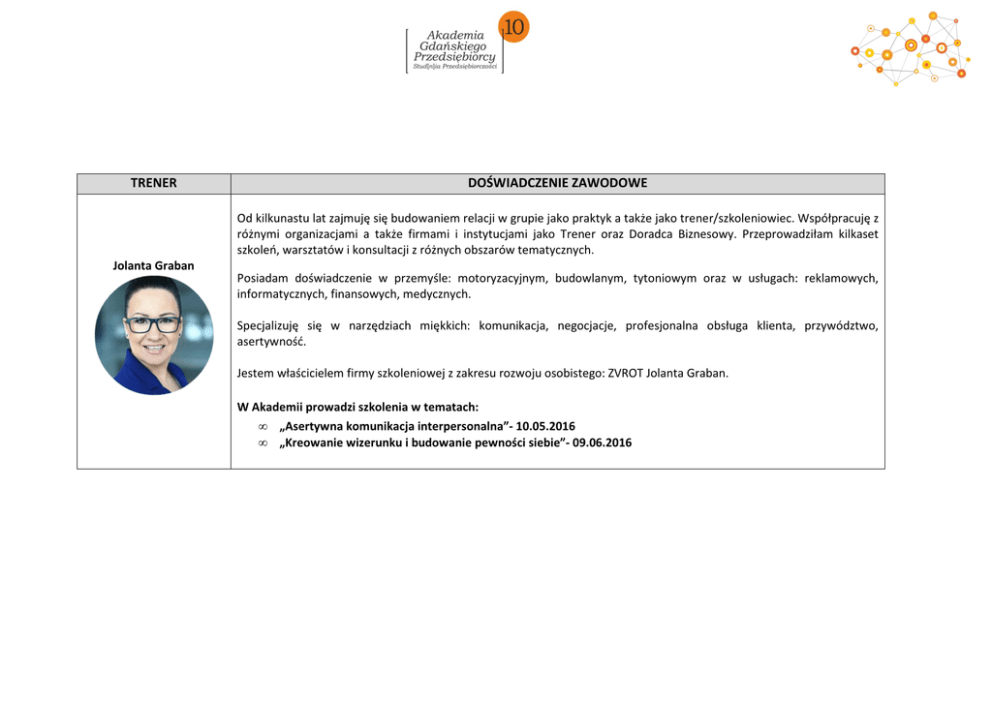 TRENER DOŚWIADCZENIE ZAWODOWE Od kilkunastu lat zajmuję się budowaniem relacji w grupie jako praktyk a także jako trener/szkoleniowiec. Współpracuję z różnymi organizacjami a także firmami i instytucjami jako Trener oraz Doradca Biznesowy. Przeprowadziłam kilkaset szkoleń, warsztatów i konsultacji z różnych obszarów tematycznych. Jolanta Graban Posiadam doświadczenie w przemyśle: motoryzacyjnym, budowlanym, tytoniowym oraz w usługach: reklamowych, informatycznych, finansowych, medycznych. Specjalizuję się w narzędziach miękkich: komunikacja, negocjacje, profesjonalna obsługa klienta, przywództwo, asertywność. Jestem właścicielem firmy szkoleniowej z zakresu rozwoju osobistego: ZVROT Jolanta Graban. W Akademii prowadzi szkolenia w tematach: • „Asertywna komunikacja interpersonalna”- 10.05.2016 • „Kreowanie wizerunku i budowanie pewności siebie”- 09.06.2016